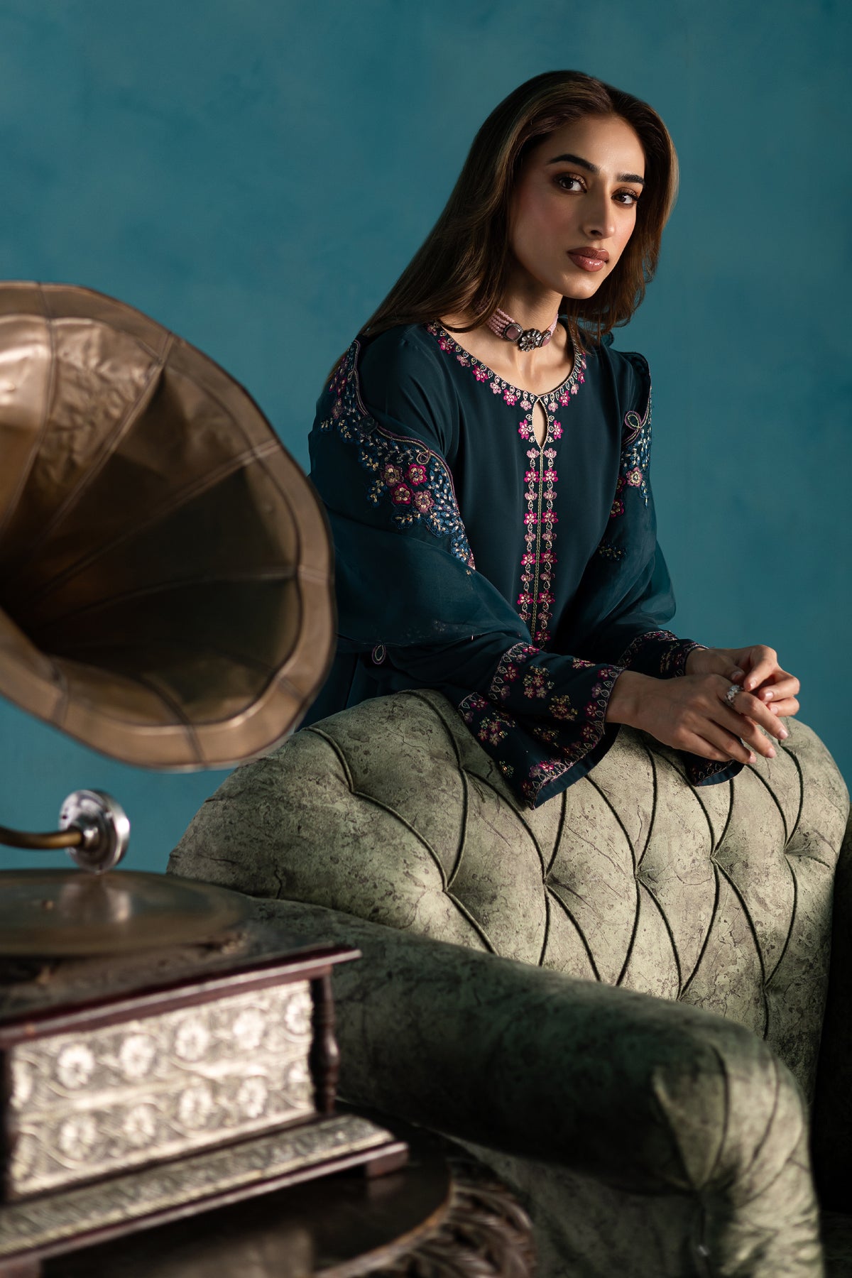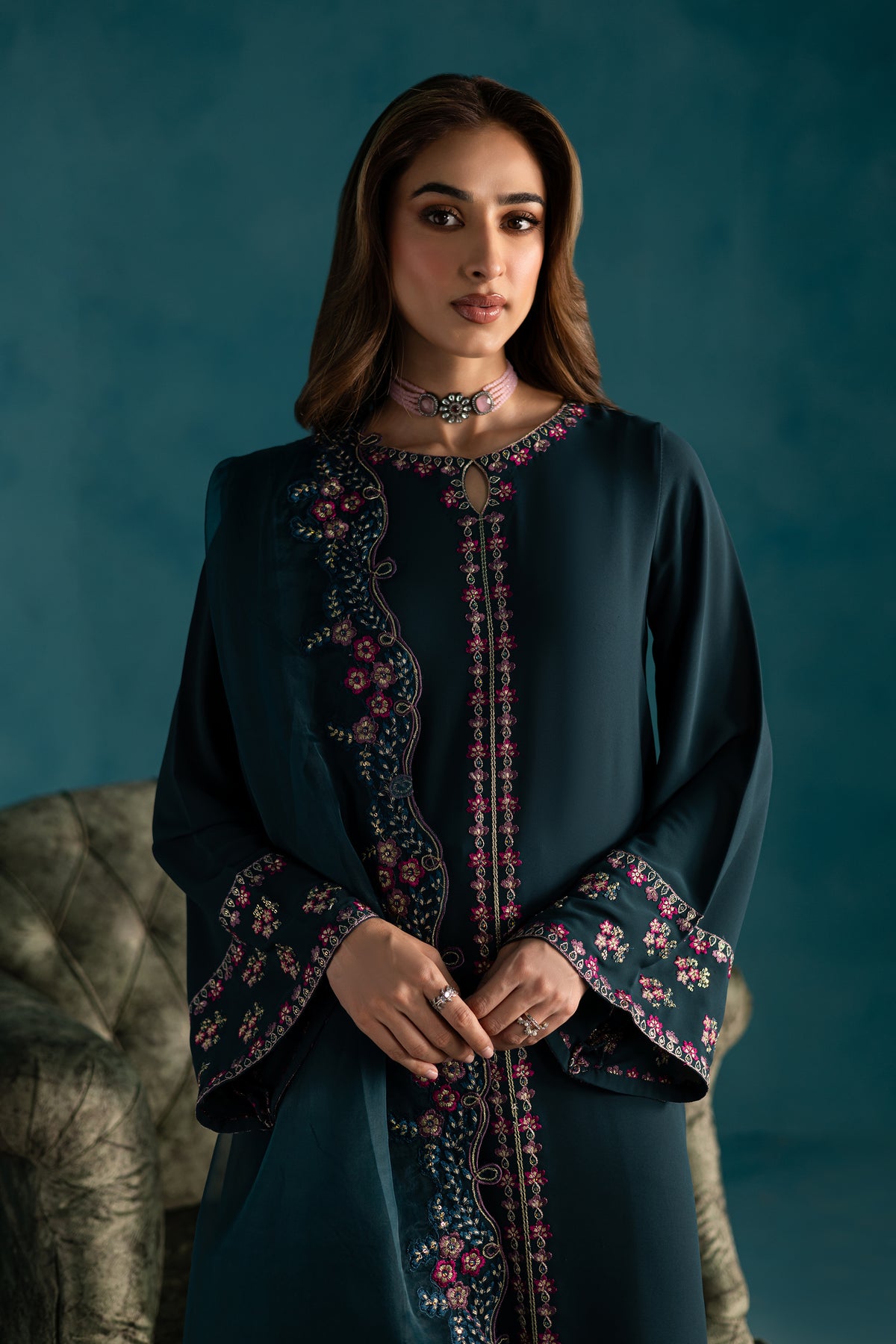 A two-panel teal long georgette shirt featuring an intricately embroidered keyhole neckline that adds a touch of timeless elegance. The loose sleeves are finished with embroidered borders at the cuff openings, lending a graceful and relaxed silhouette perfect for warmer days.
