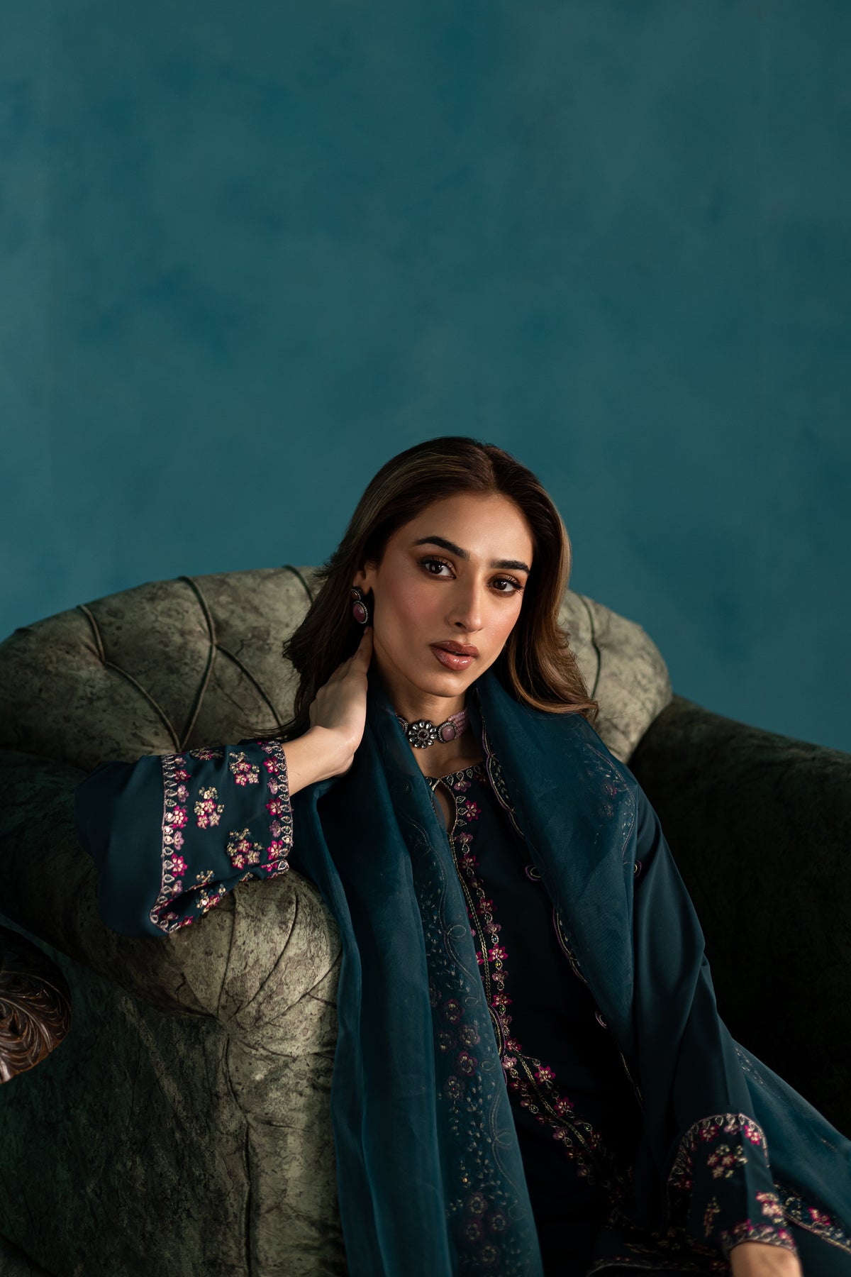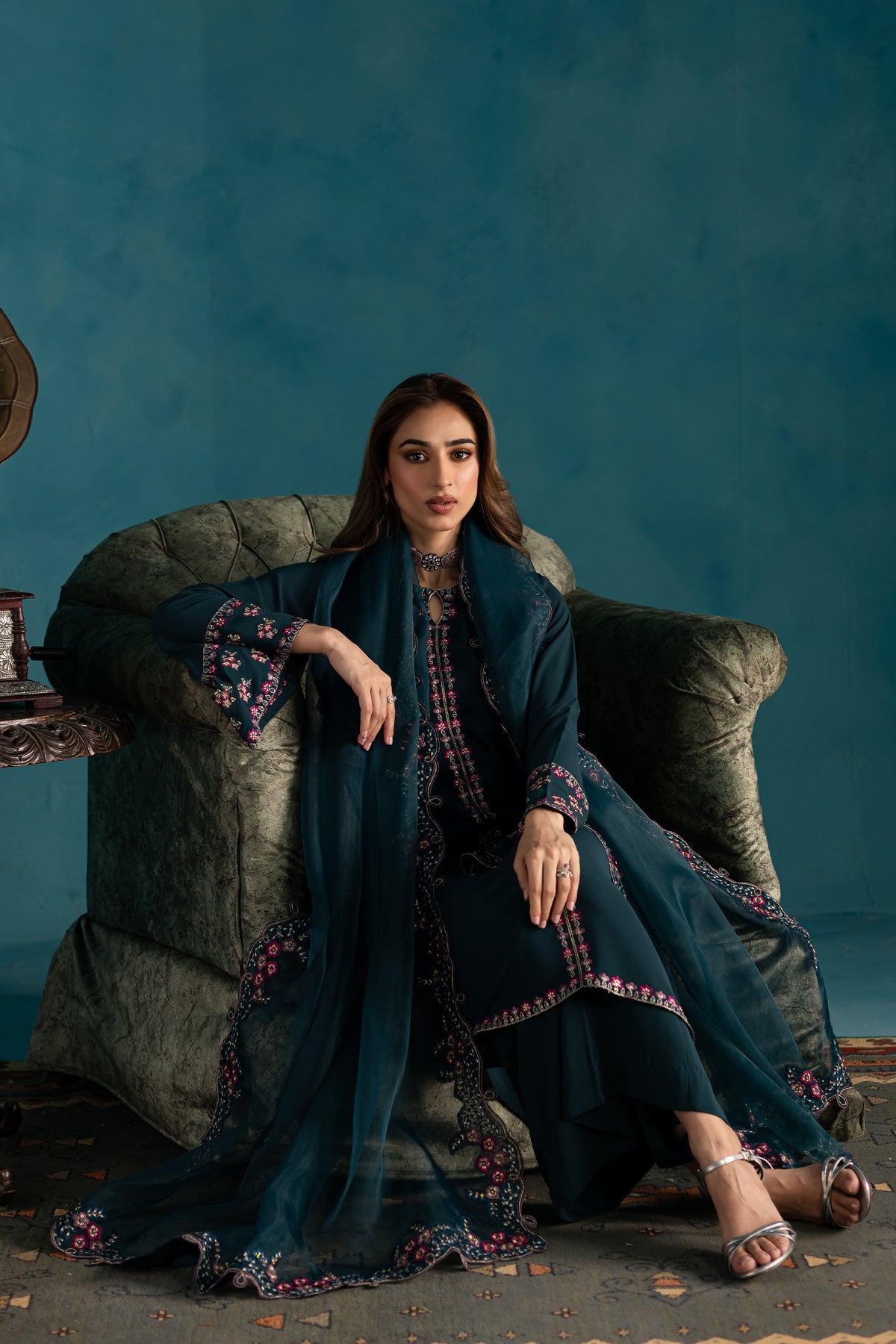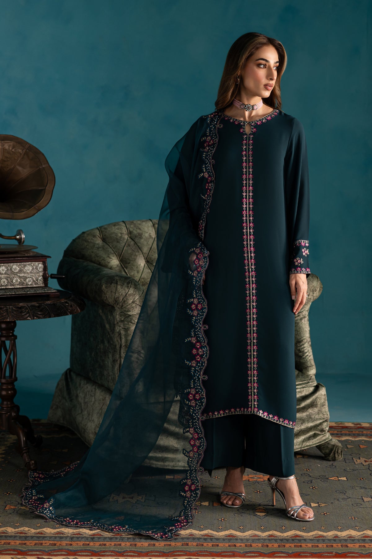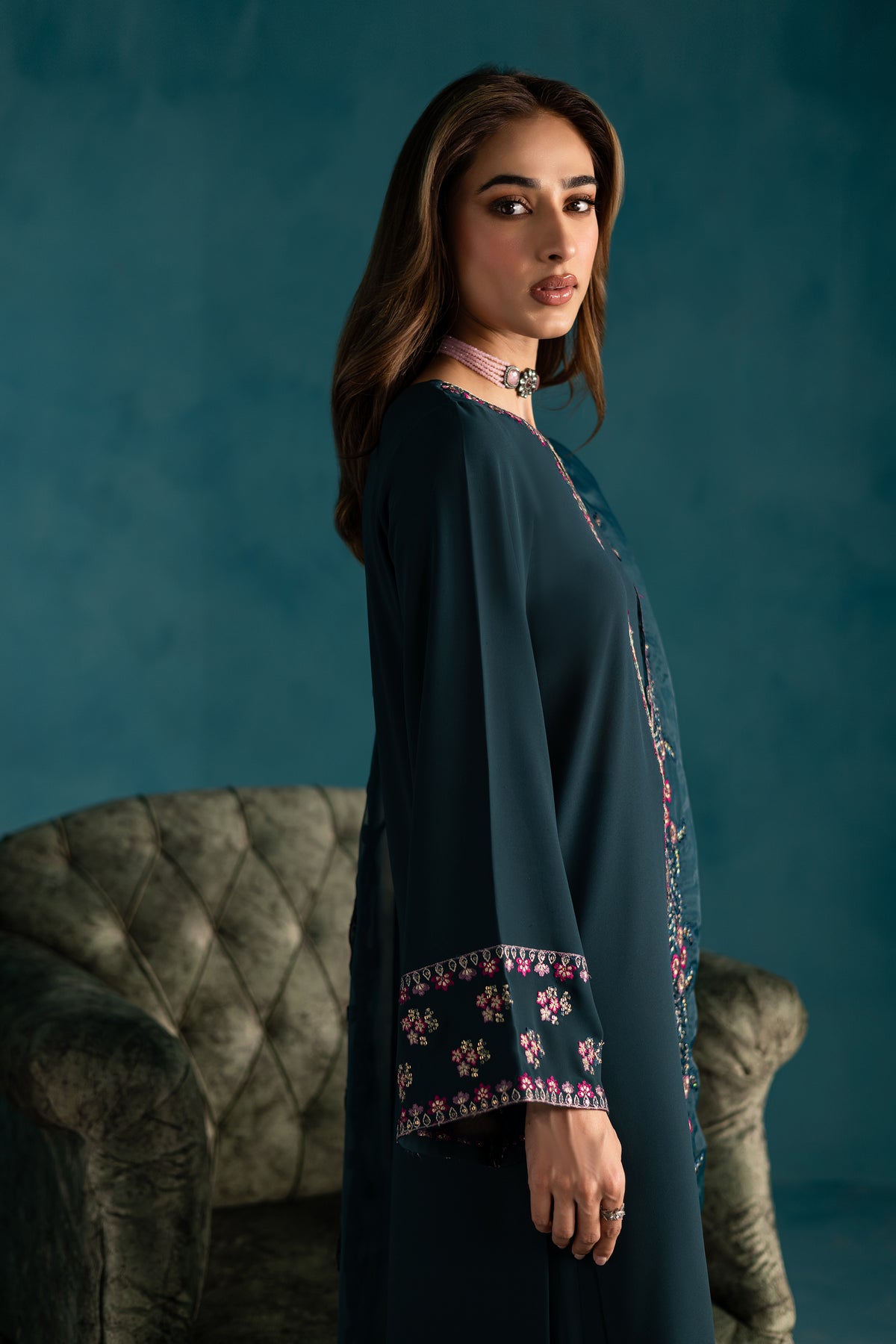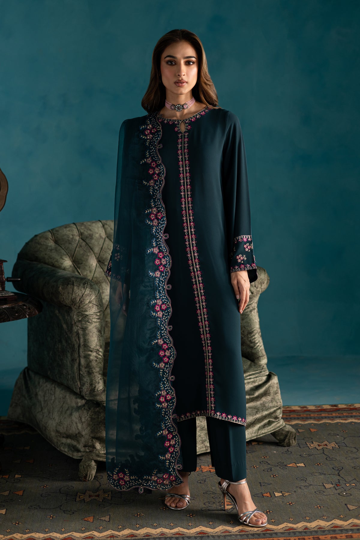The look is completed with an embroidered organza dupatta, adorned with delicate detailing and finished with elegant kavia edging, adding a soft, feminine finish to this graceful outfit.