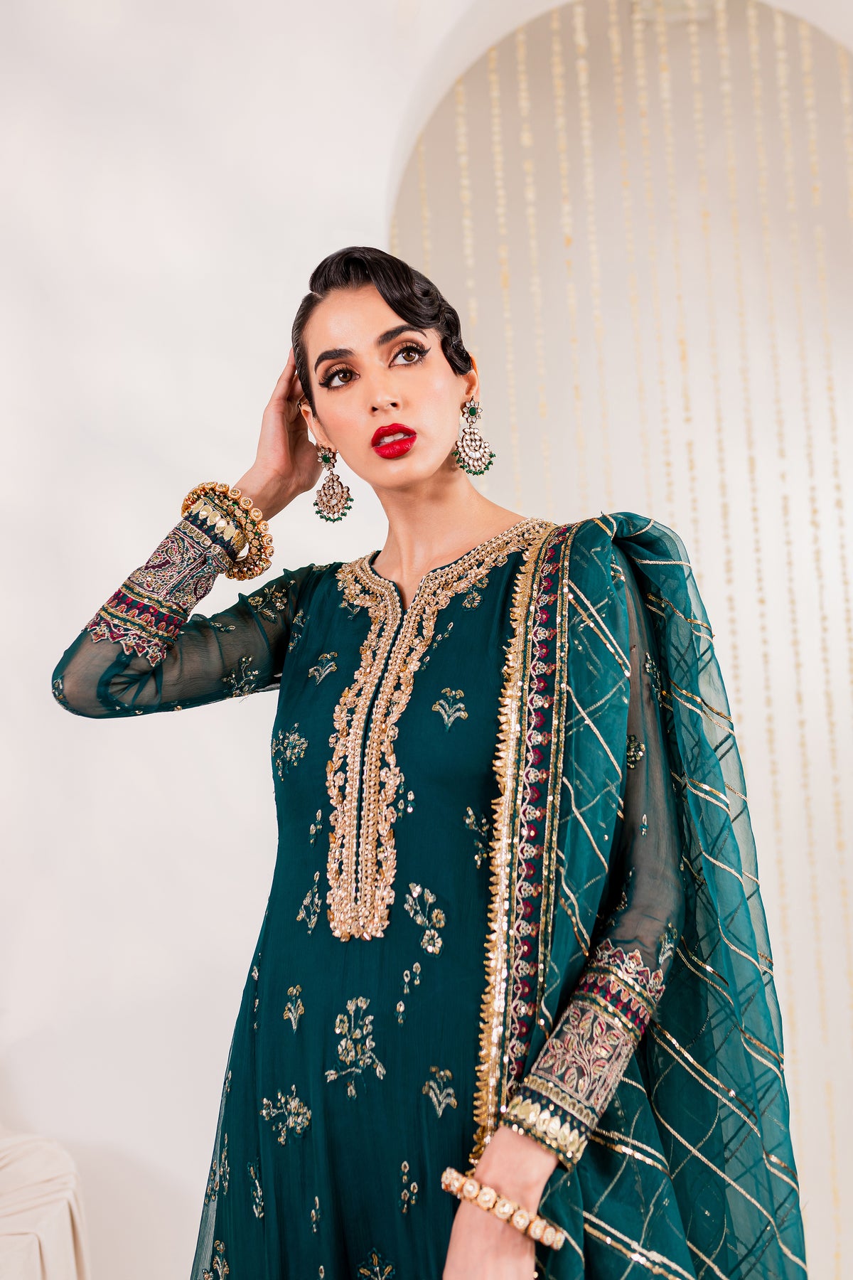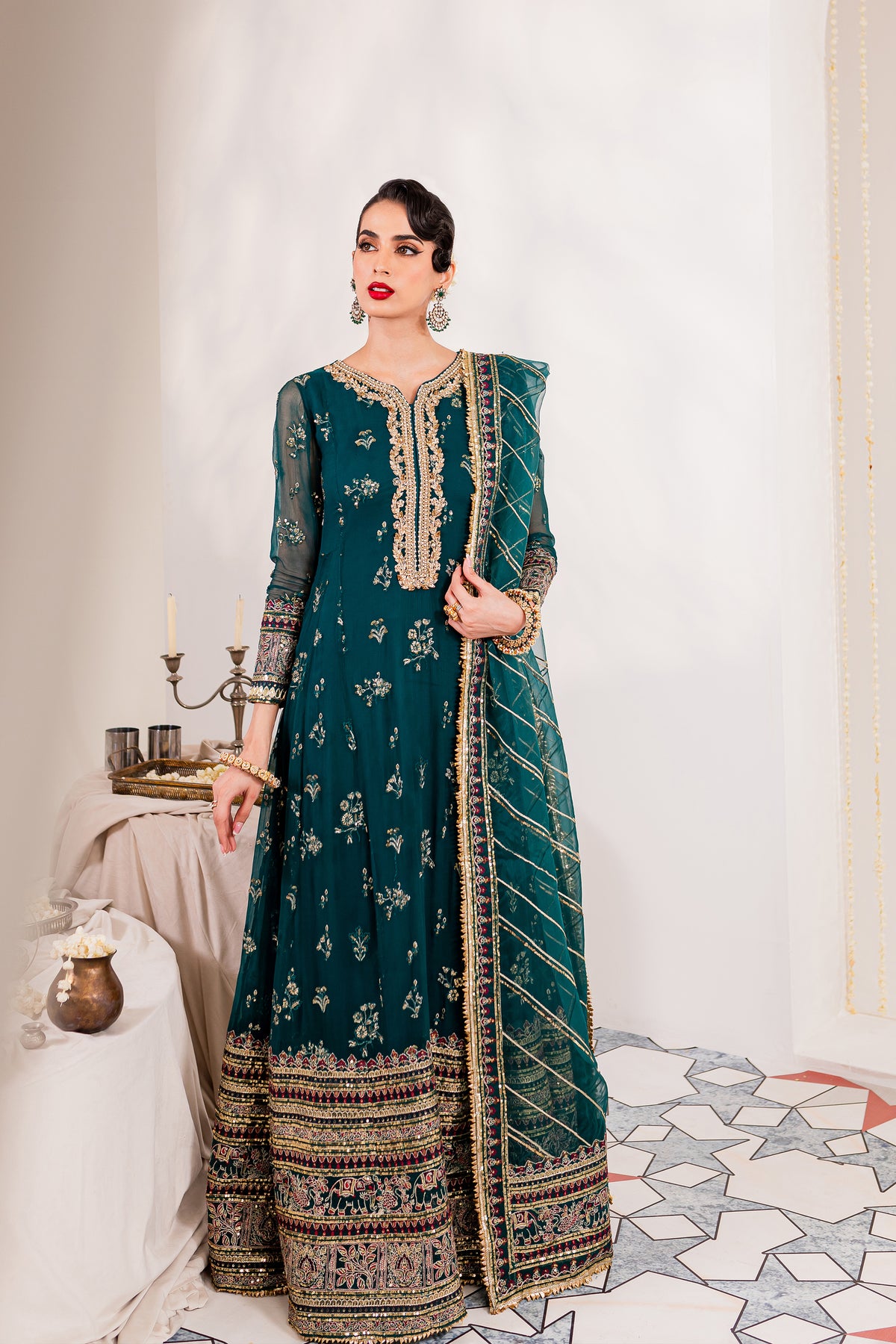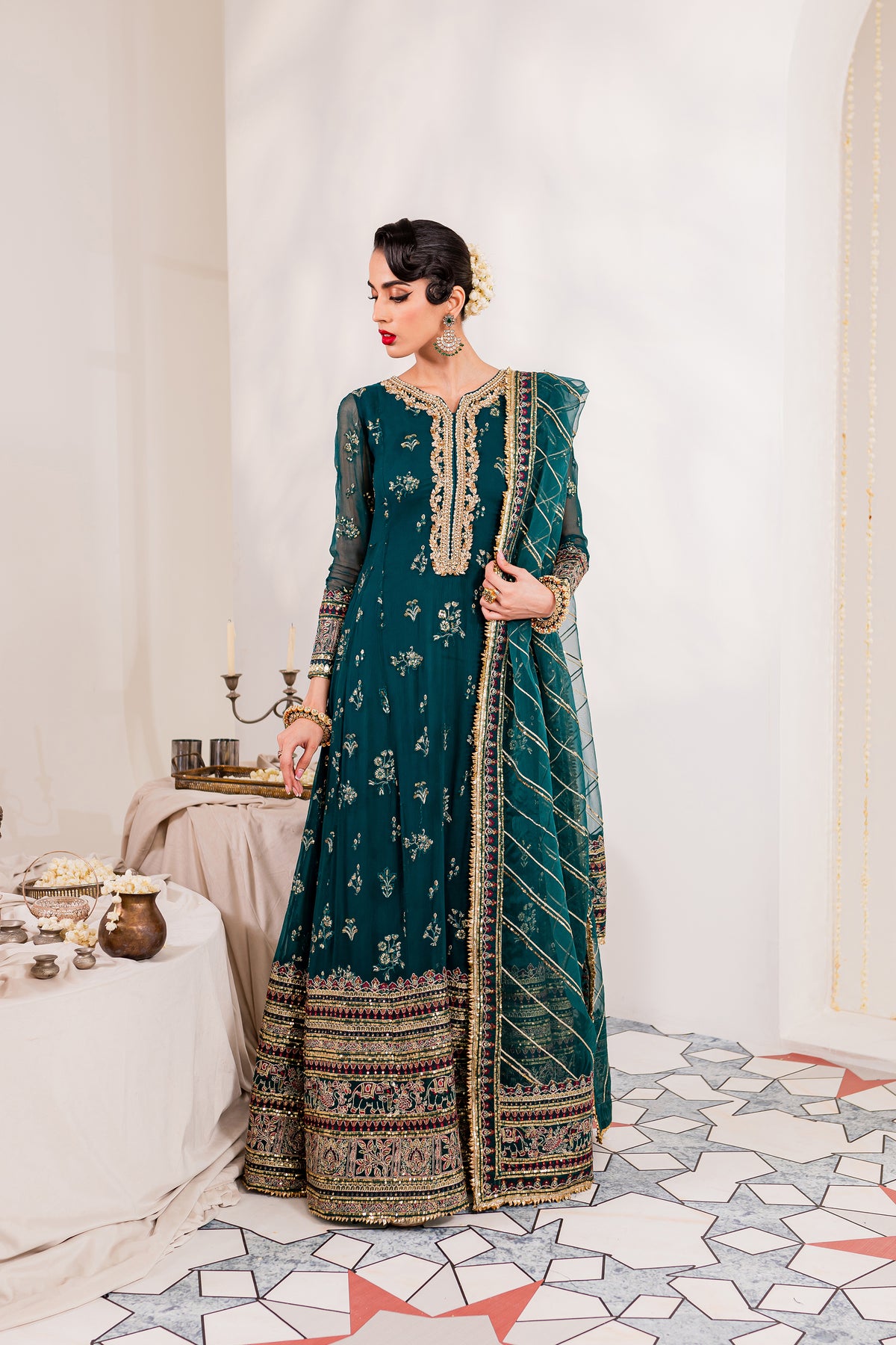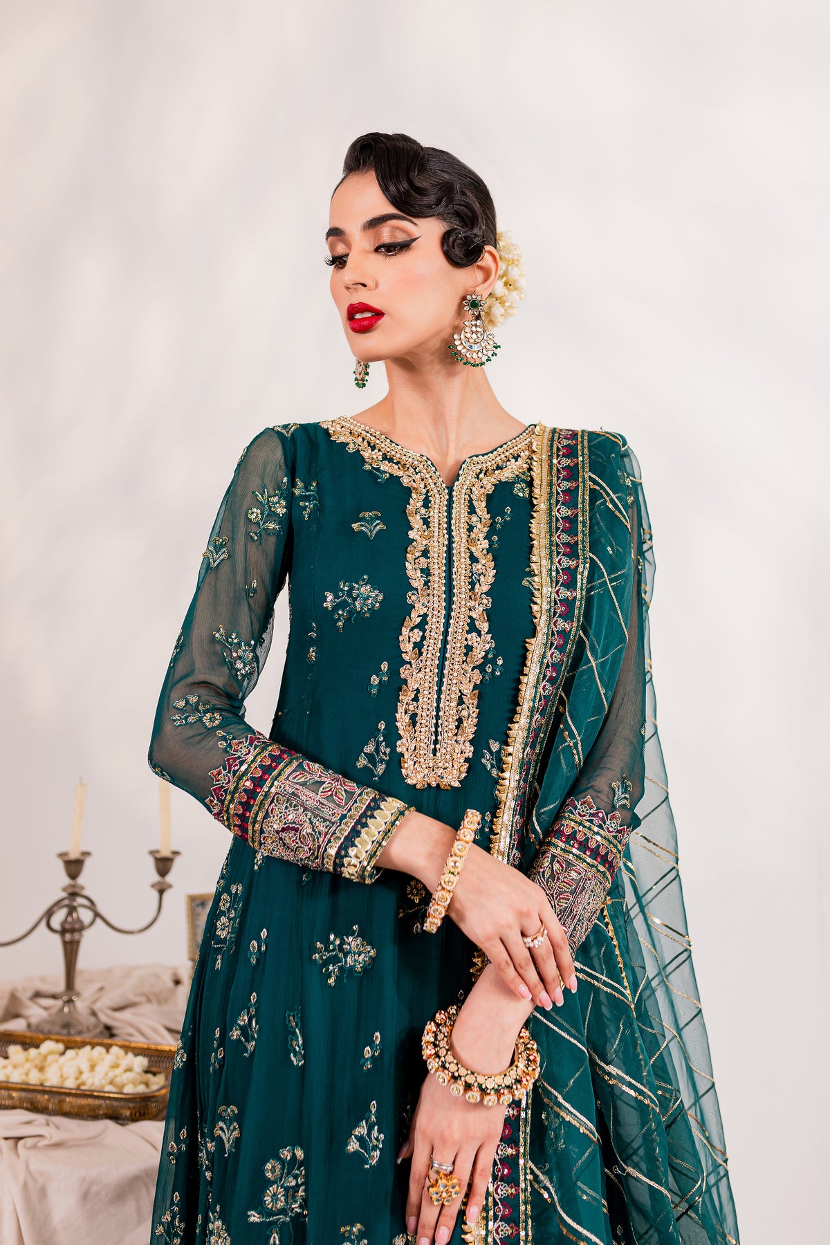 Gracefully designed paneled pishwas frock cut from the finest quality of crinkle chiffon in the shades of zinc. Embellishments feature beautifully embroidered panels and sleeves, neckline enhanced with direct adda work along with dabka, naqshi and pearl intricacies. Frock hem adorned in heavy organza borders with gota lace at finishing, adding the finesse to this flowy silhouette.
