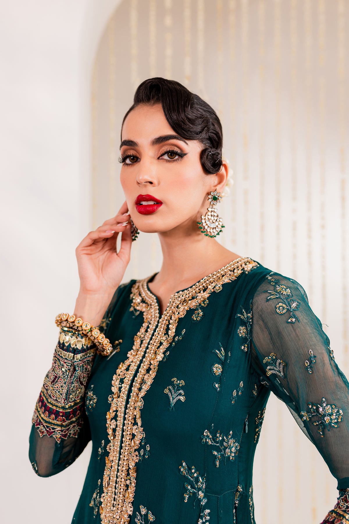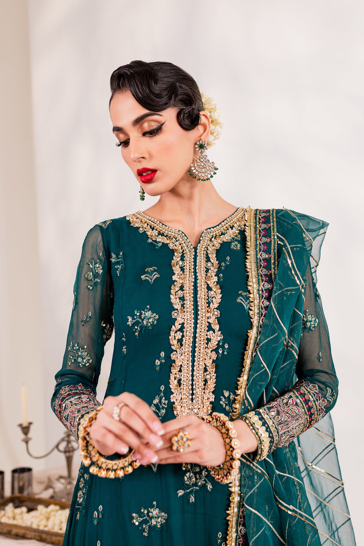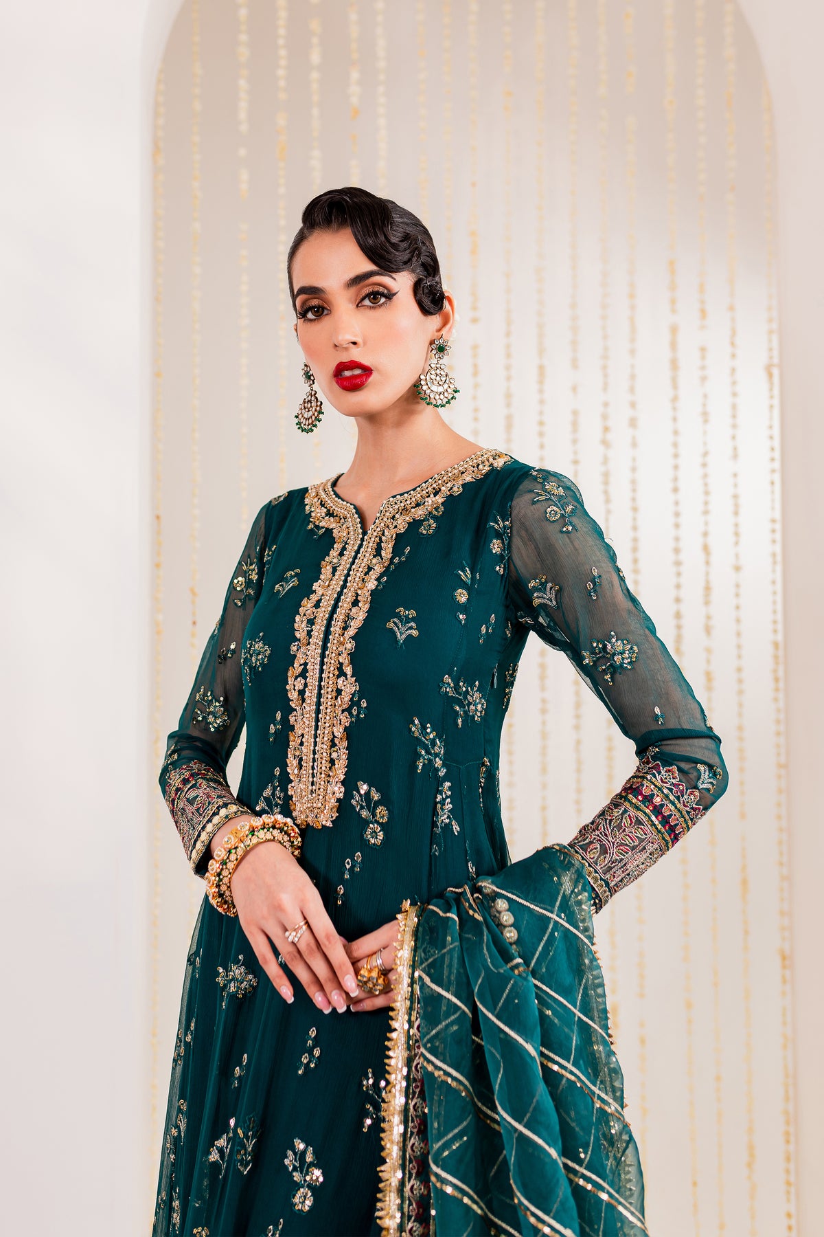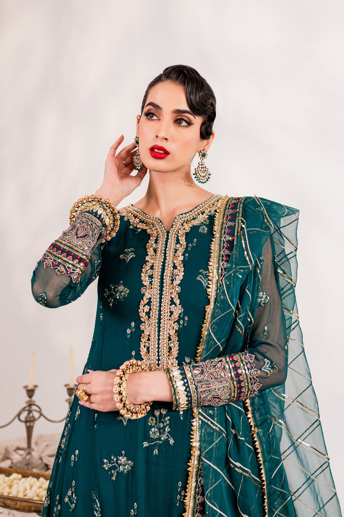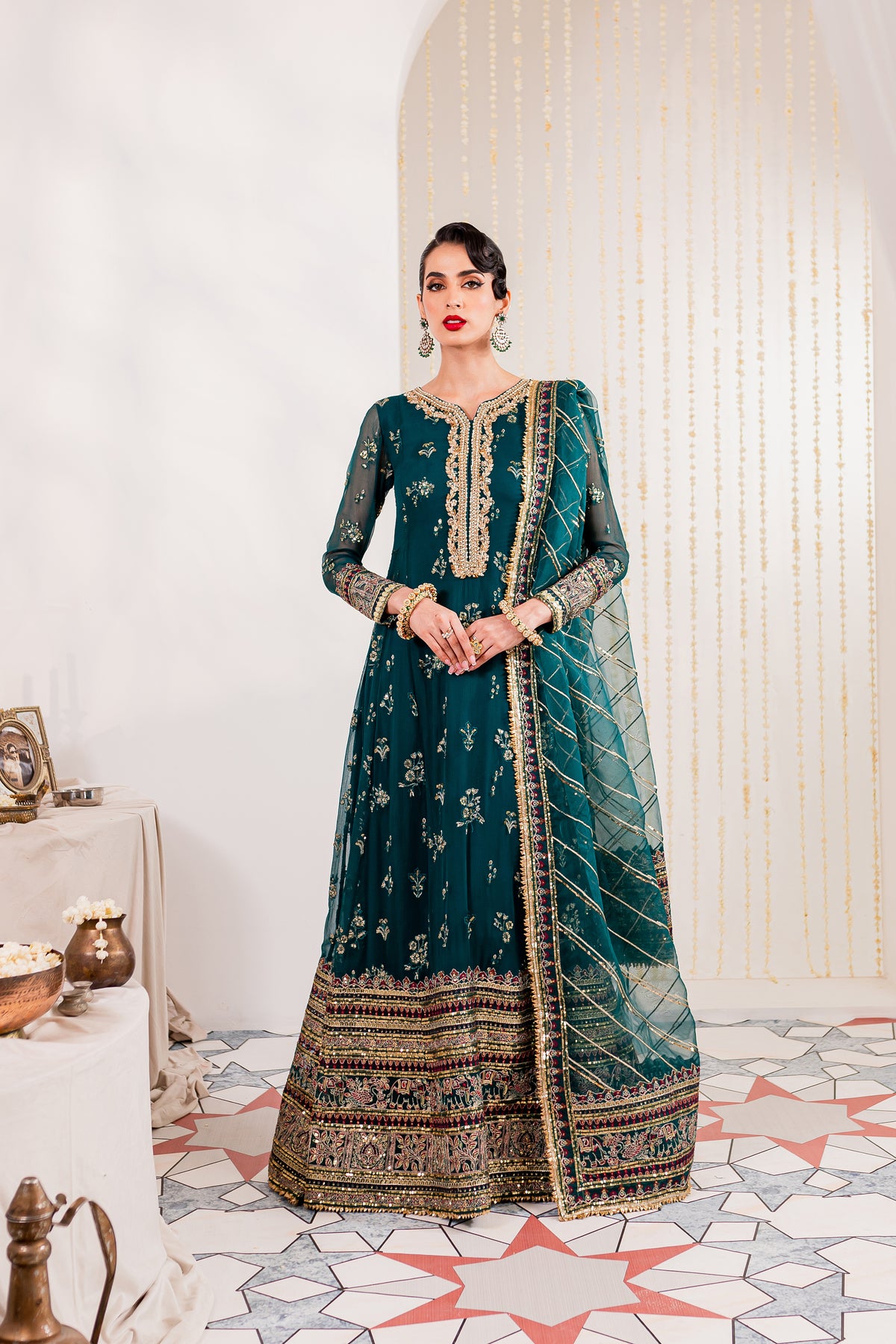 Gracefully designed paneled pishwas frock cut from the finest quality of crinkle chiffon in the shades of zinc. Embellishments feature beautifully embroidered panels and sleeves, neckline enhanced with direct adda work along with dabka, naqshi and pearl intricacies. Frock hem adorned in heavy organza borders with gota lace at finishing, adding the finesse to this flowy silhouette.