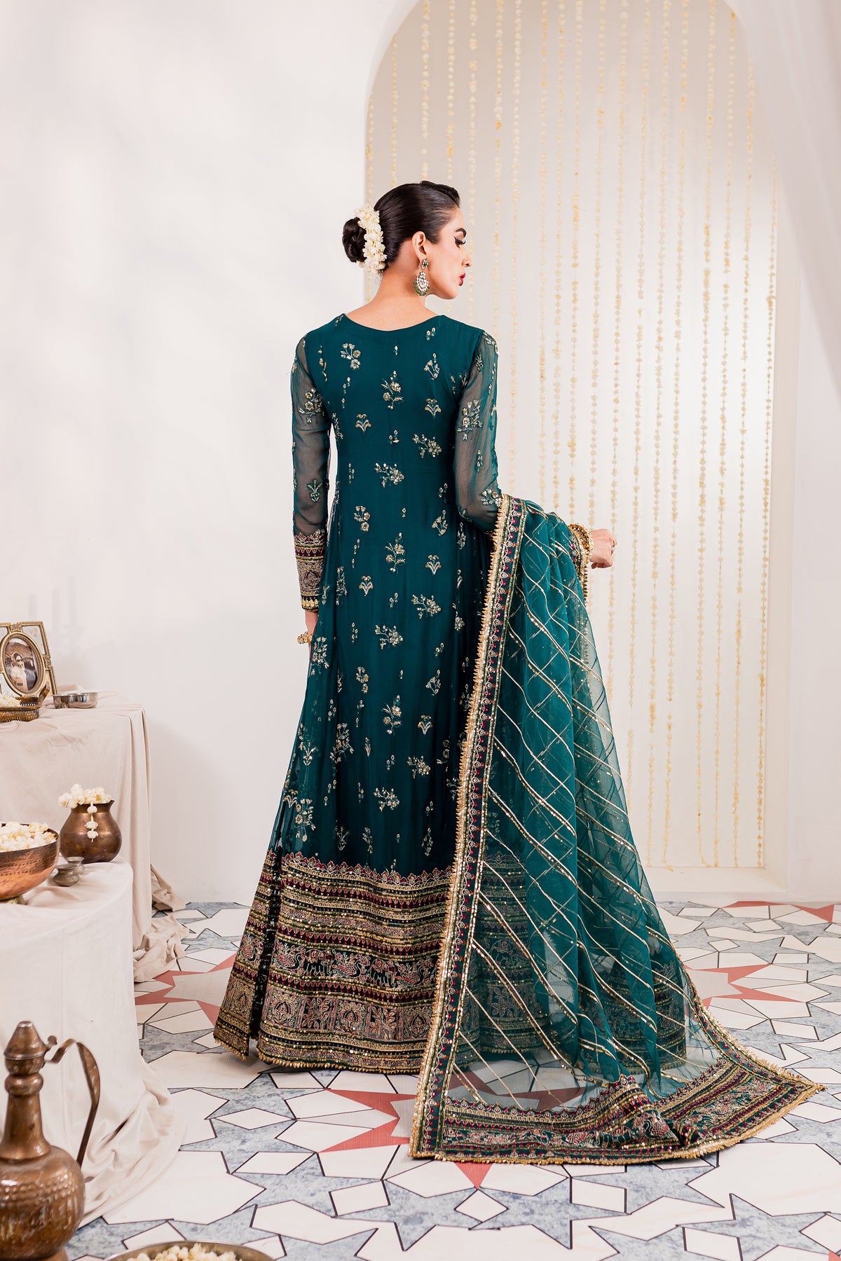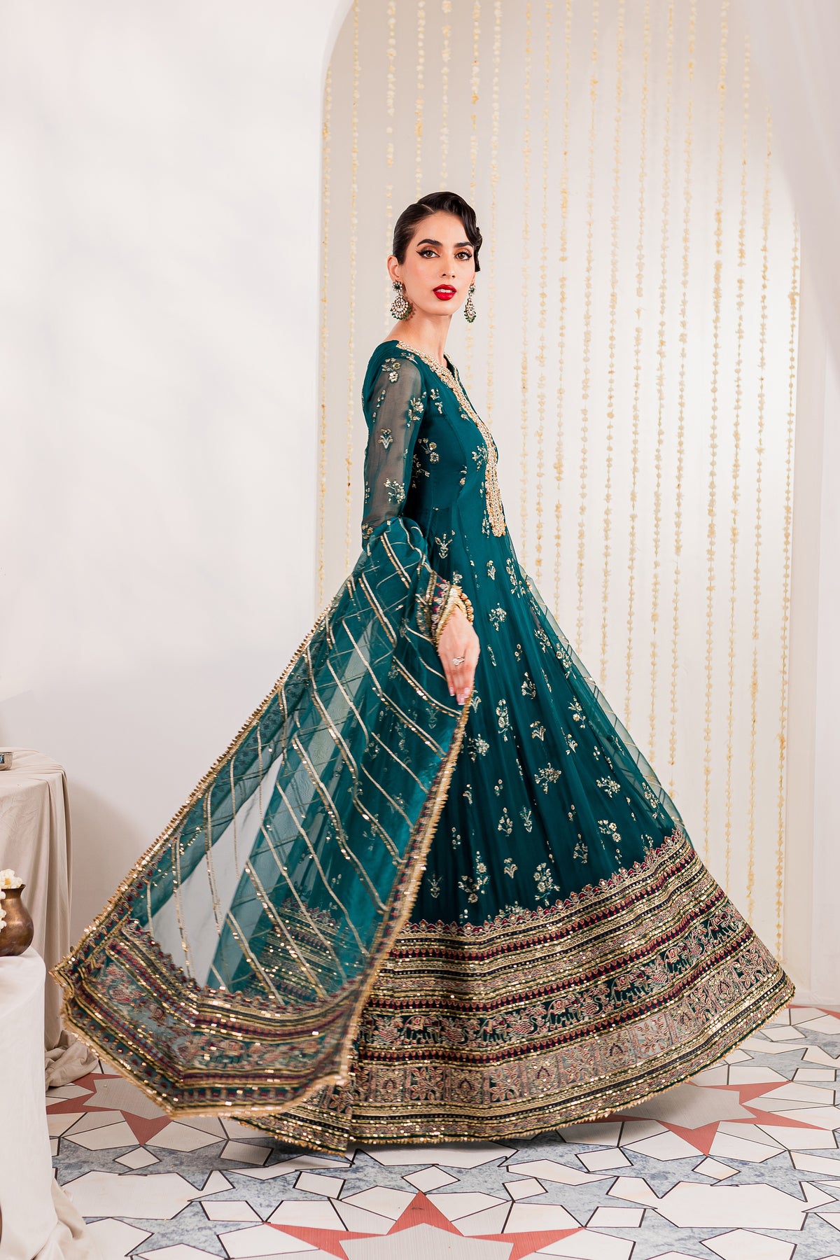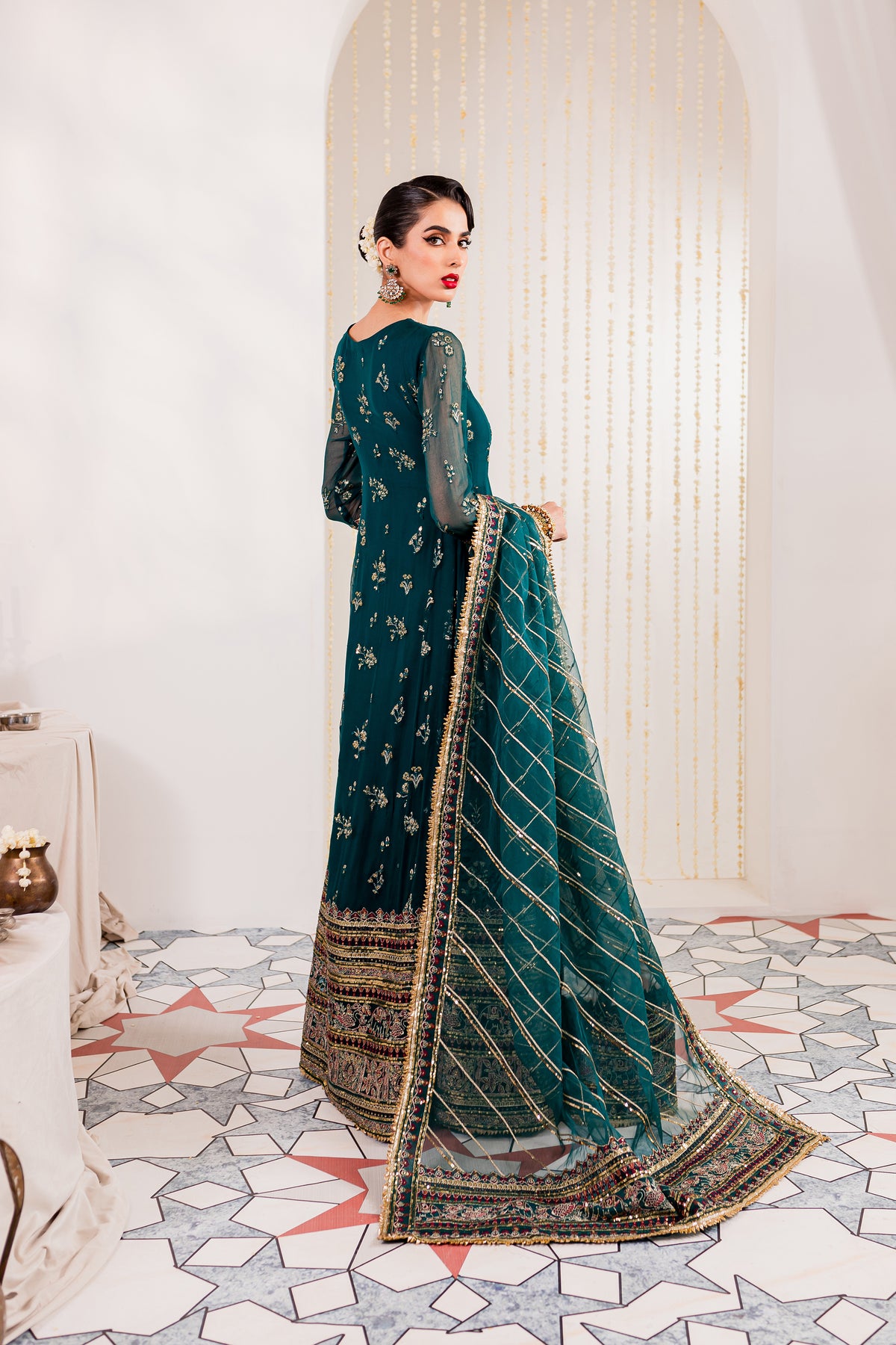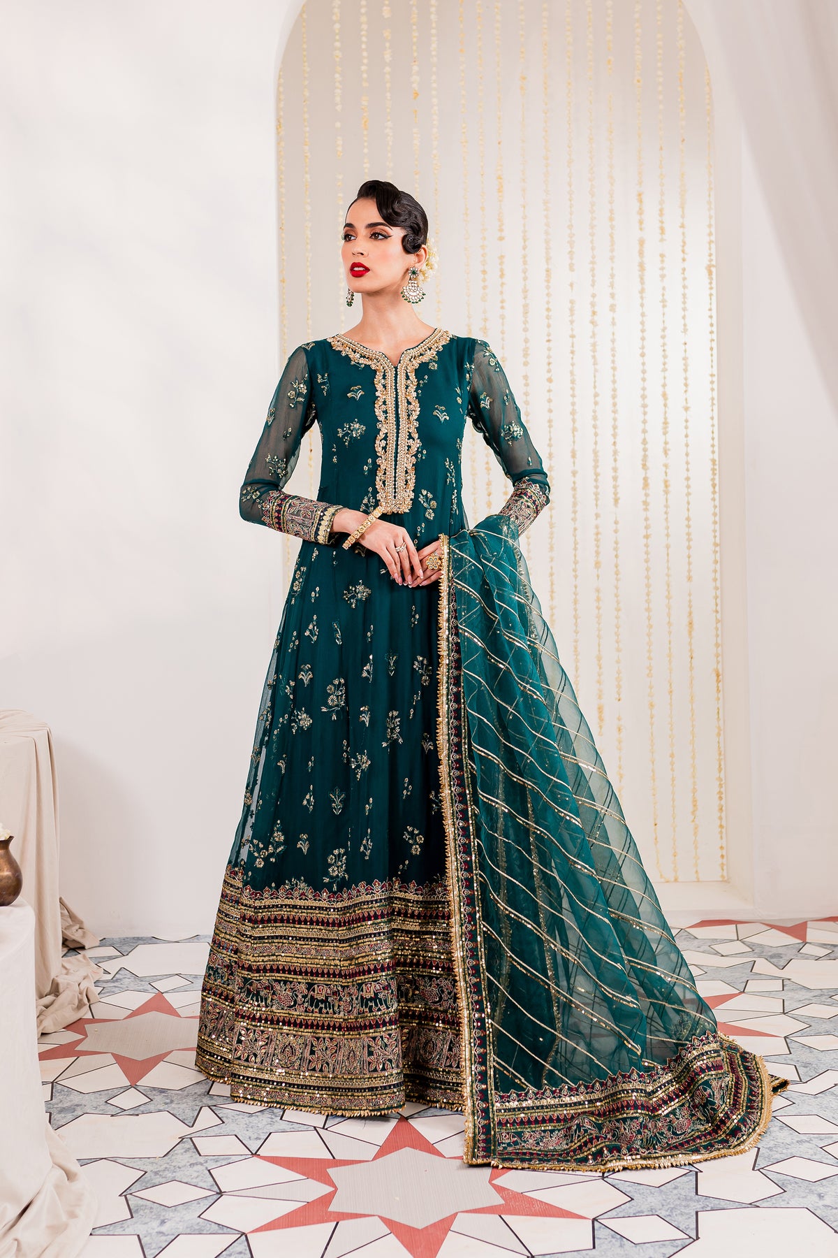 Gracefully designed paneled pishwas frock cut from the finest quality of crinkle chiffon in the shades of zinc. Embellishments feature beautifully embroidered panels and sleeves, neckline enhanced with direct adda work along with dabka, naqshi and pearl intricacies. Frock hem adorned in heavy organza borders with gota lace at finishing, adding the finesse to this flowy silhouette.