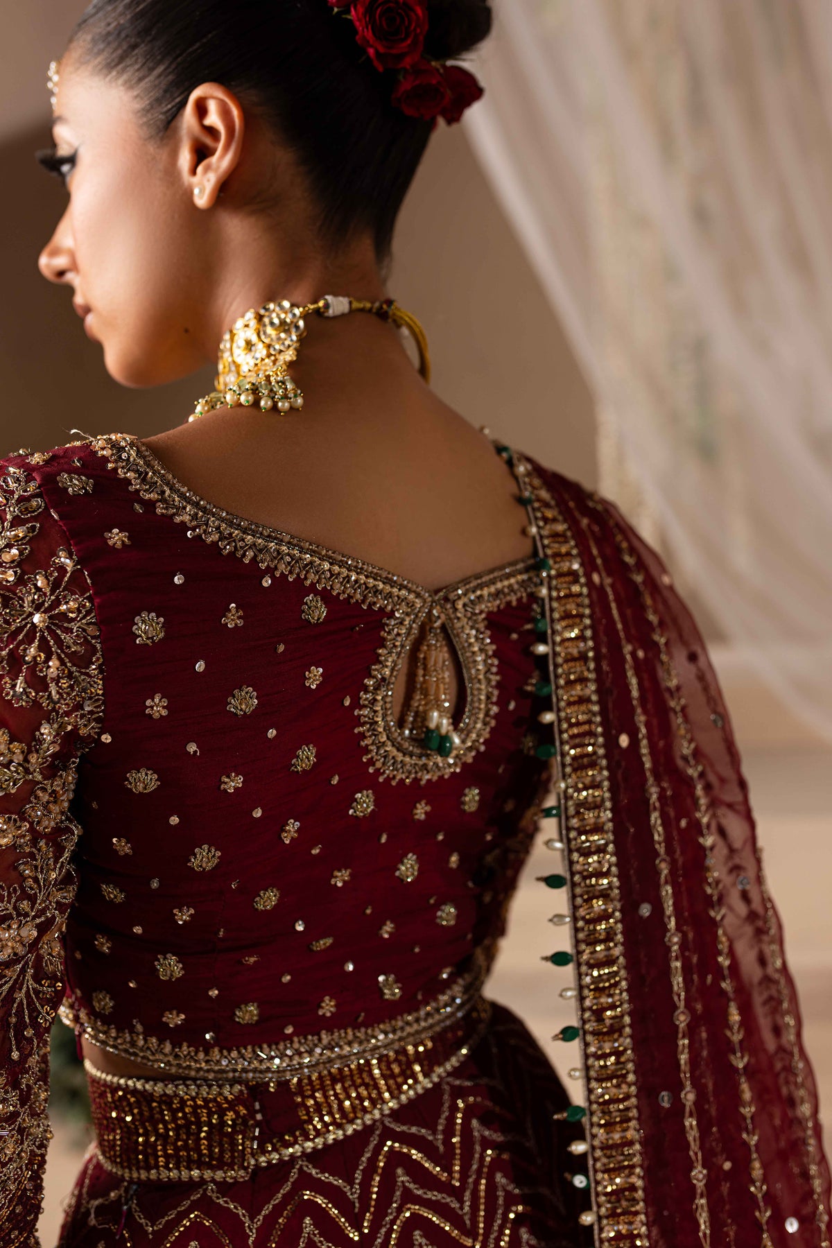 Beautifully designed raw silk choli in the shades of anari red features hand work on the front and back. Embellishments incorporate dabka and kundan work along its neckline and waistline. The back of choli features a finely cut keyhole finished with fancy tassels. To elevate the whole look, organza sleeves are added featuring adda work finished with a touch of material embellishments.