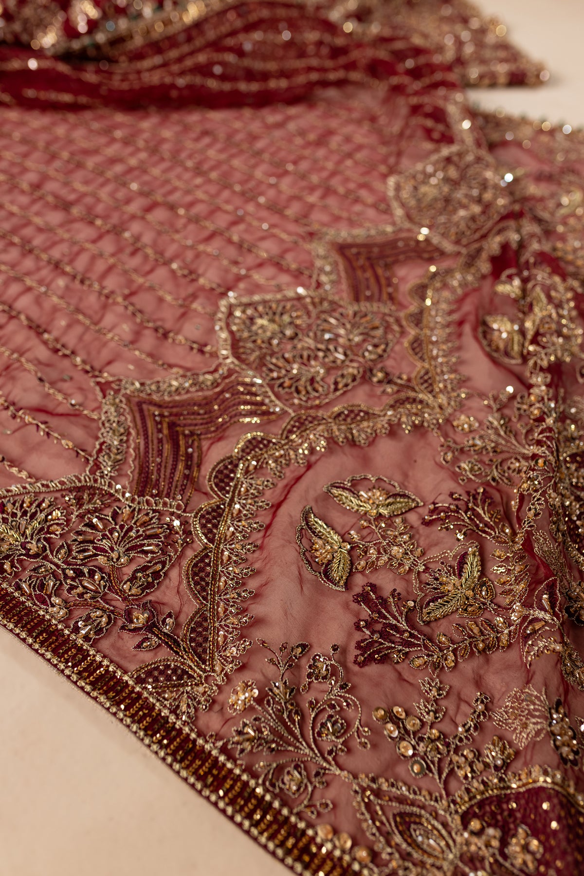 A graceful net dupatta with embroidered jaal all over. Further enhanced with heavily embroidered pallus displaying handwork. Four sided embroidered borders touched up with pearl hangings and fine hand work.
