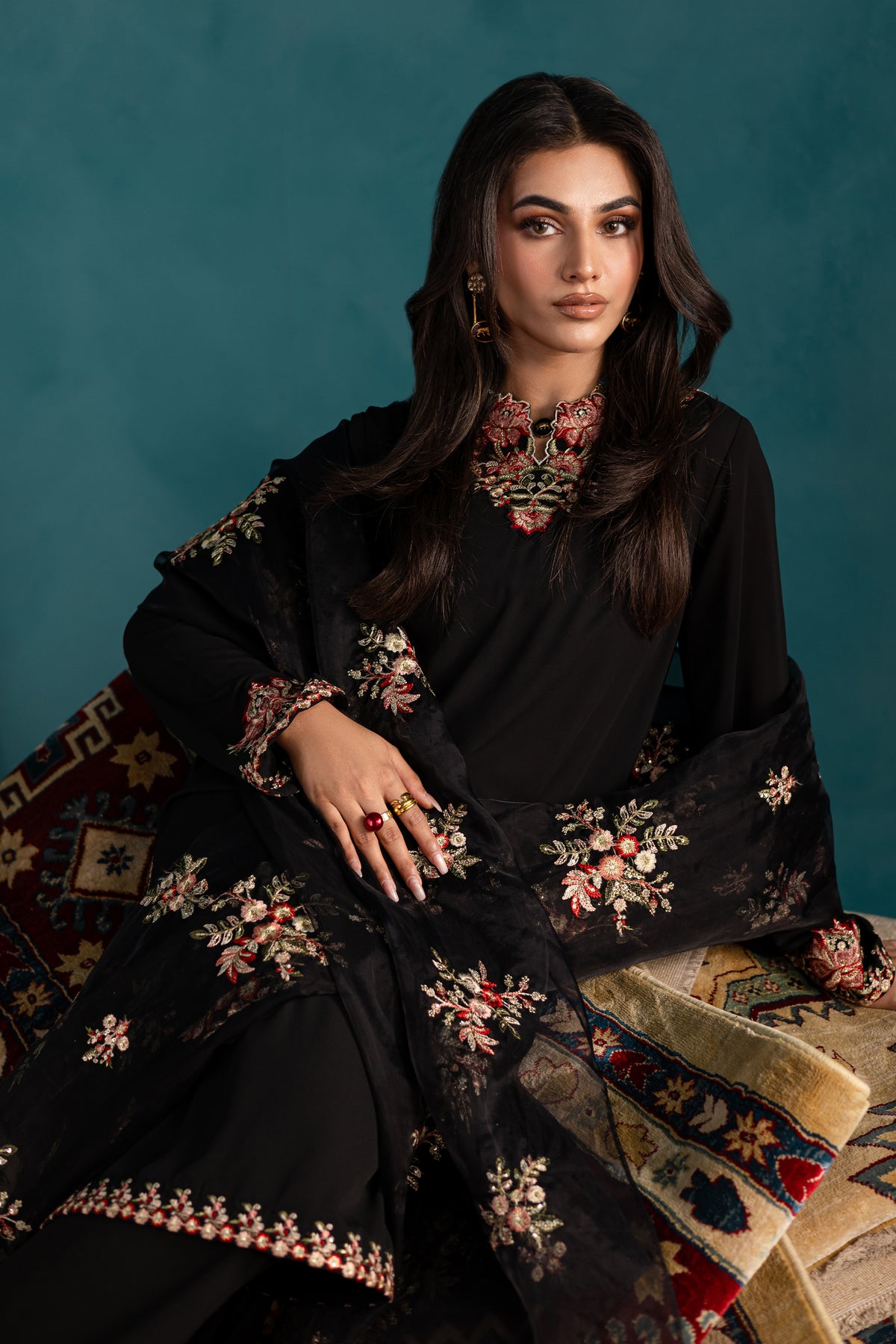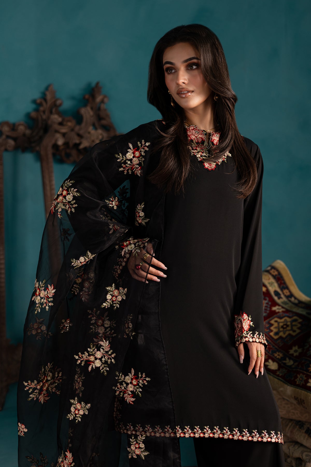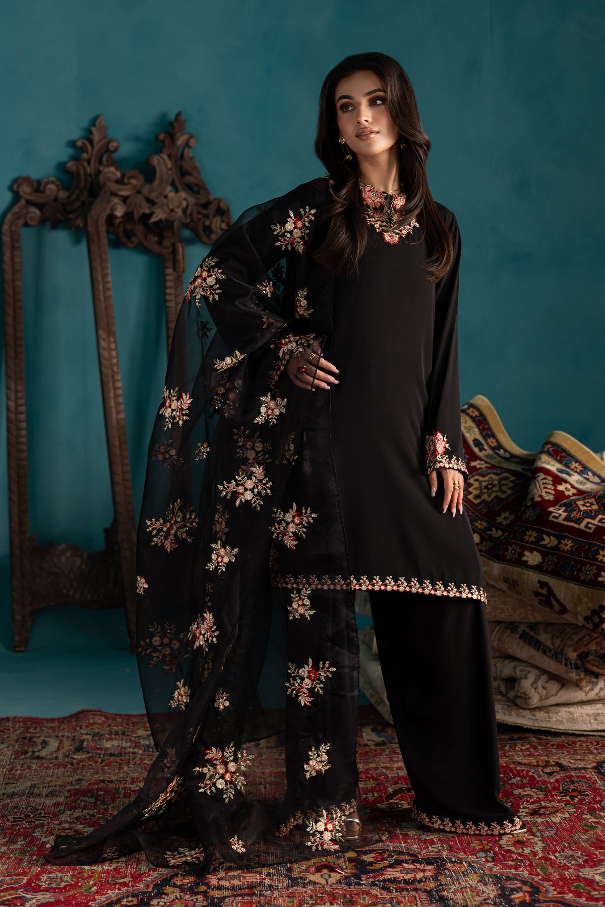 The look is completed with a soft, embroidered organza dupatta featuring an all-over floral spread and a neat self-fold finishing, adding charm and delicacy to this effortlessly elegant ensemble.