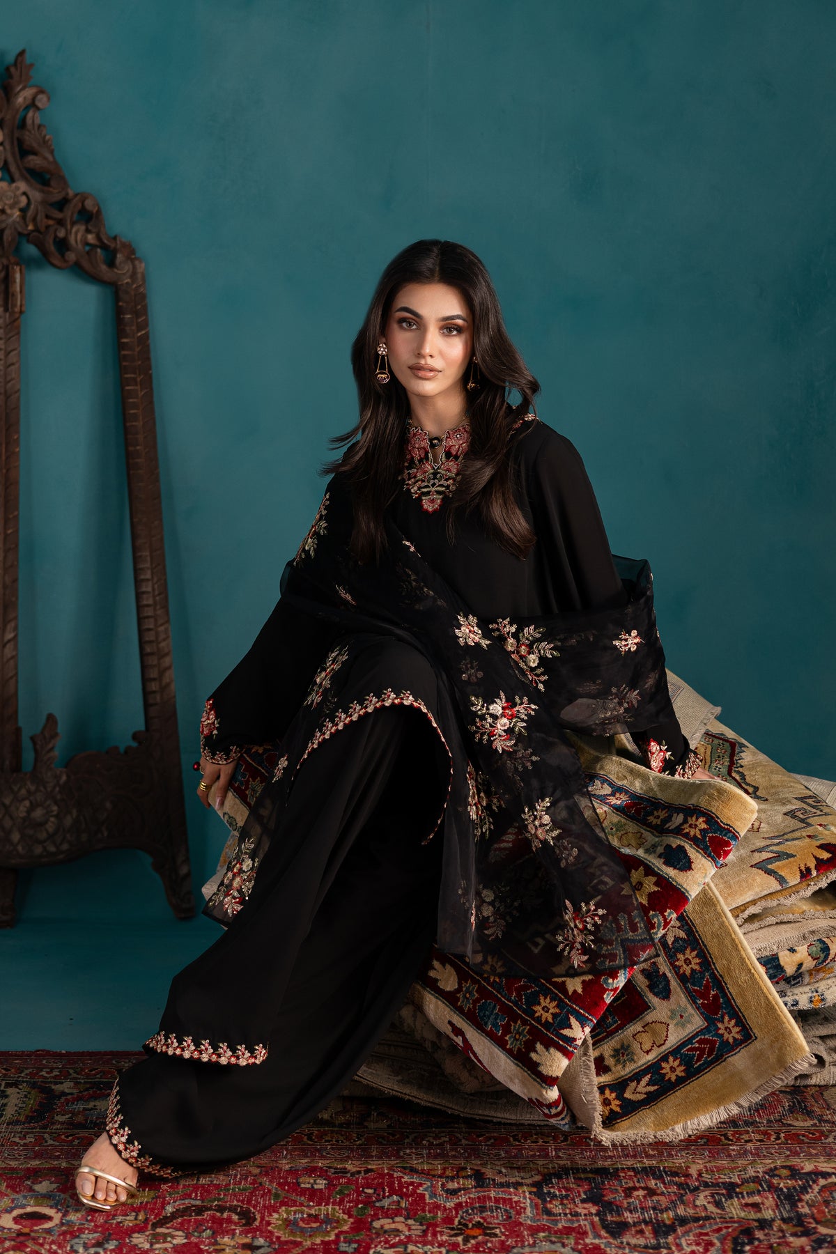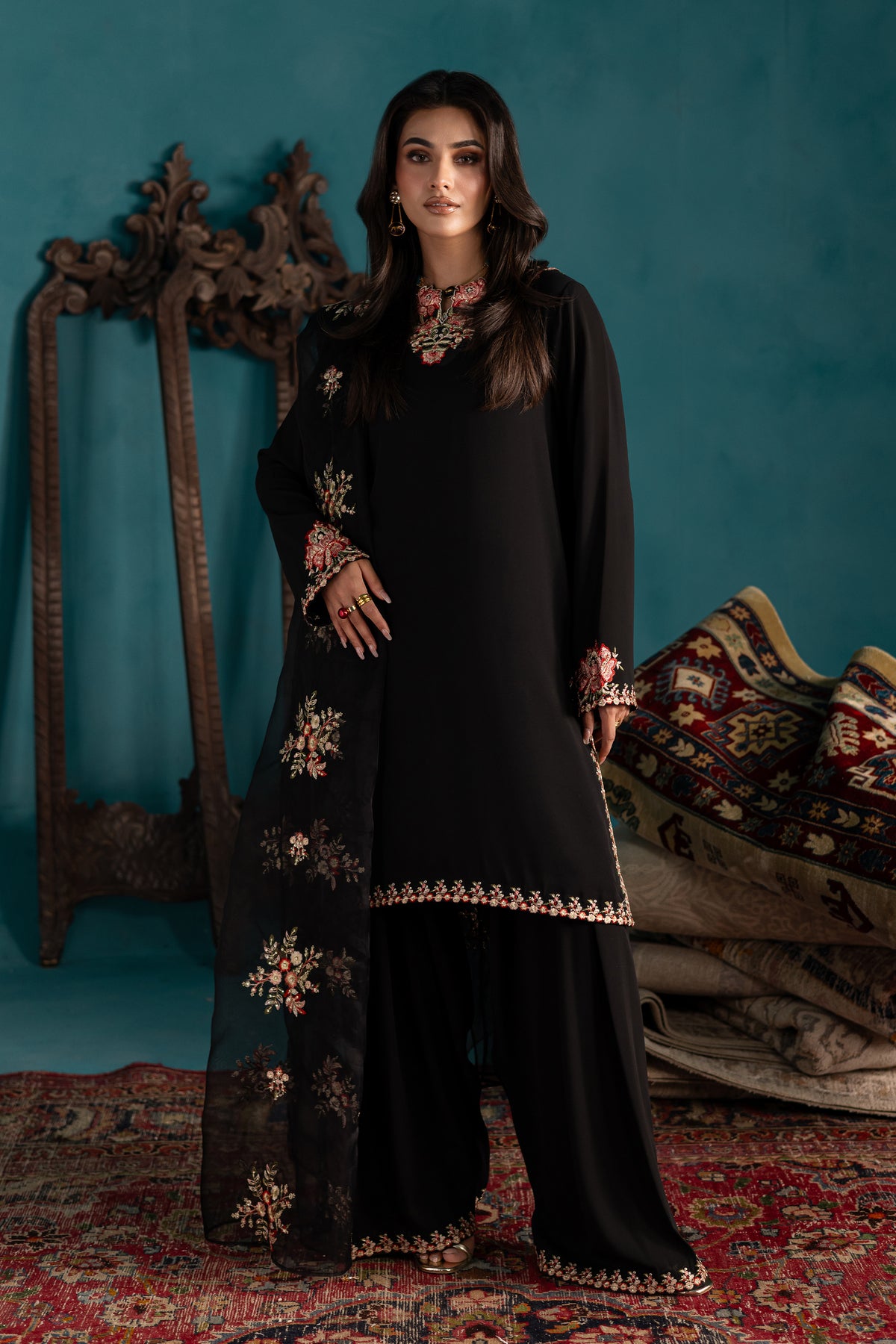 Paired with a flowy georgette farshi shalwar, finished with a matching 1” embroidered border at the hem—offering structure and fluidity in perfect harmony.