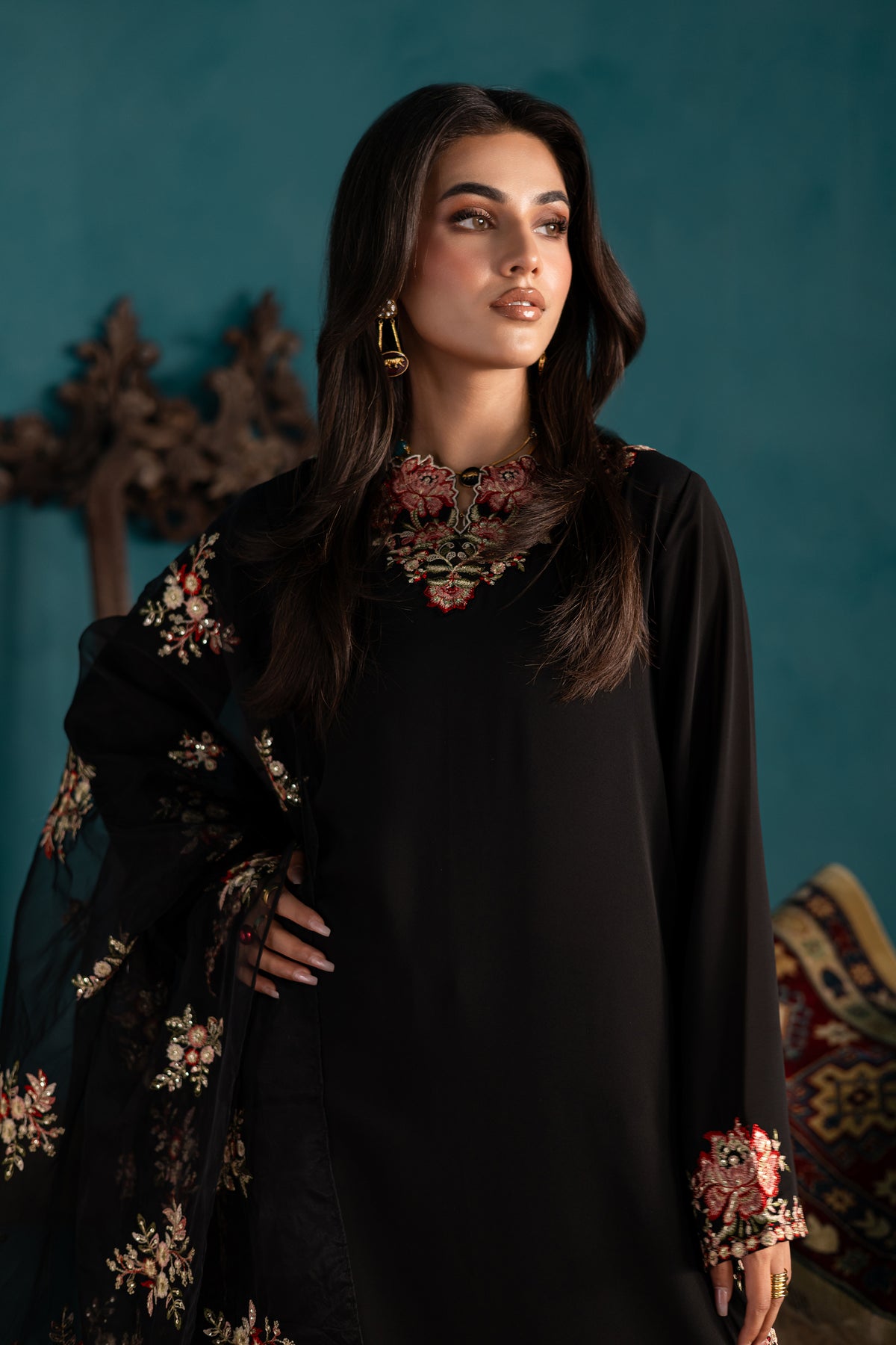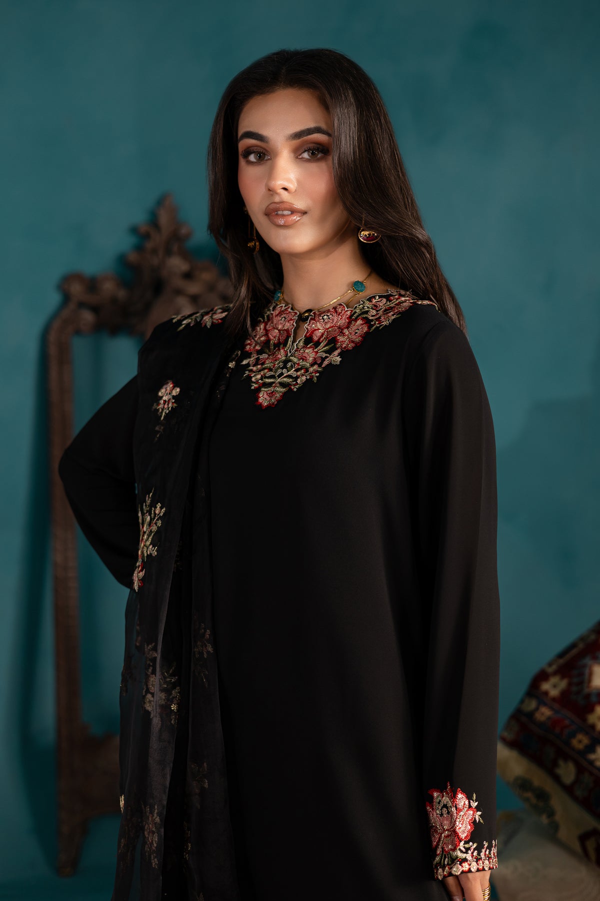 A short georgette black shirt featuring a beautifully embroidered neckline, enhanced with delicate kavia finishing for a refined touch. The shirt hem is detailed with a subtle 1” embroidered border, while the sleeves are adorned with a striking 4” composed embroidered border, adding a bold yet graceful statement.