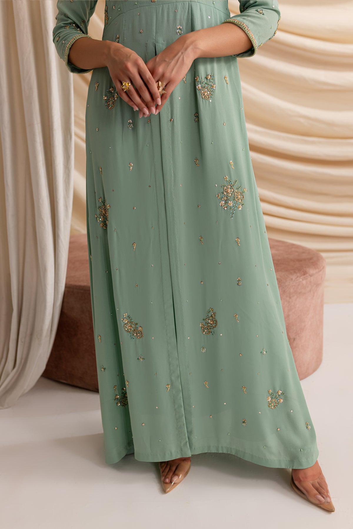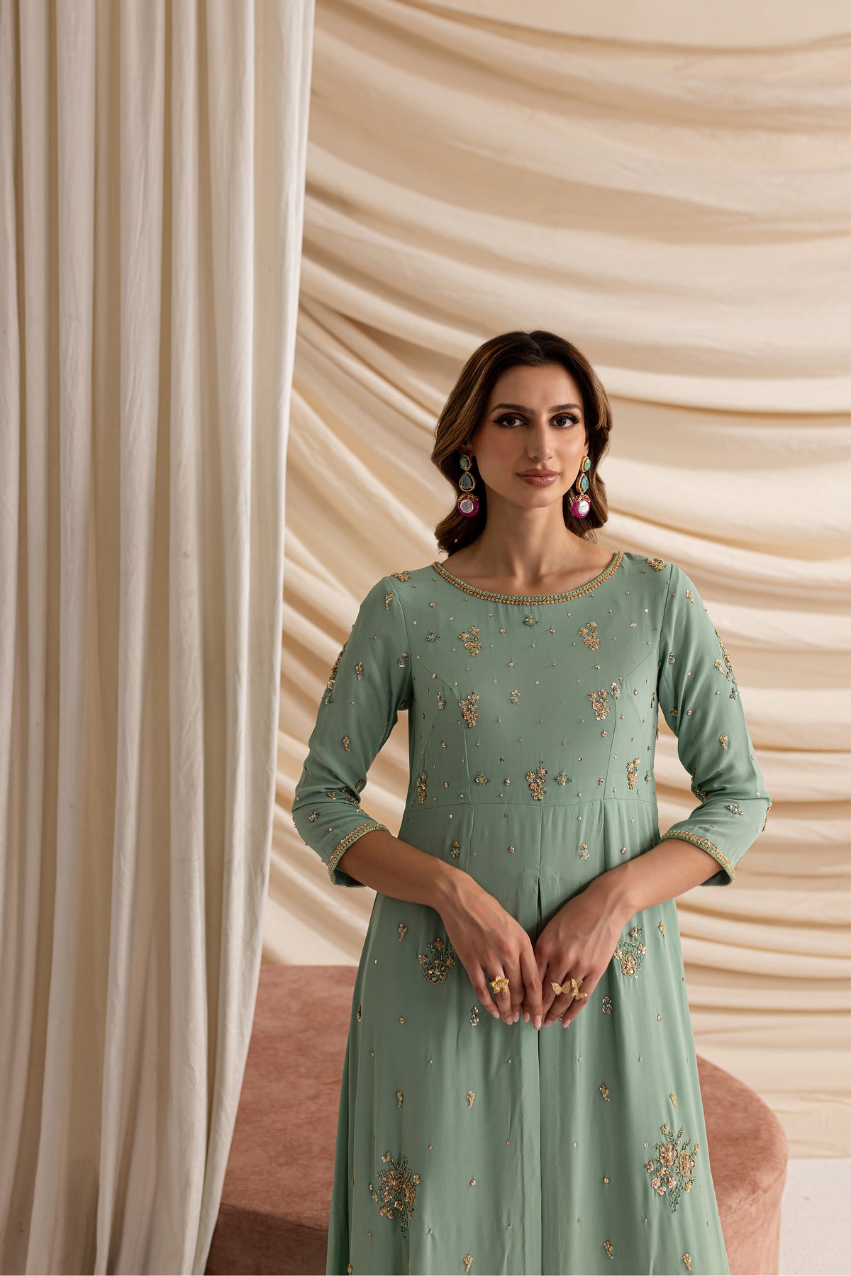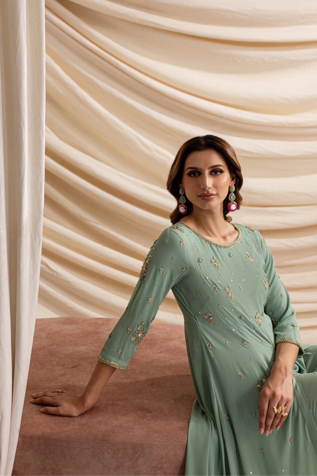 Experience the allure of timeless sophistication with our stunning outfit in mesmerizing emerald hues, made from the luxurious Moss Grip fabric.