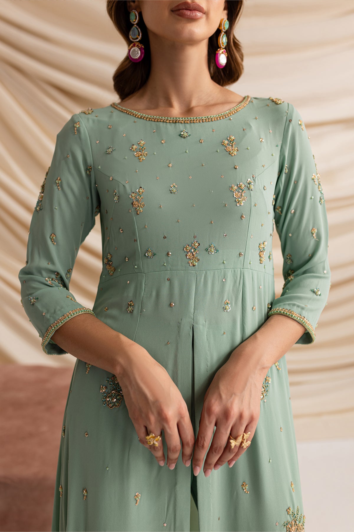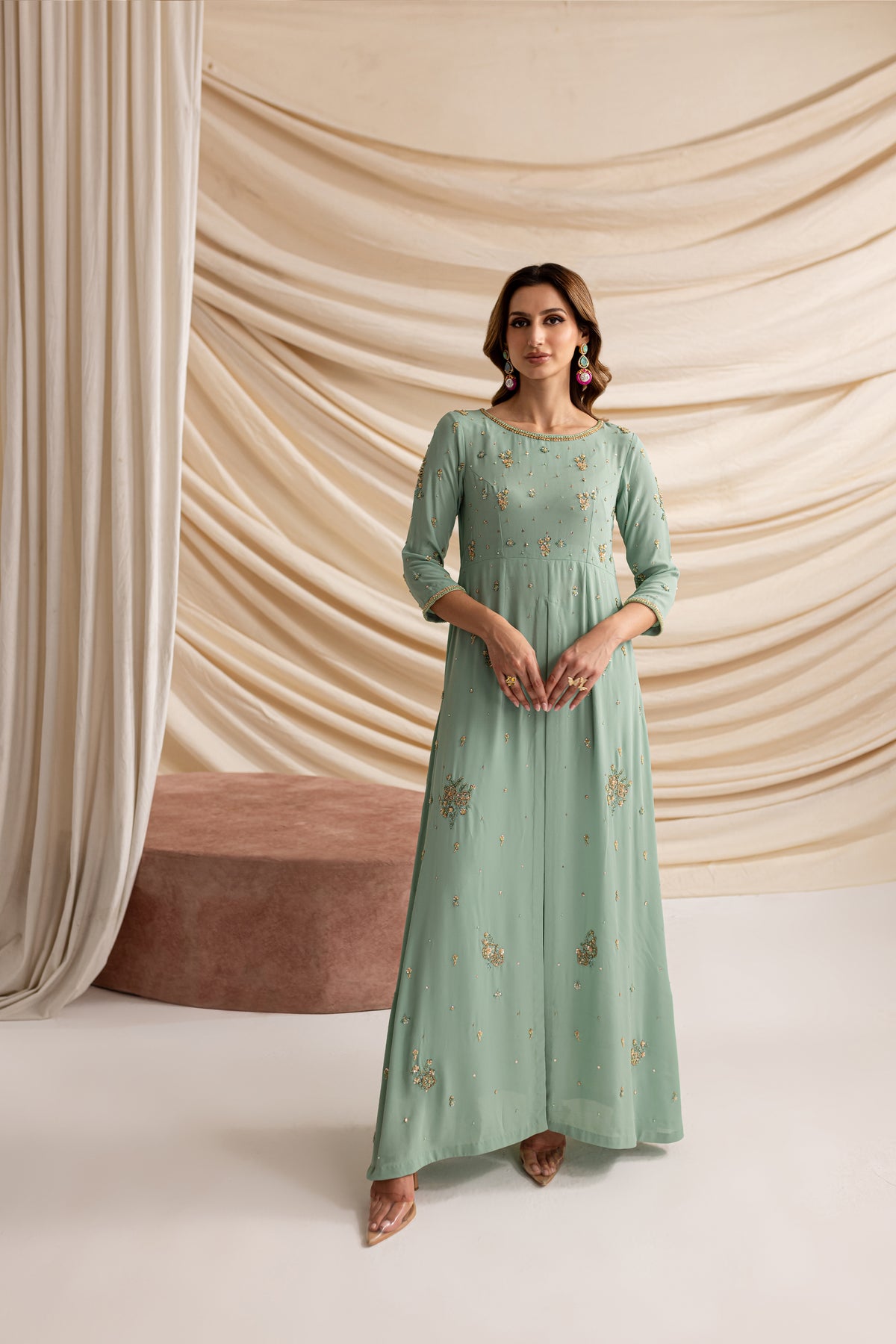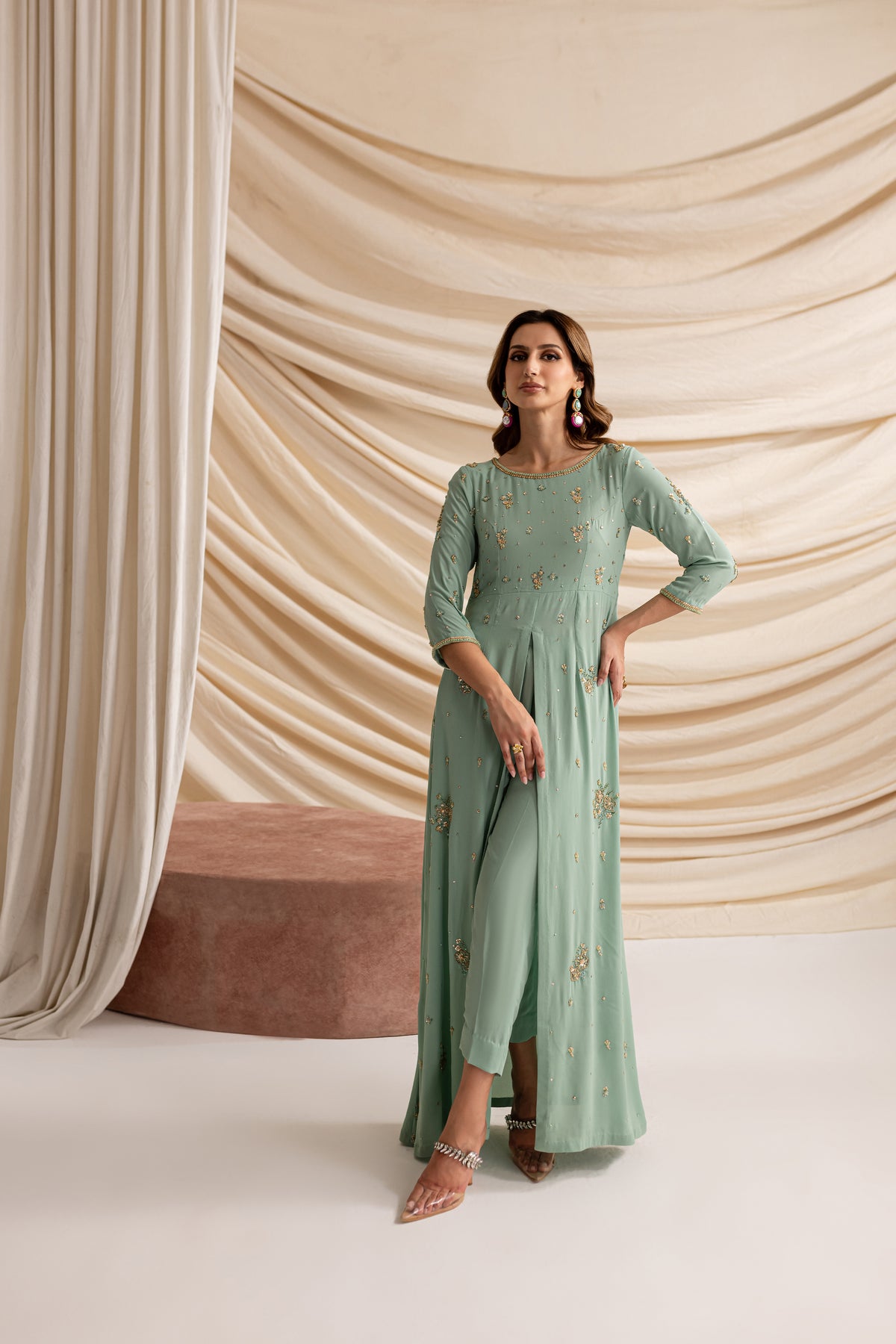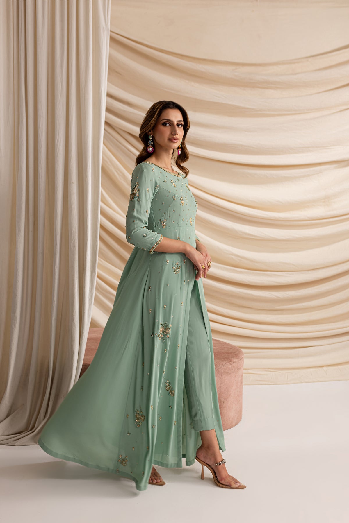 Experience the allure of timeless sophistication with our stunning outfit in mesmerizing emerald hues, made from the luxurious Moss Grip fabric.
