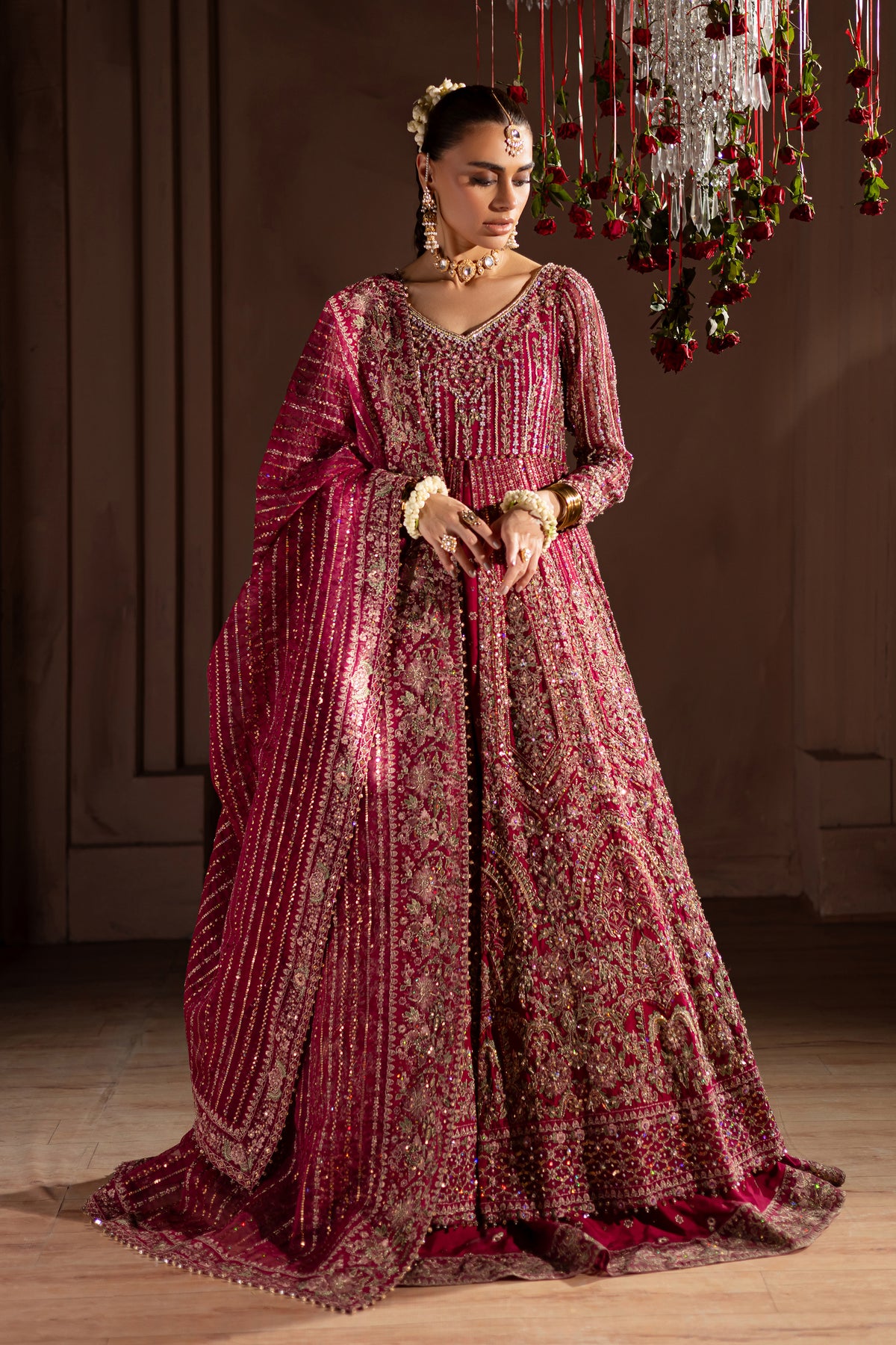 This resplendent front open frock, crafted from luxurious raw silk, is heavily embroidered and lavishly adorned with detailed adda work. The sleeves are richly embroidered and finished with organza borders at the hem, further enhanced with lace finishing and delicate hangings for a graceful touch. The frock’s hemline is crowned with a wide, heavily embroidered organza border, while additional hangings create fluid movement and depth. At the back, the yoke is elegantly designed with tassels, adding a regal flourish to the ensemble.