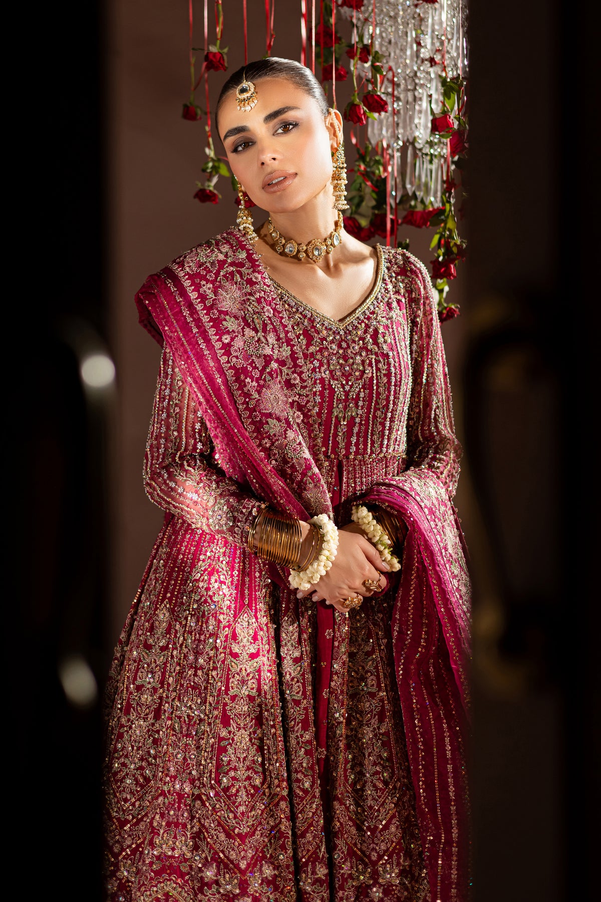 An ethereal organza dupatta completes the attire, shimmering with all-over sequin embroidery that lends a luminous effect. Its borders are richly finished on all four sides and adorned with delicate crystal hangings, surrounding the bride in an aura of timeless opulence.