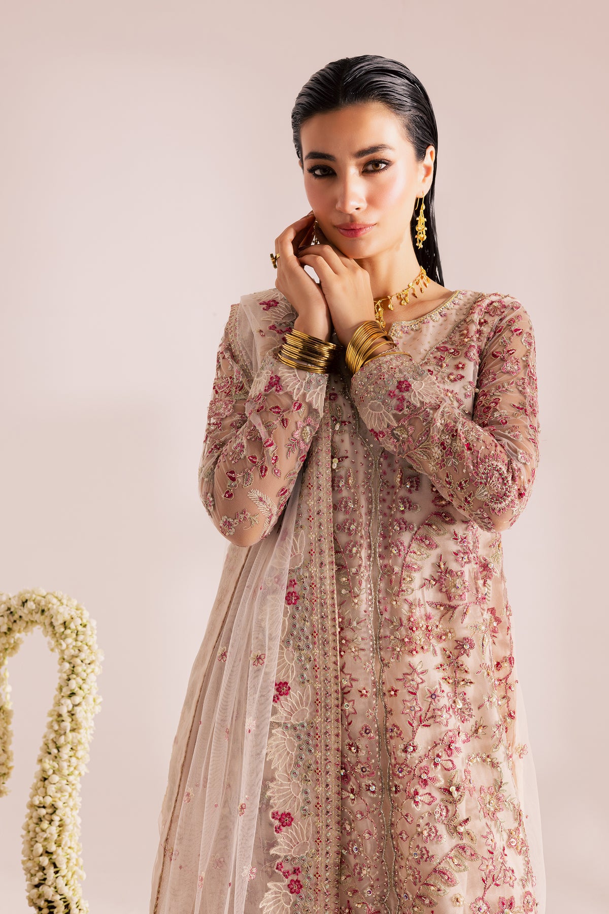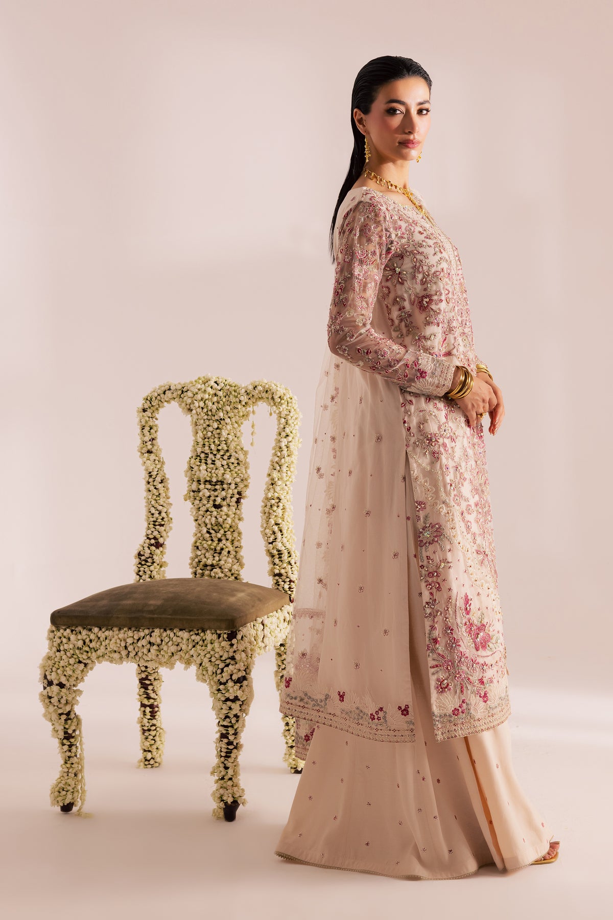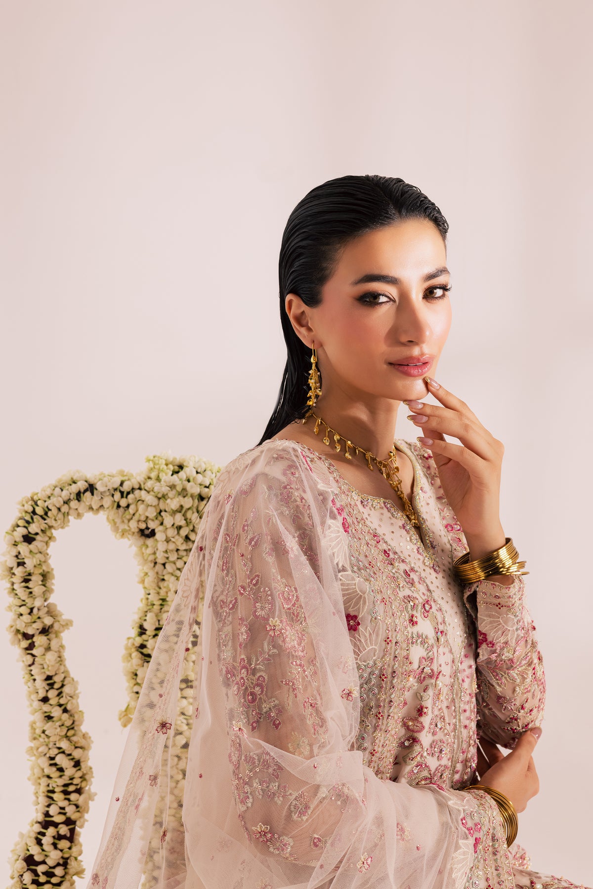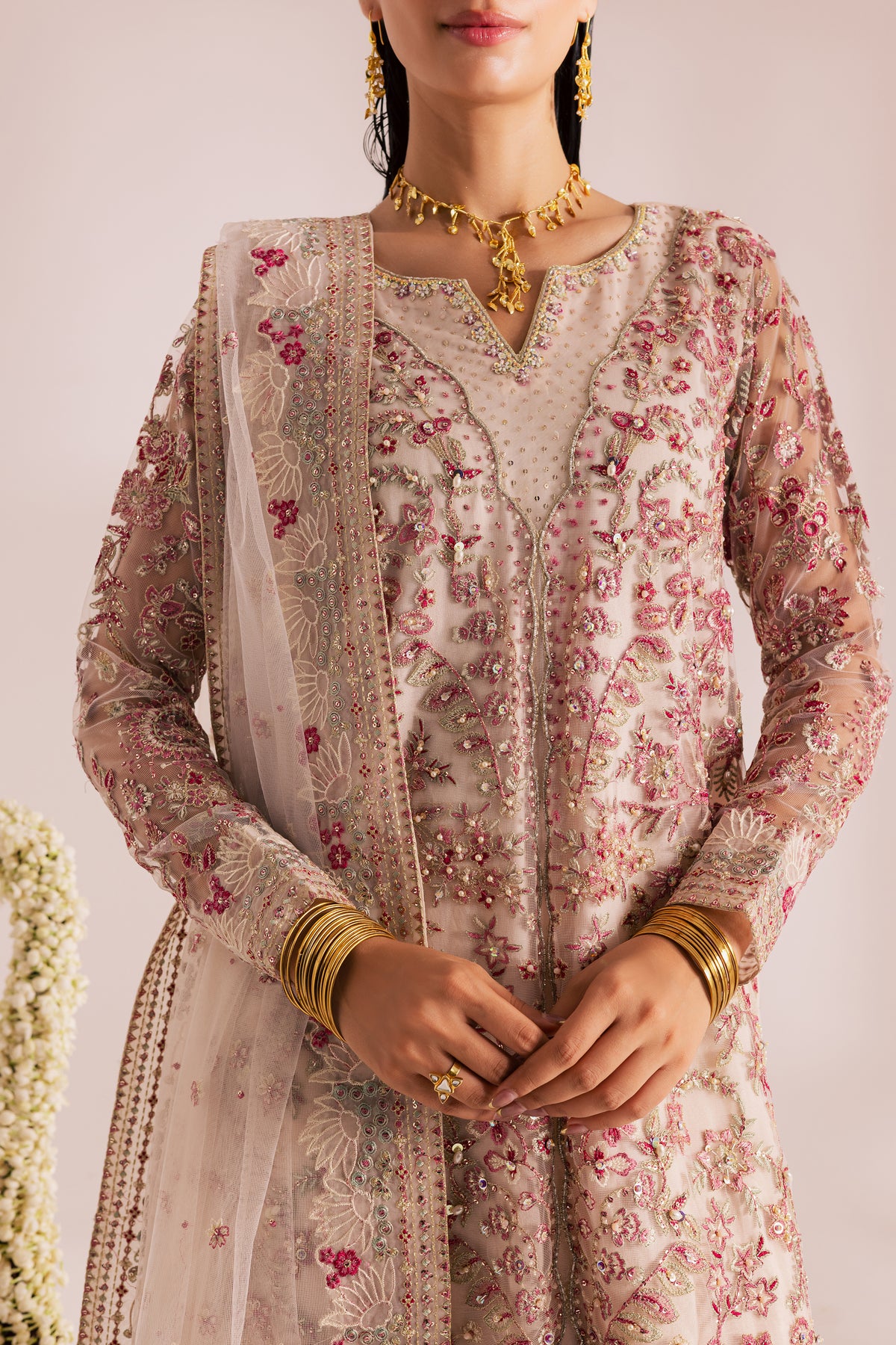 This beautiful 3-piece ensemble featuring a soft pink embroidered net shirt with a stylish front cut and Adda work on the neckline. The net sleeves are embroidered and finished with an organza border at the hem, while the shirt hem is also bordered for a polished look.