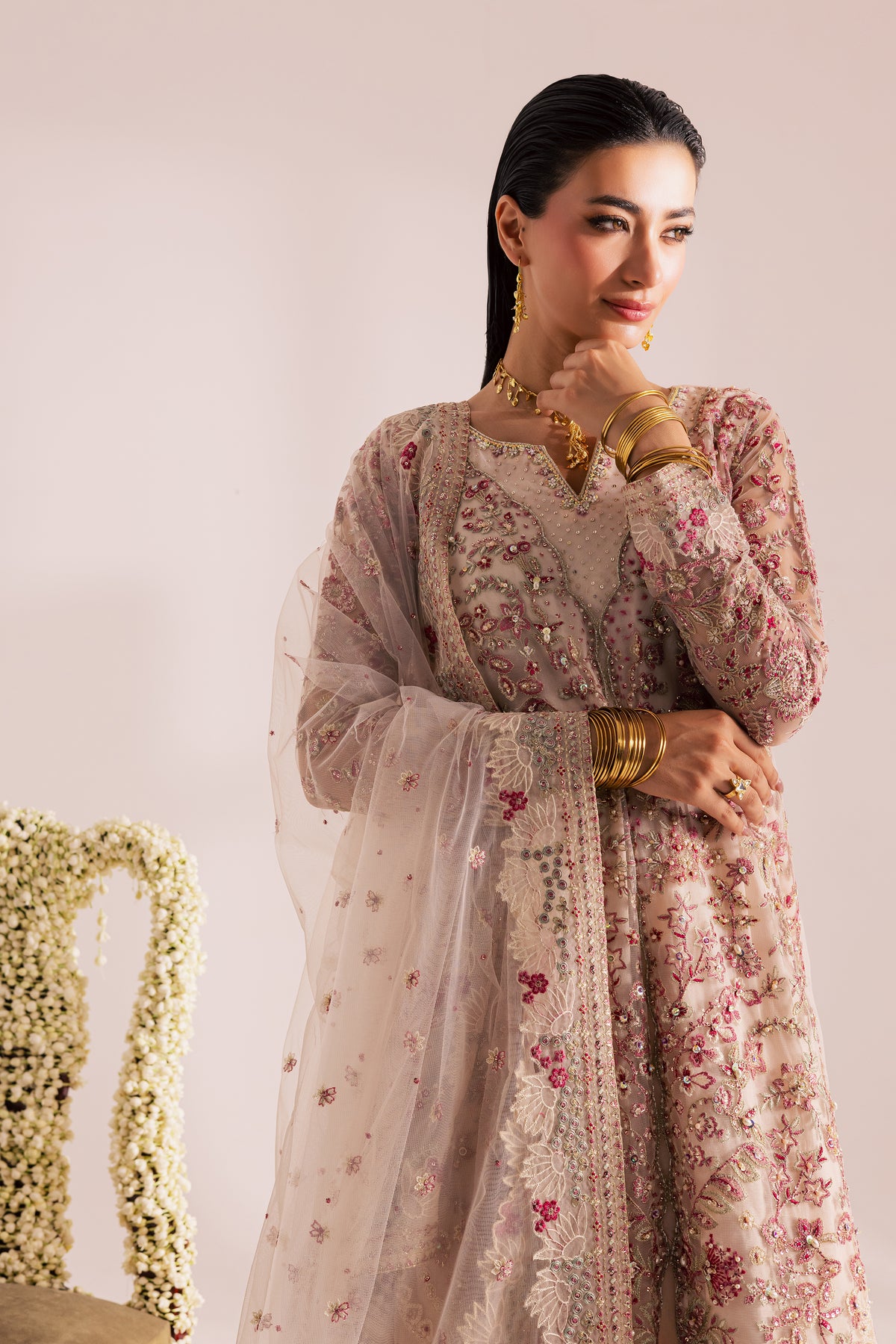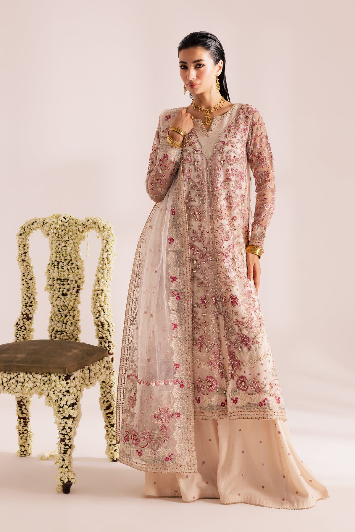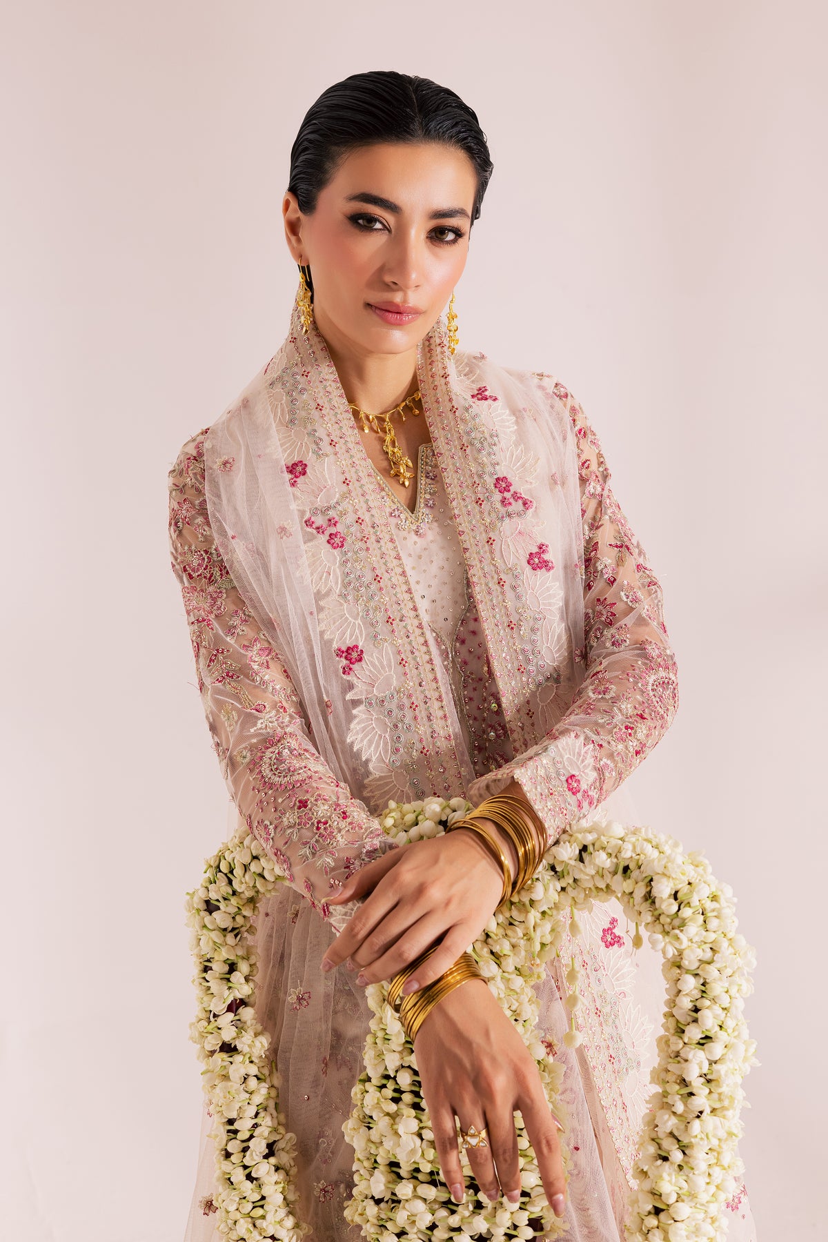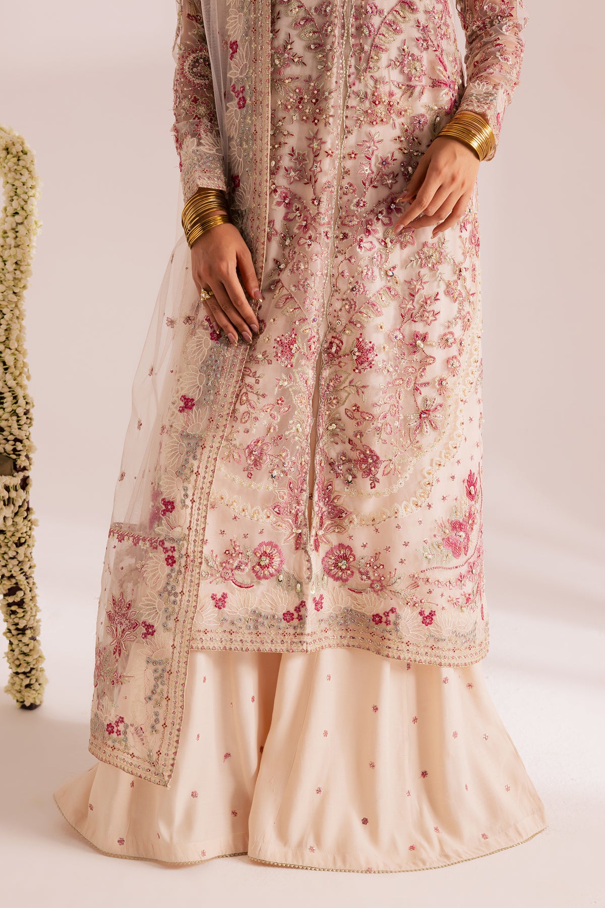 This beautiful 3-piece ensemble featuring a soft pink embroidered net shirt with a stylish front cut and Adda work on the neckline. The net sleeves are embroidered and finished with an organza border at the hem, while the shirt hem is also bordered for a polished look.