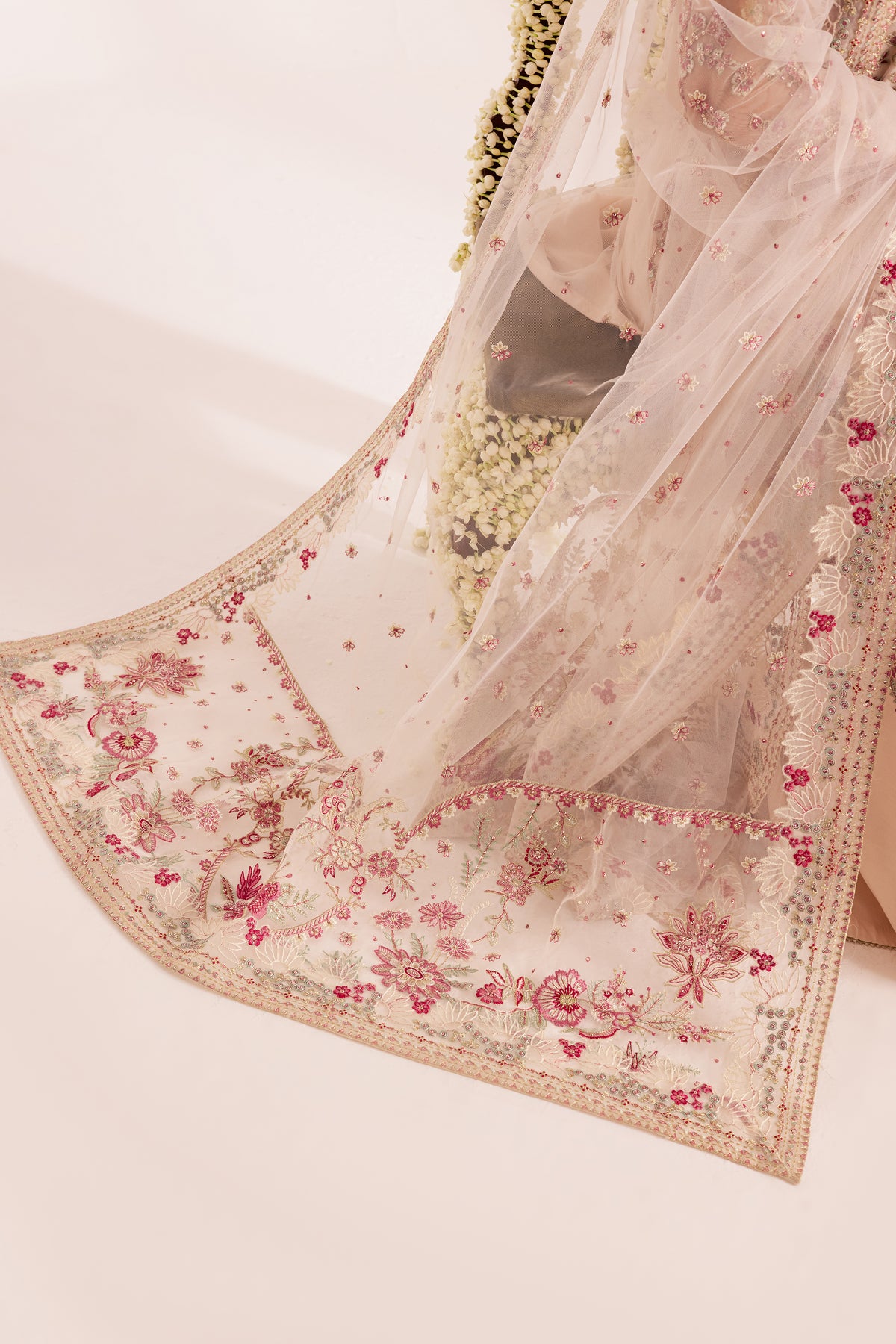 The net dupatta completes the outfit, featuring embroidery throughout and bordered with organza on all four sides, finished delicately with lace for a refined touch.