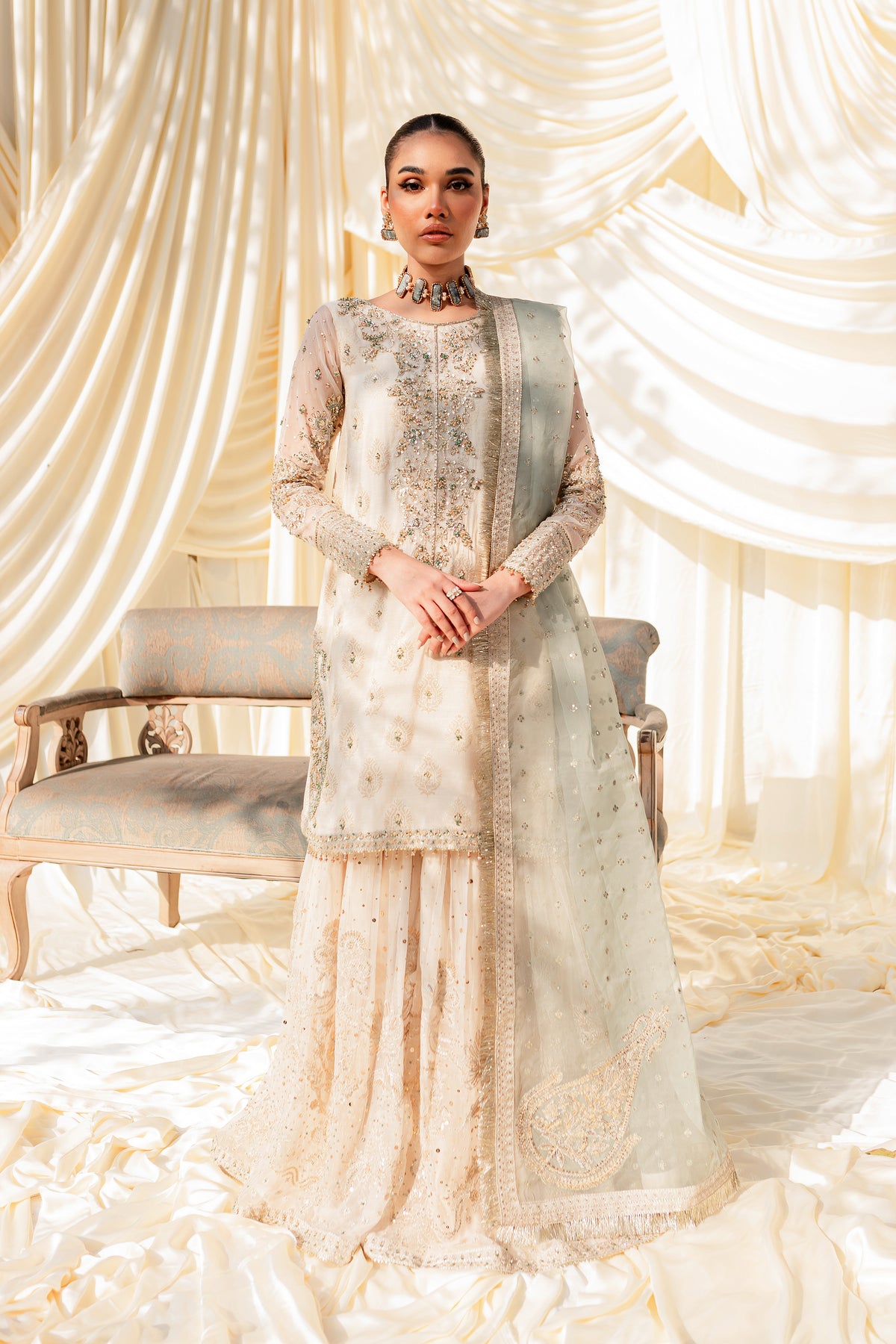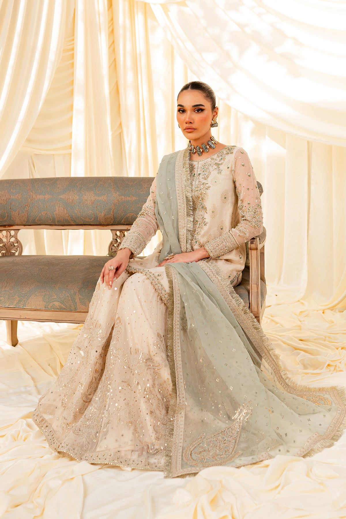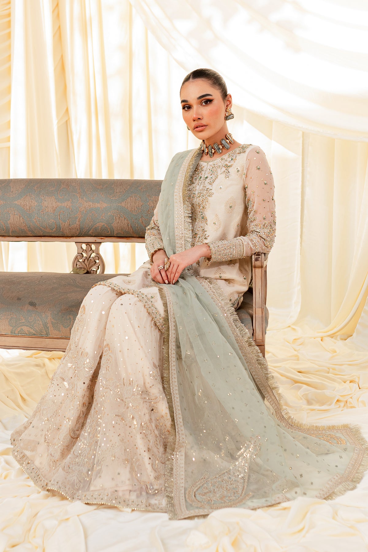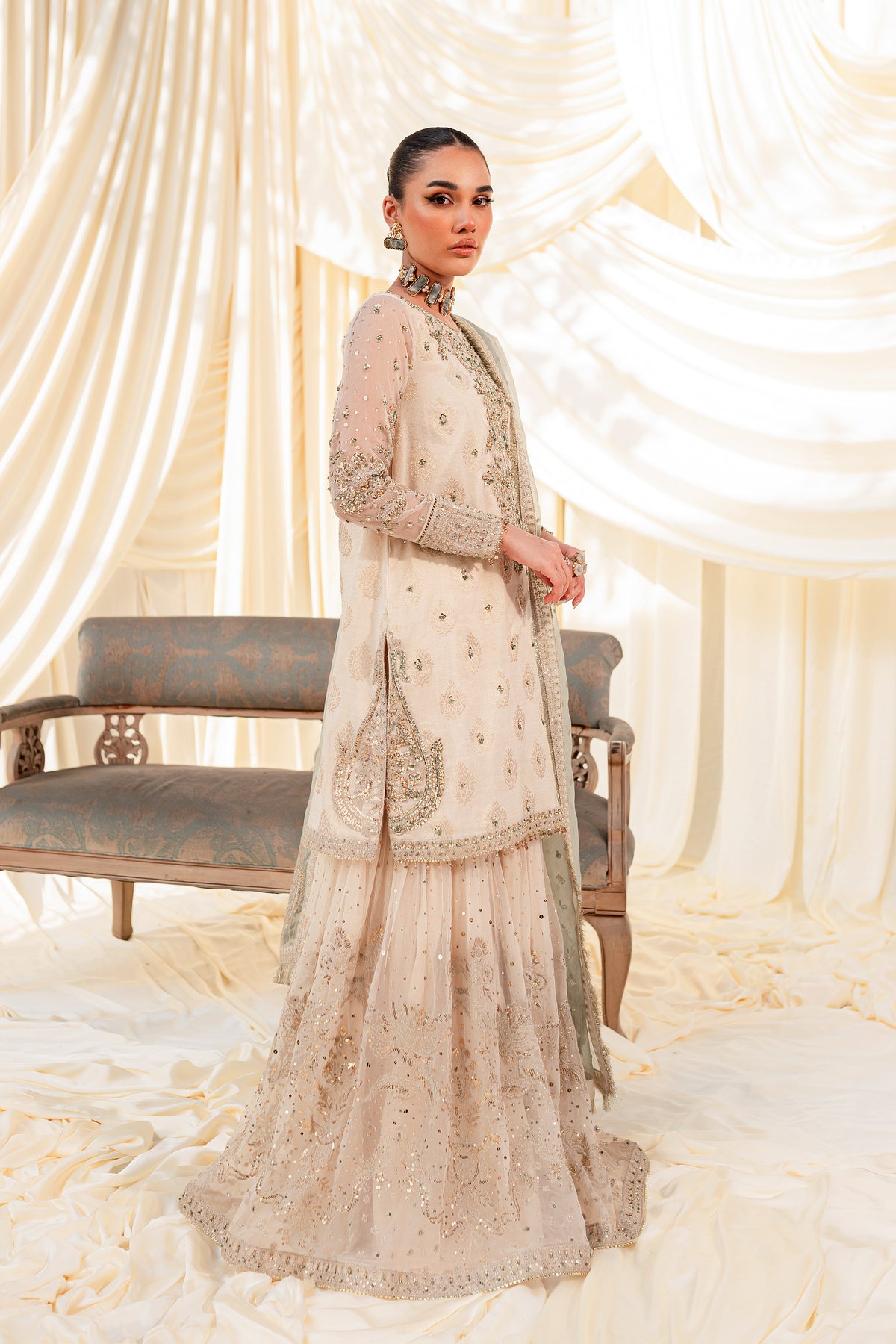 Unveil the secrets of eastern opulence, Husna displays soft and shimmery shades on traditional gharara cut. Style this ensemble with traditional jewelry to make your look stand out.