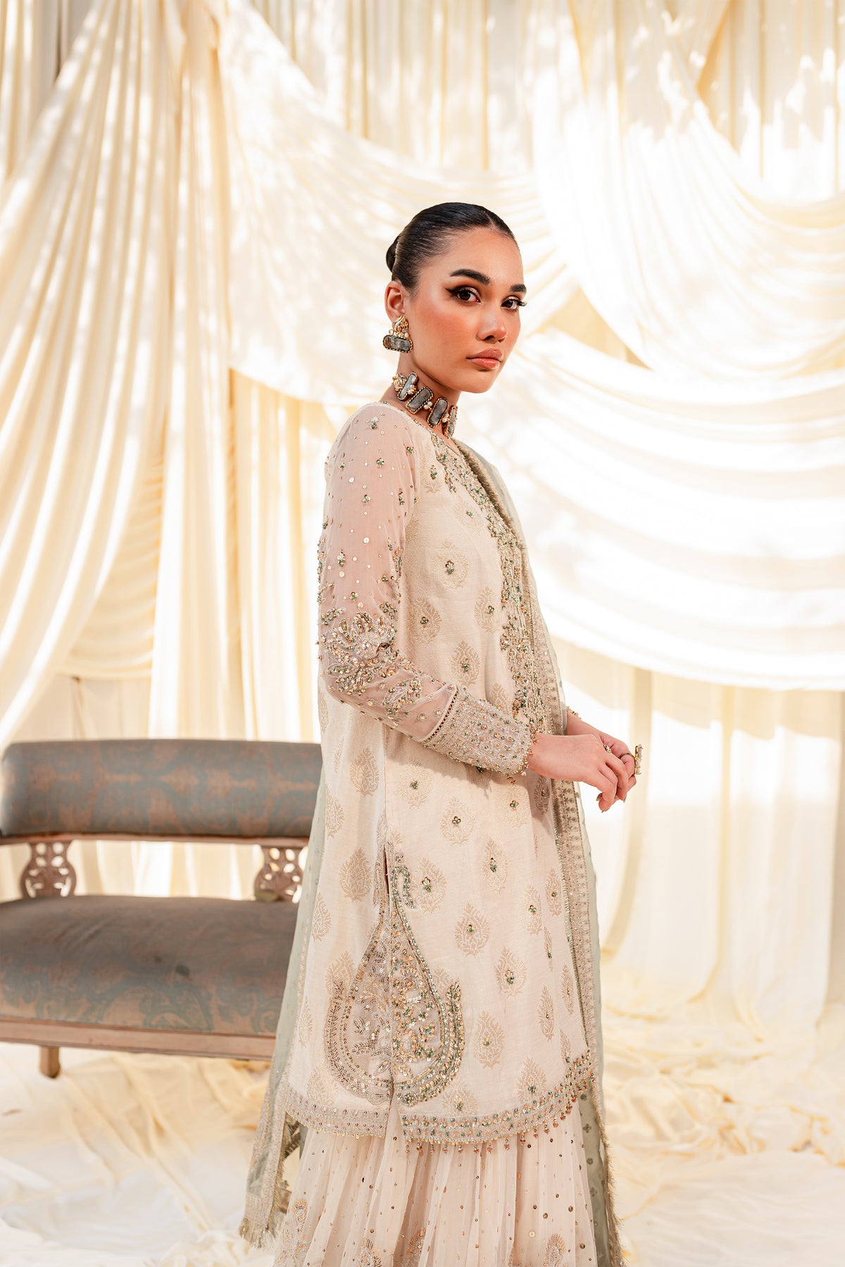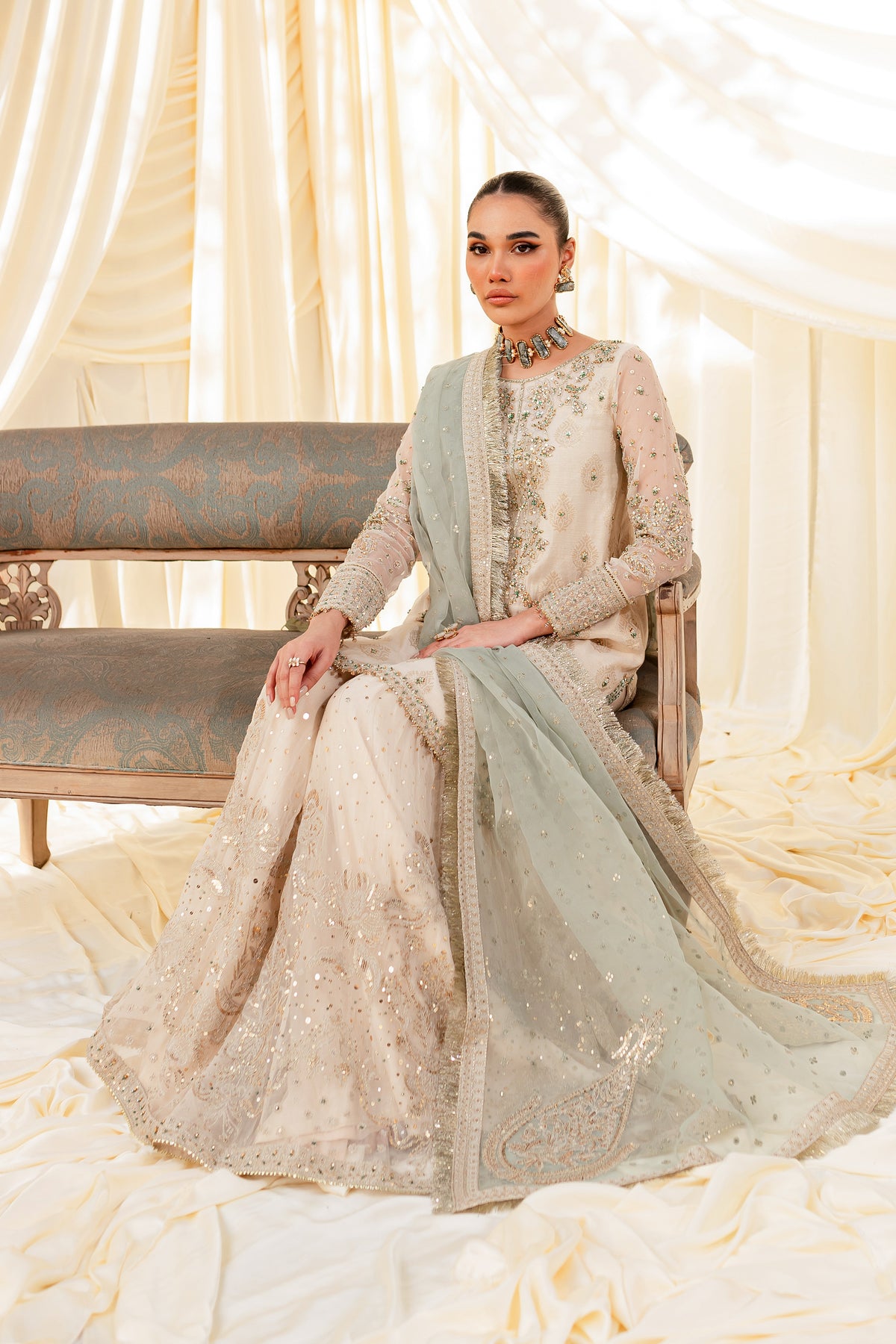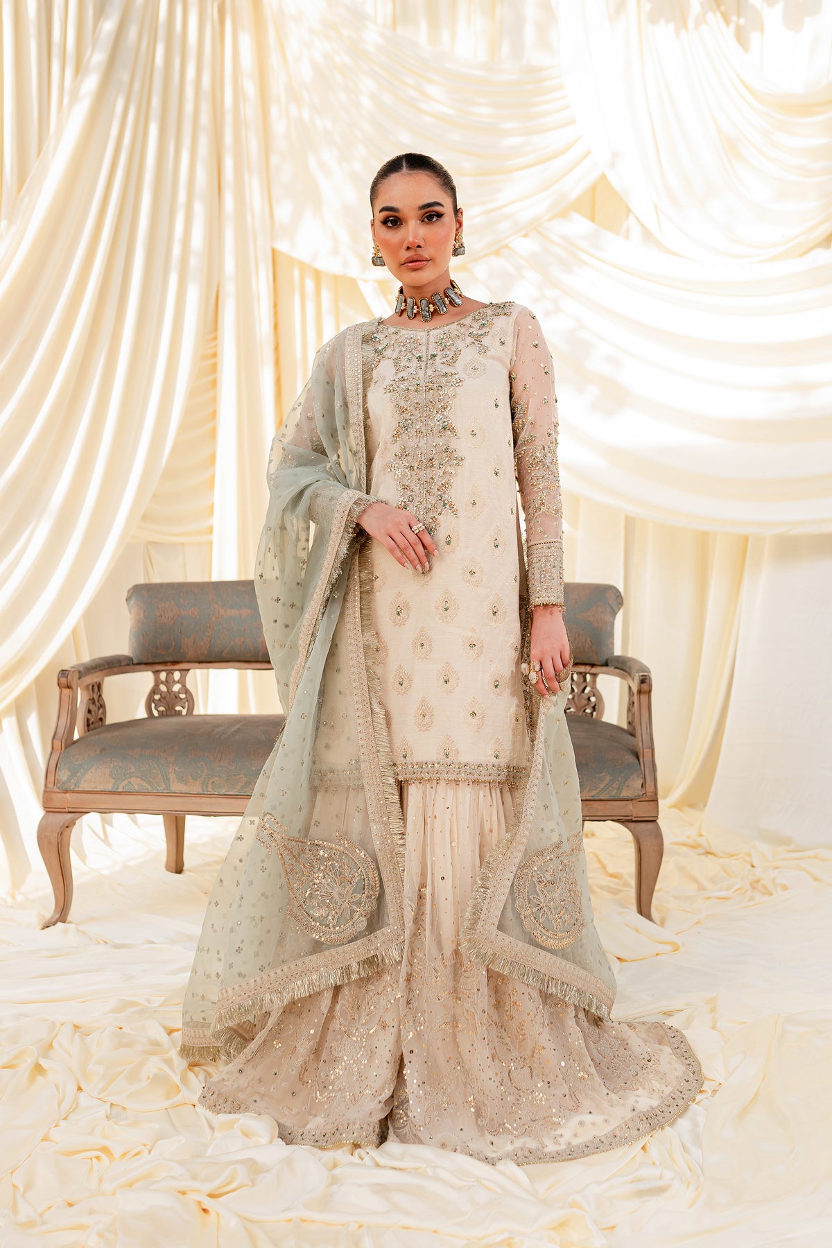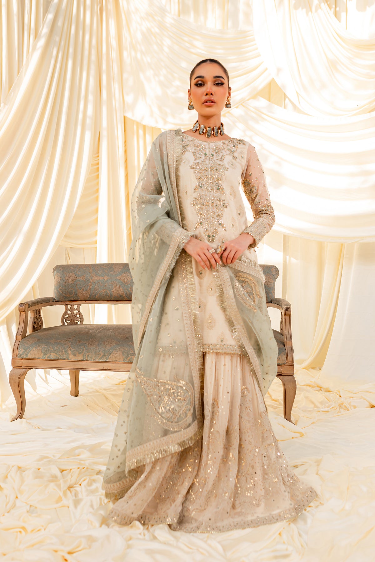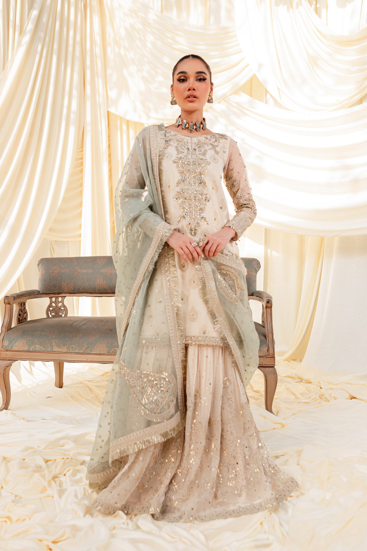 Unveil the secrets of eastern opulence, Husna displays soft and shimmery shades on traditional gharara cut. Style this ensemble with traditional jewelry to make your look stand out.