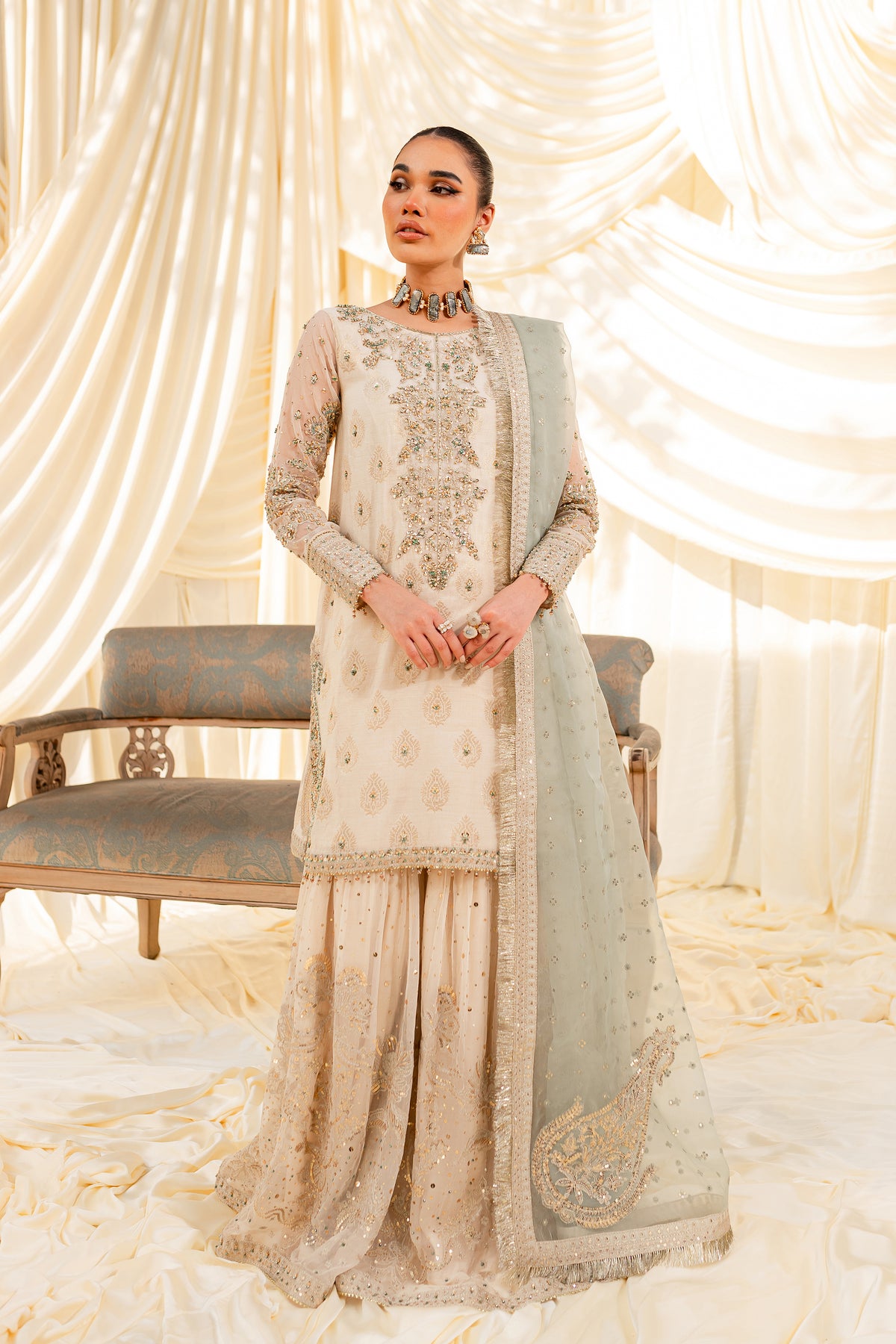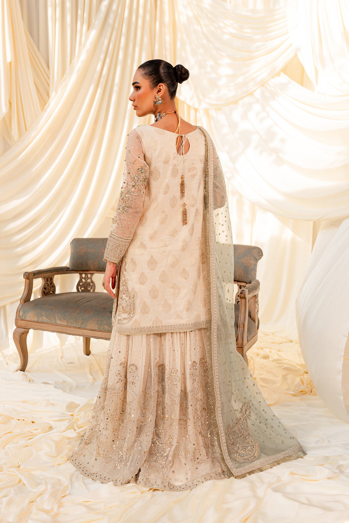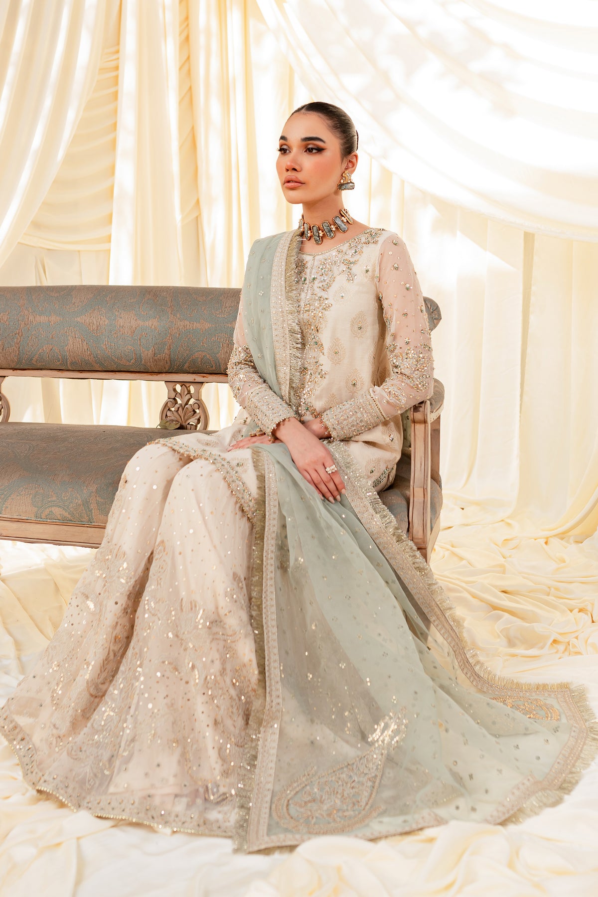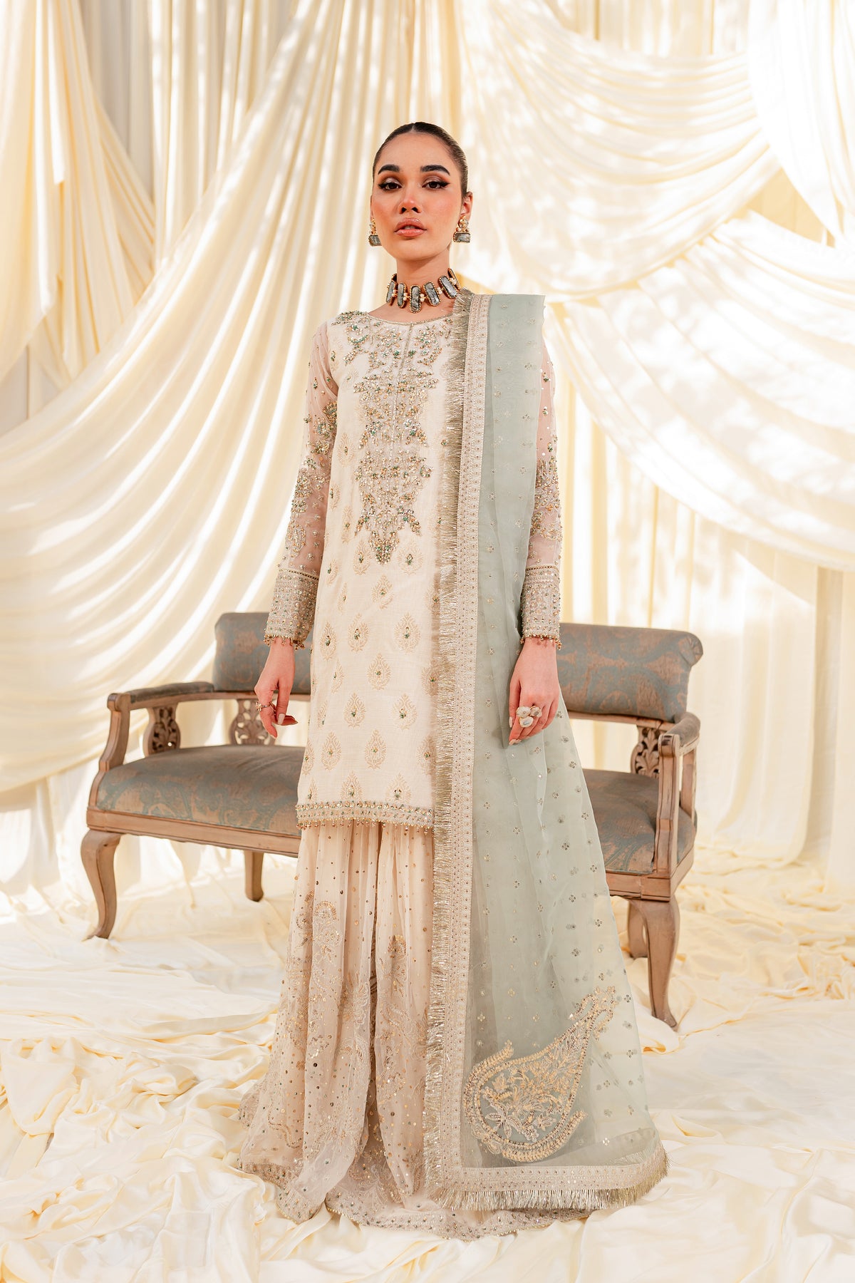 Unveil the secrets of eastern opulence, Husna displays soft and shimmery shades on traditional gharara cut. Style this ensemble with traditional jewelry to make your look stand out.