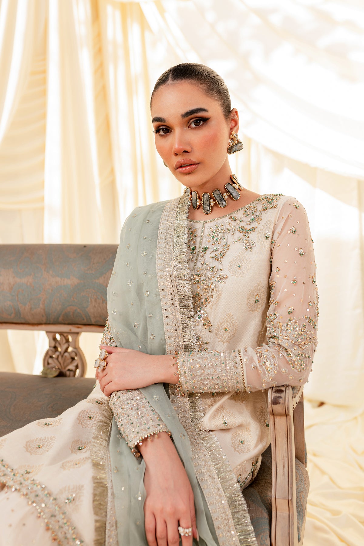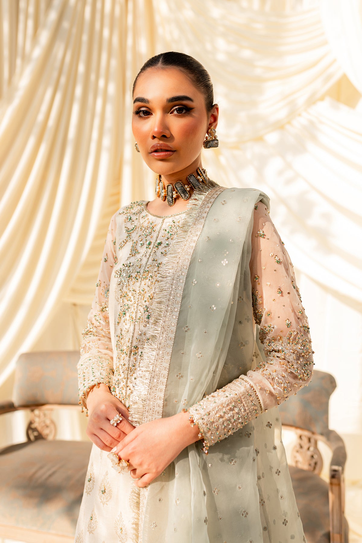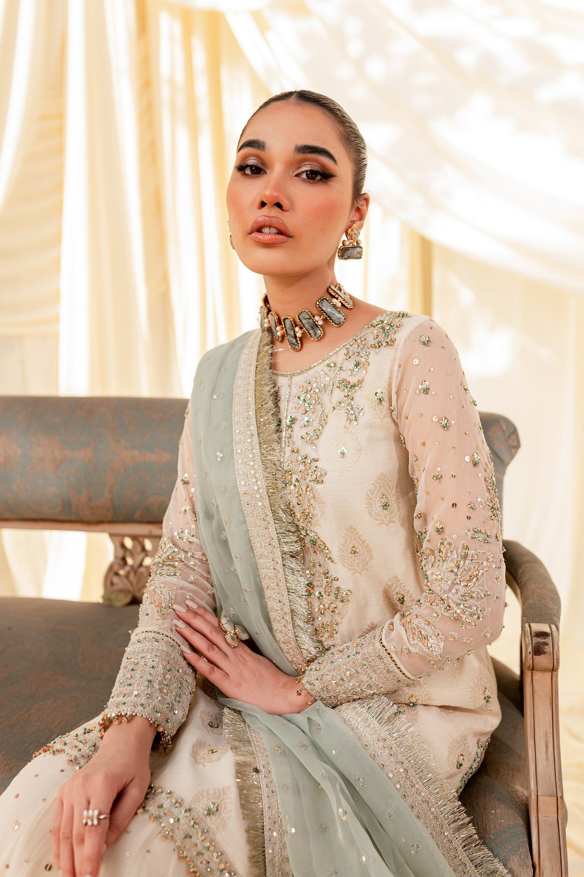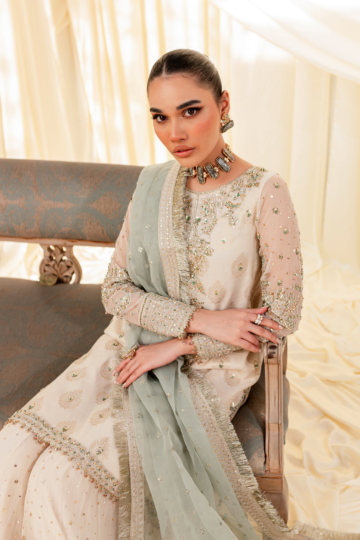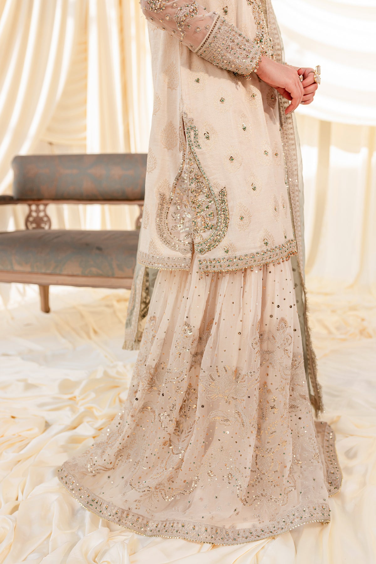 Unveil the secrets of eastern opulence, Husna displays soft and shimmery shades on traditional gharara cut. Style this ensemble with traditional jewelry to make your look stand out.