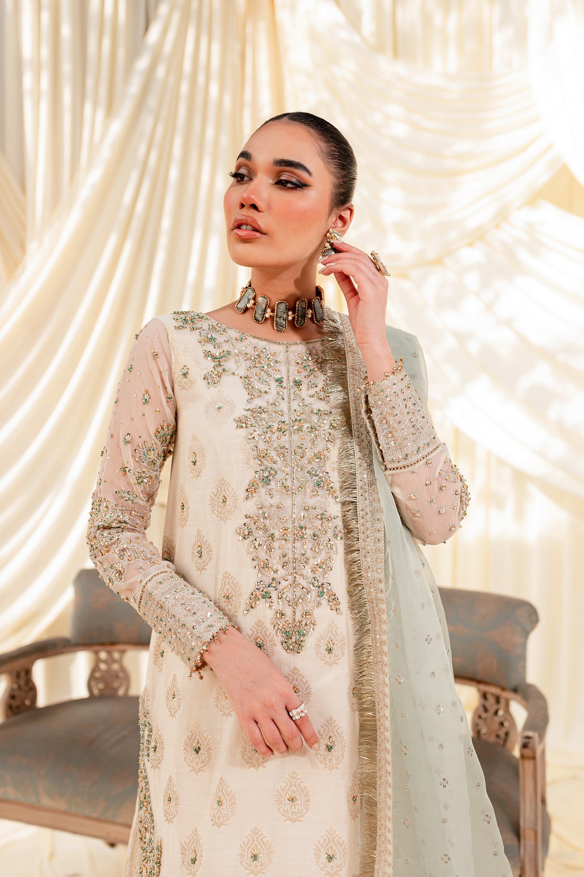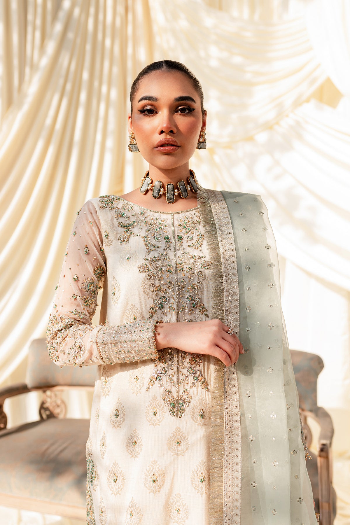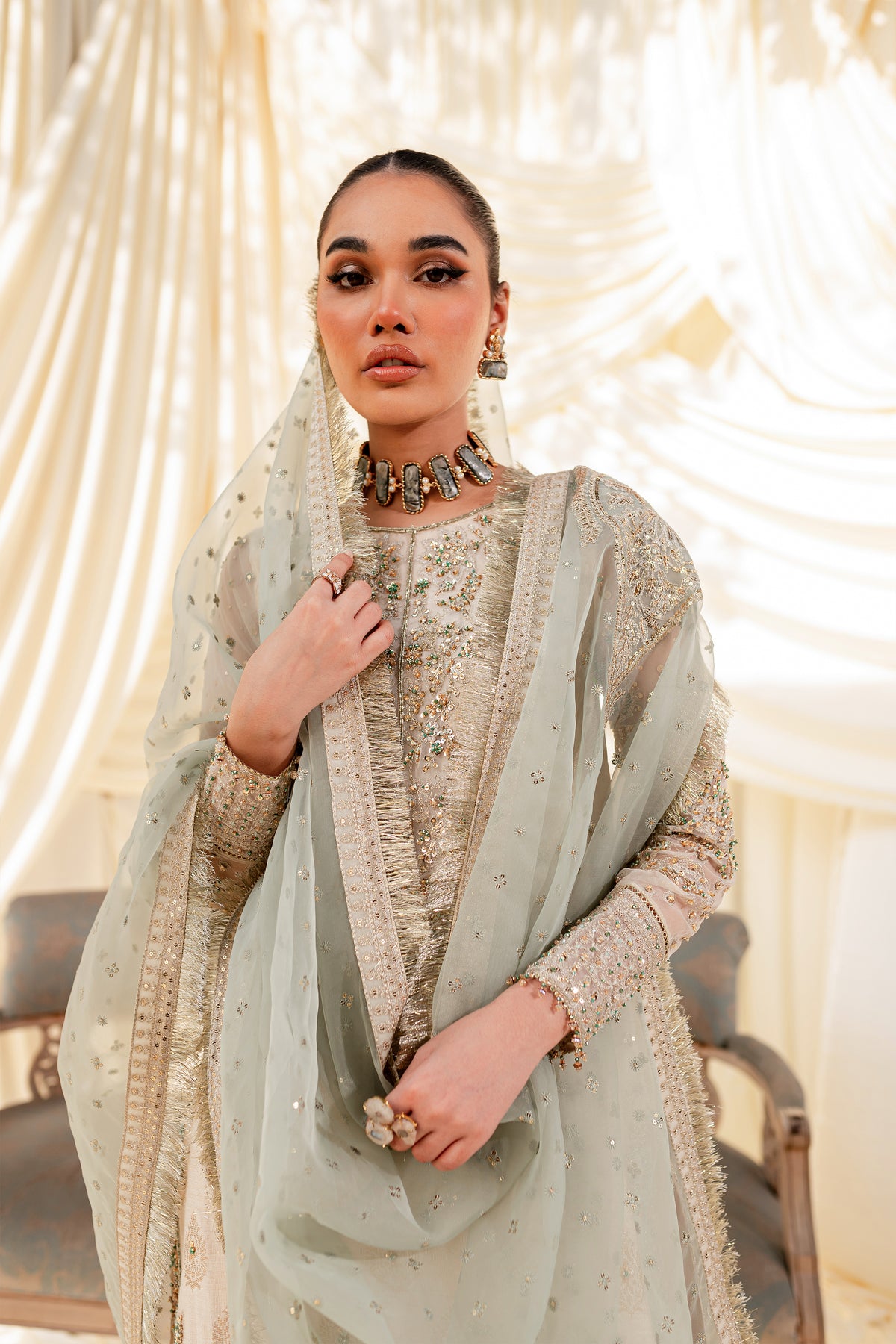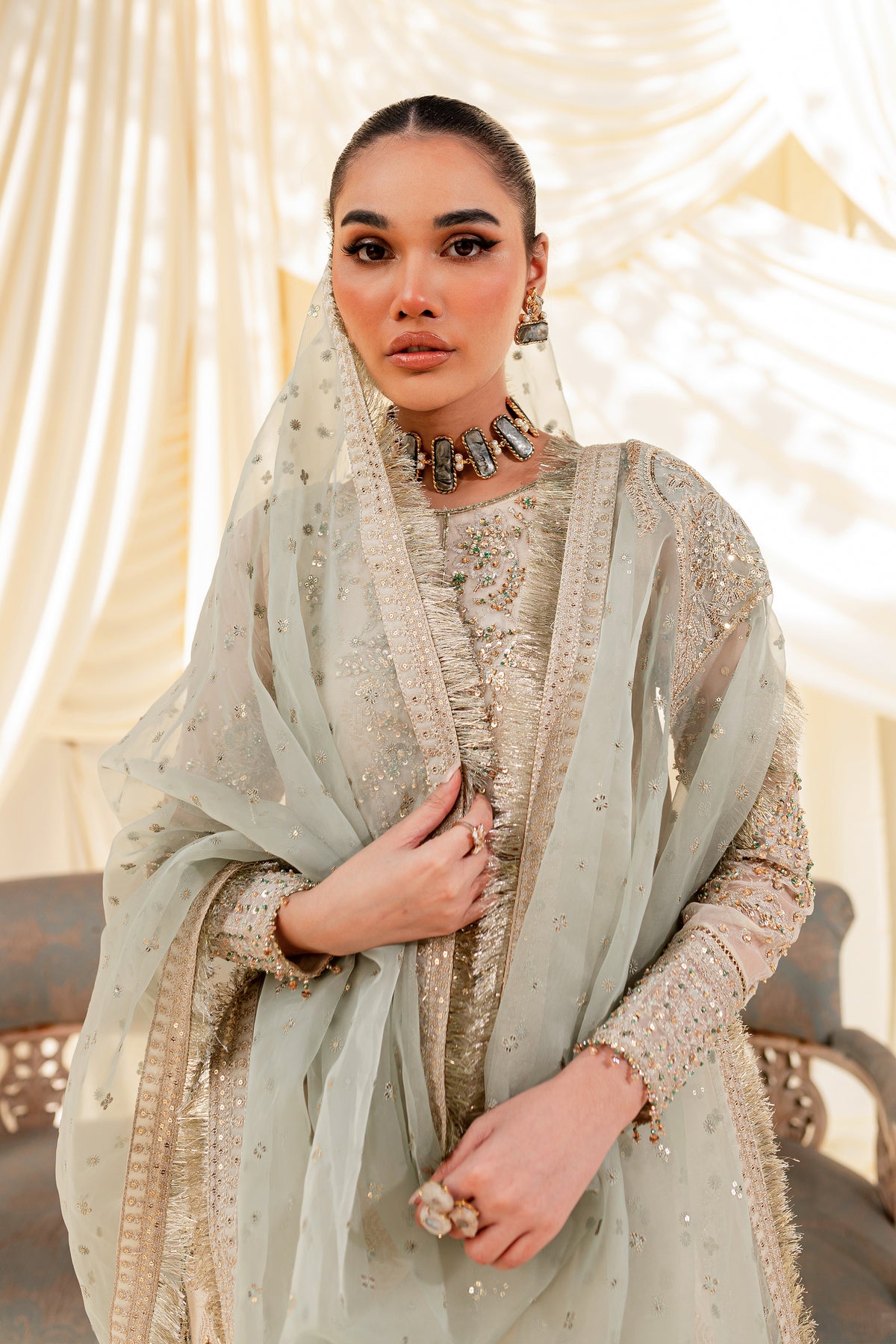 Unveil the secrets of eastern opulence, Husna displays soft and shimmery shades on traditional gharara cut. Style this ensemble with traditional jewelry to make your look stand out.