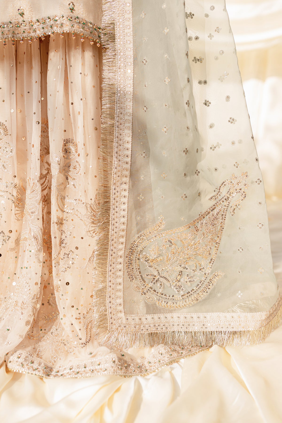 Premium quality organza dupatta in contrasting color with border details on all four sides and a composed motif placed at each corner, touched up with lace detailing.
