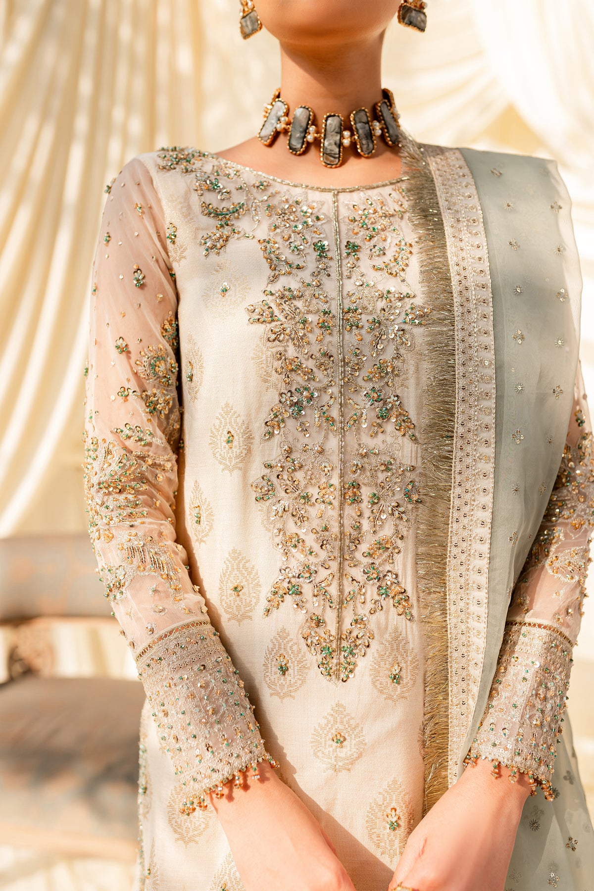 Paired with embroidered crinkle gharara displaying adda work and detailed border at hem – finished with lace detailing.
