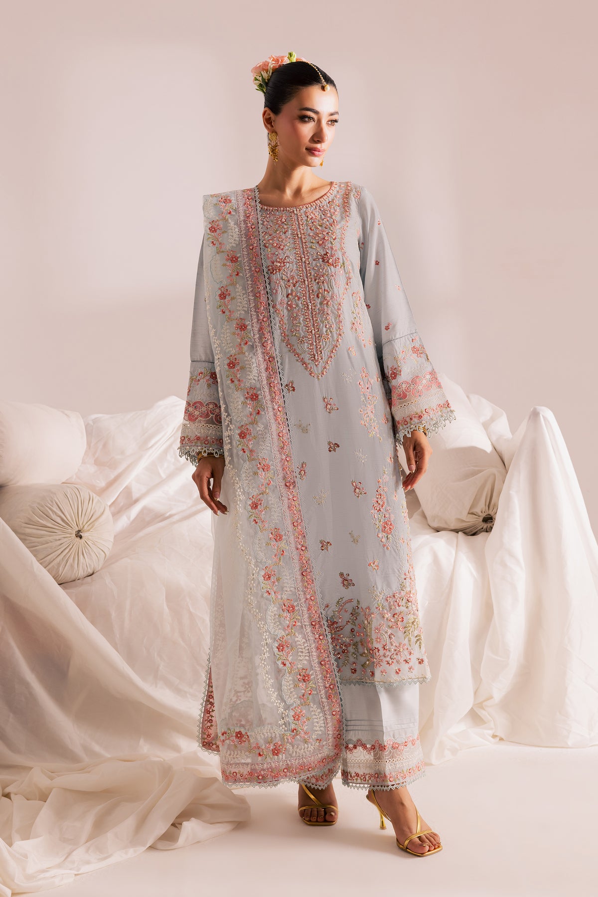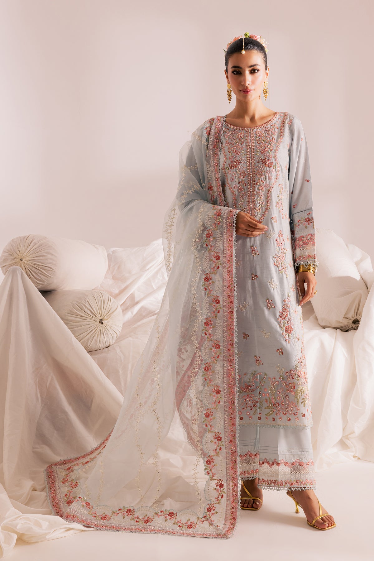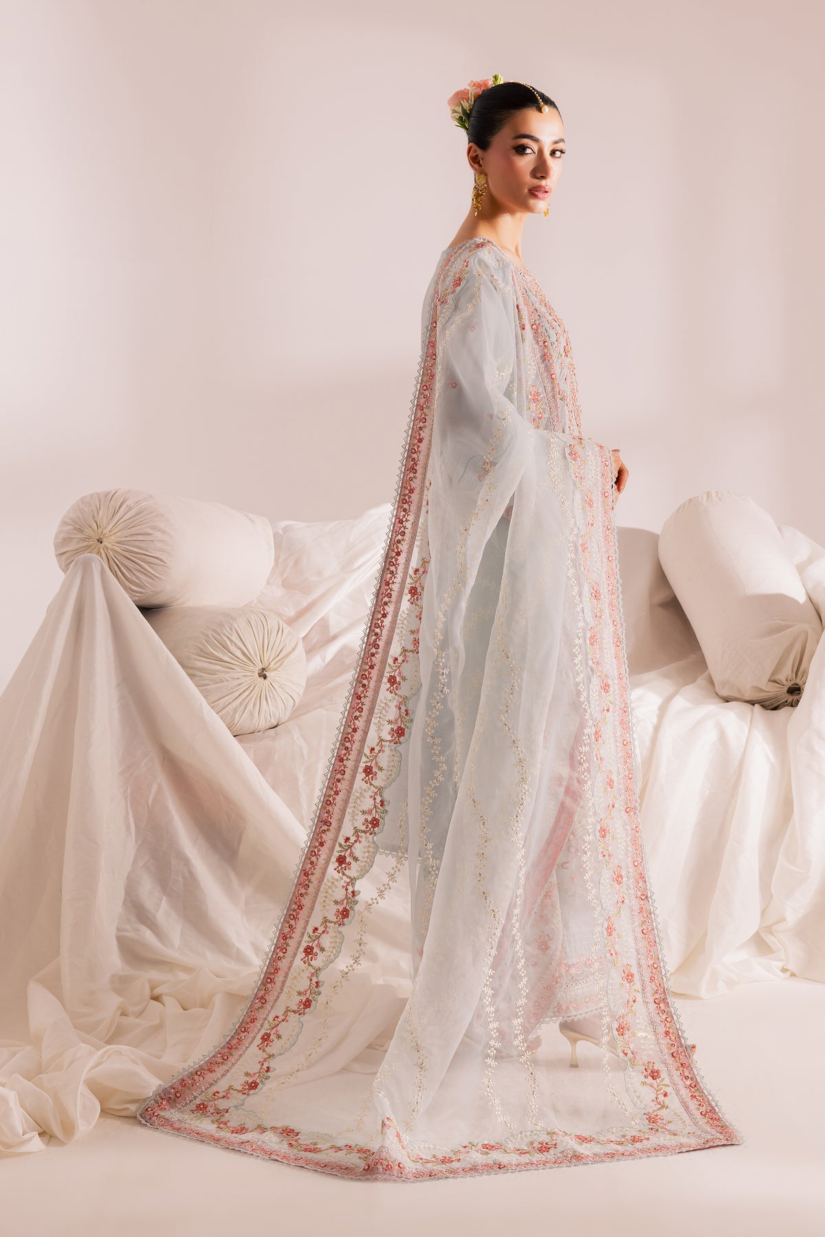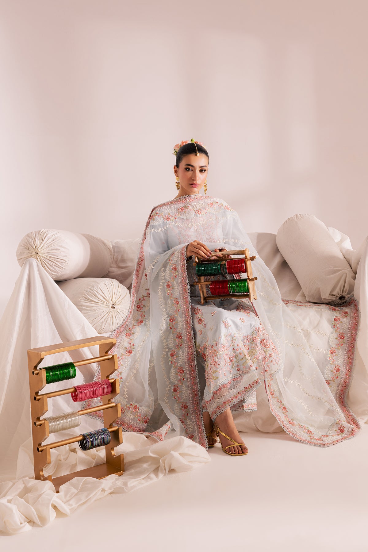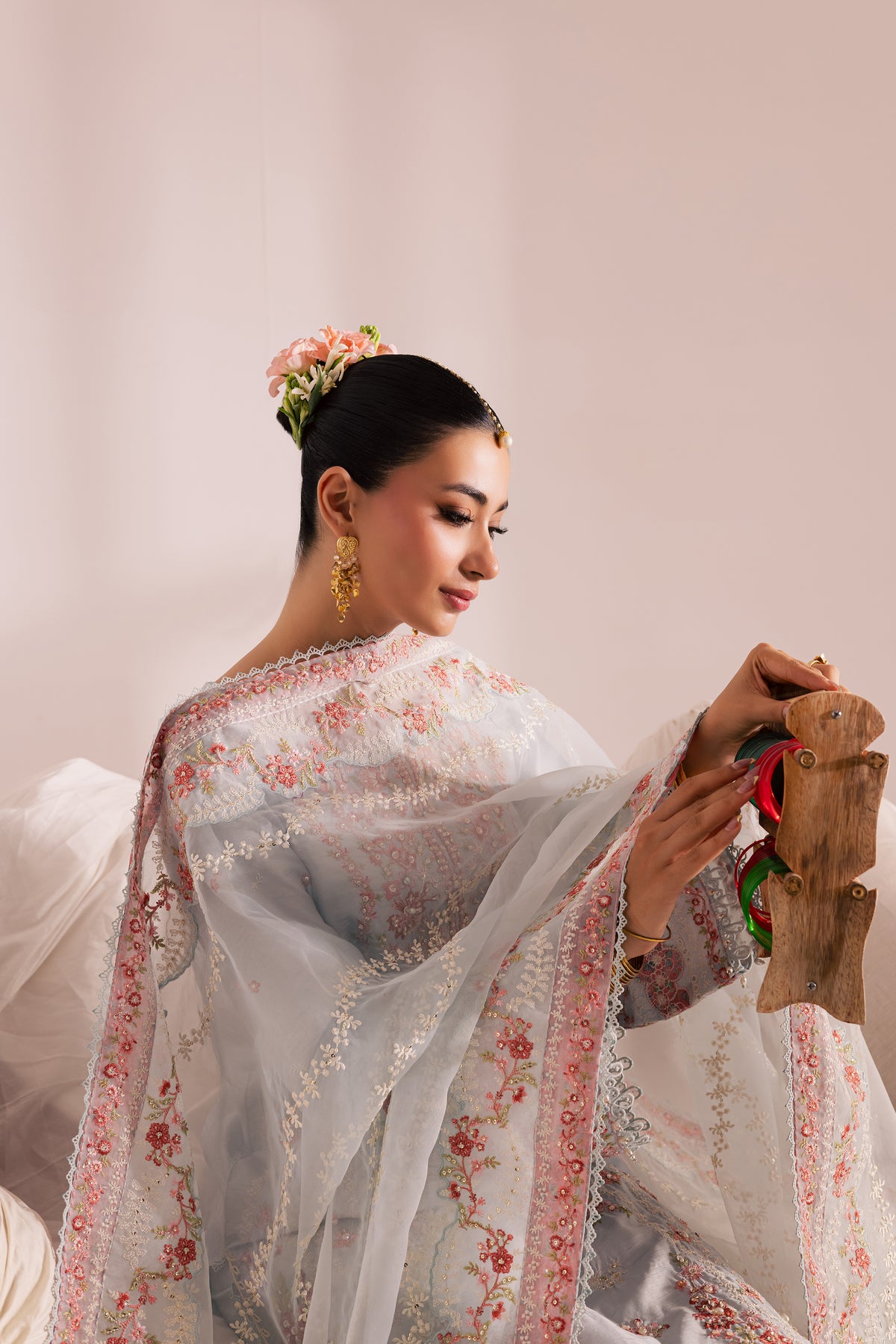 An organza dupatta completes the outfit, adorned with linear sequin embroidery at the center, floral borders on all sides, lace edging, and printed facings for a graceful finish.