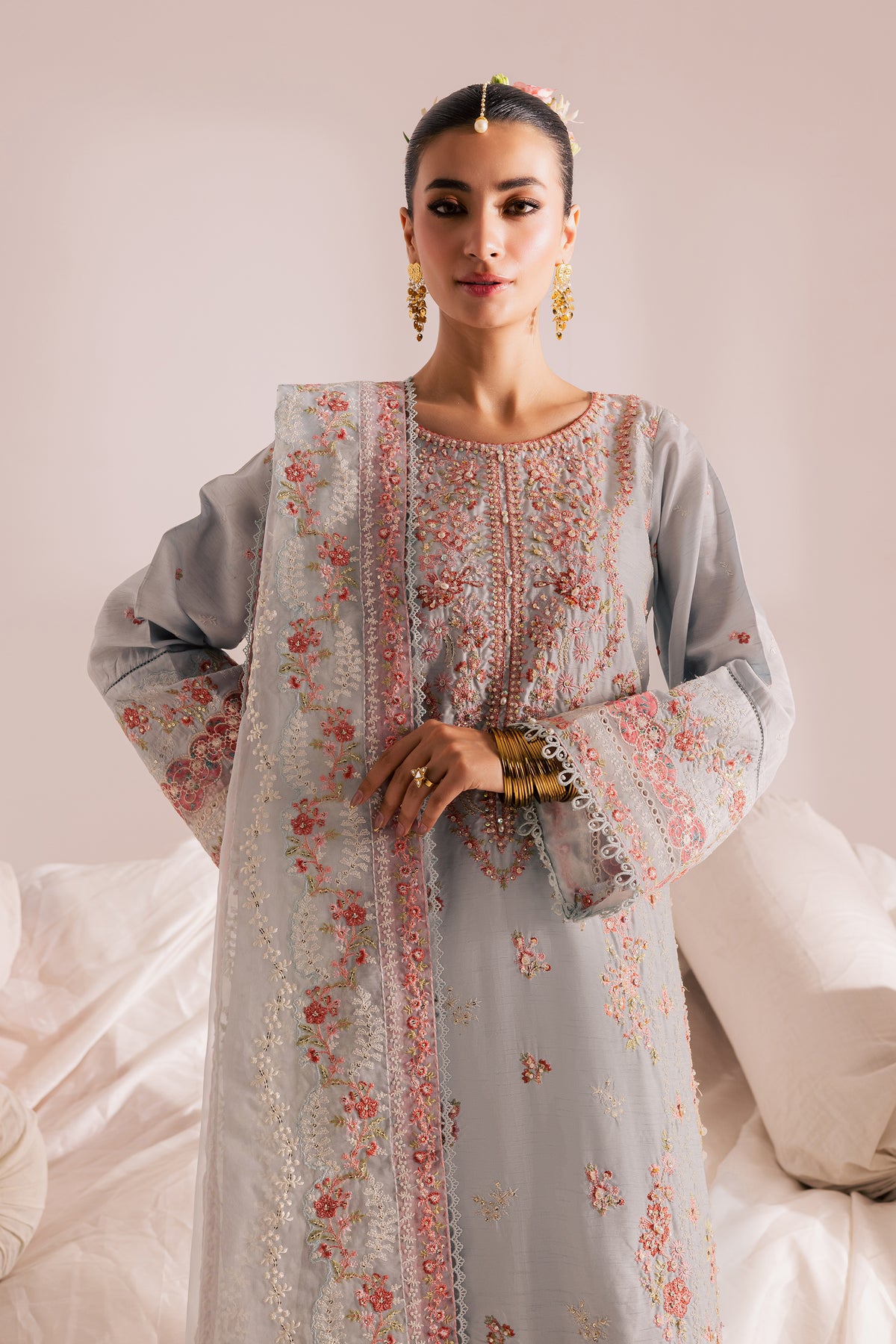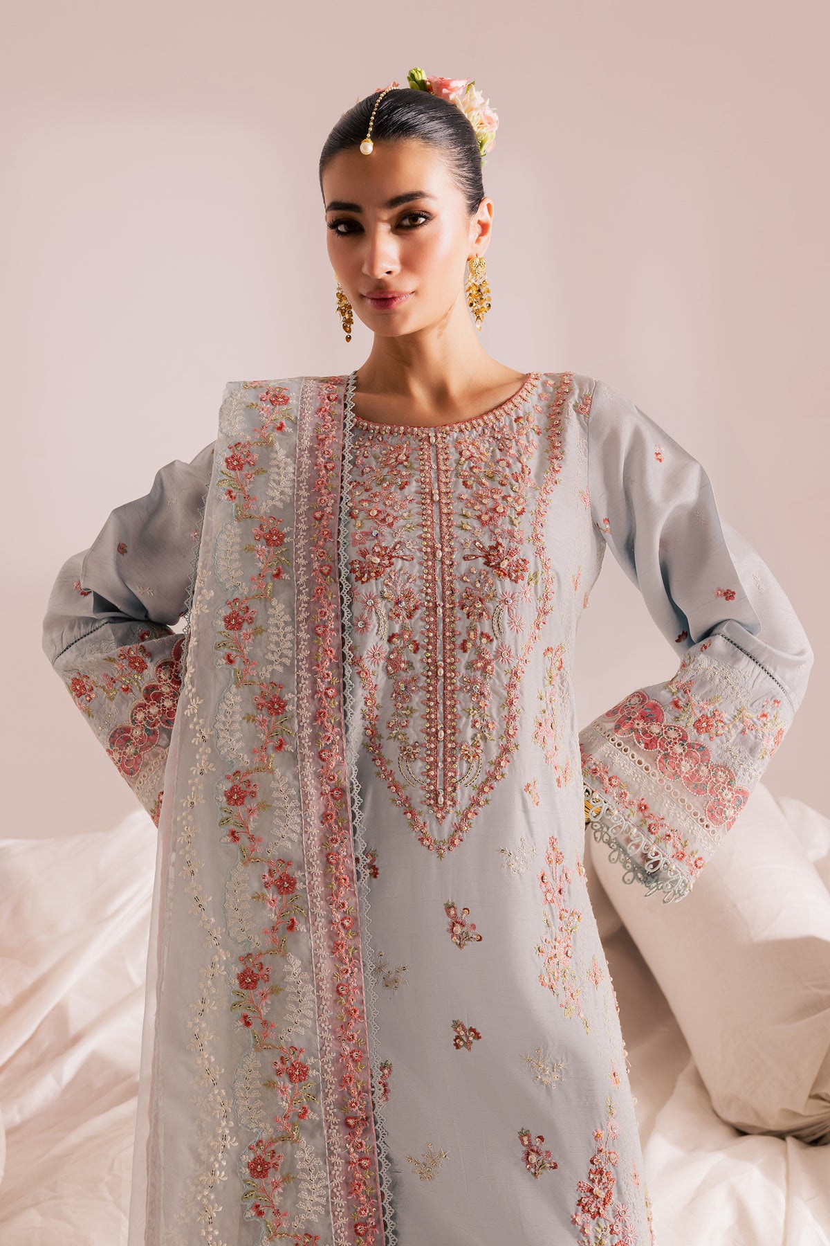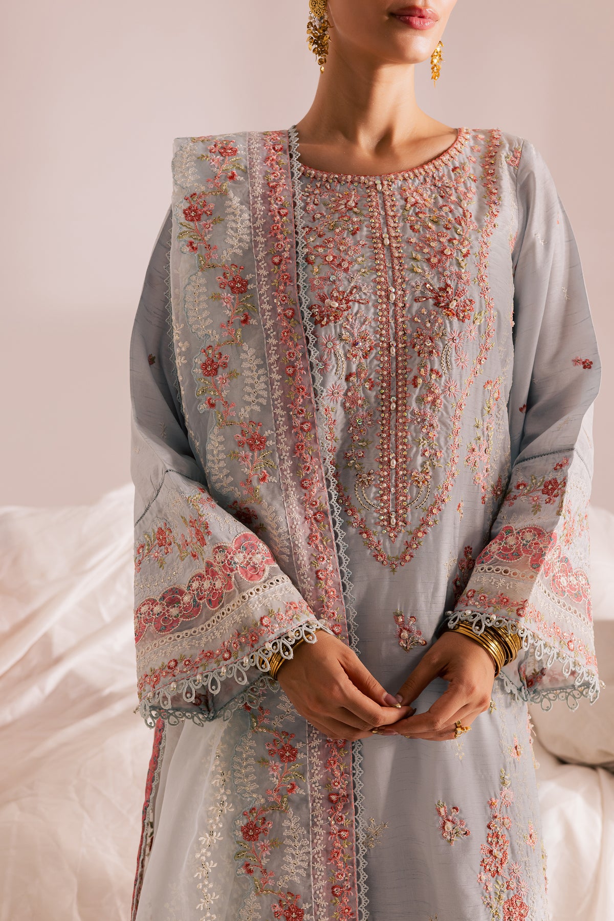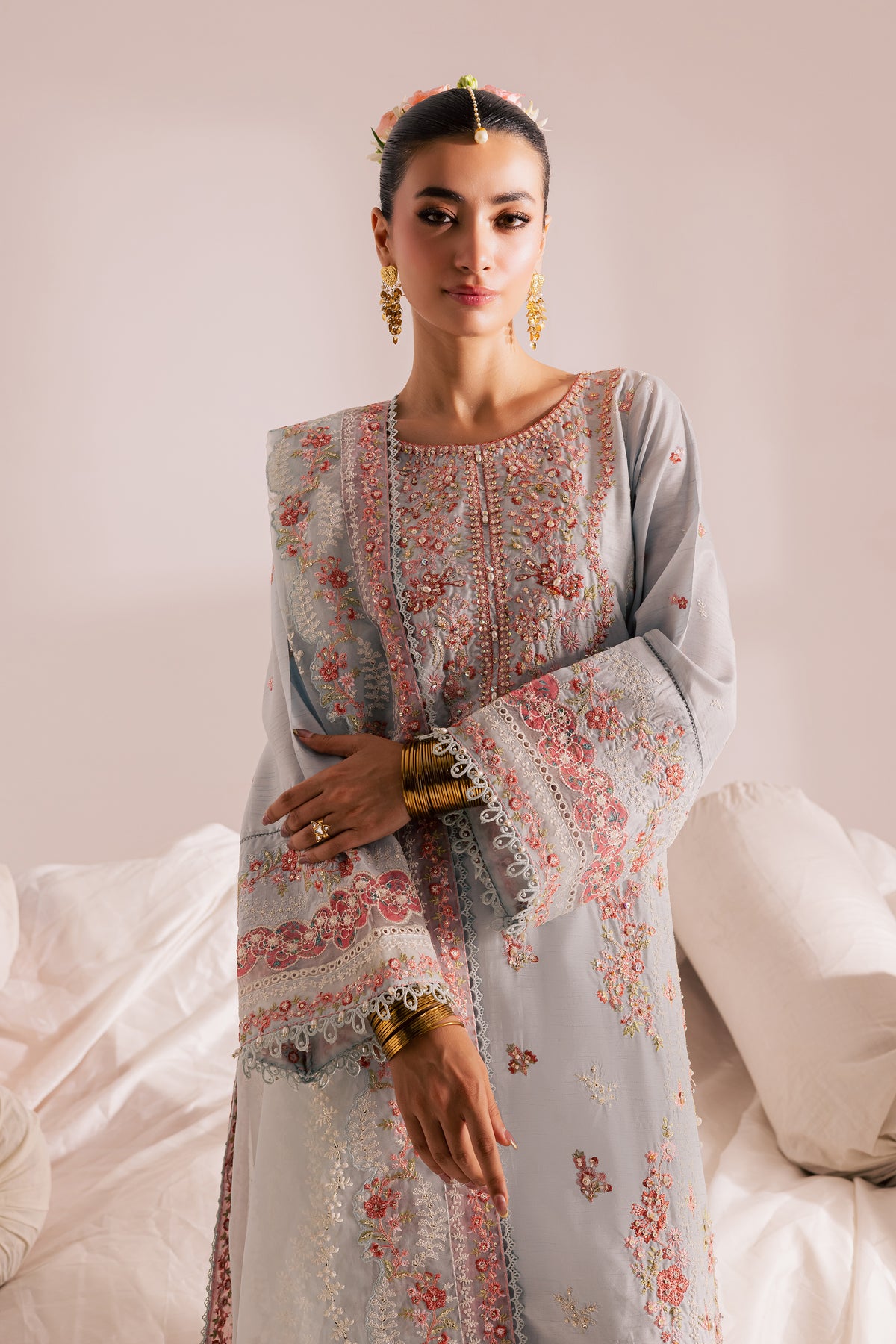 This refined ensemble in pastel blue korean raw silk, featuring a long shirt with a round composed hem and an intricately designed front. The neckline showcases a floral composition, elevated with hand embellishments using pearls and mixed materials for a rich, textured finish. The open-hem sleeves are embroidered and detailed with printed border fabric manipulation and lace trimming. A fine lace finish enhances the shirt hem.