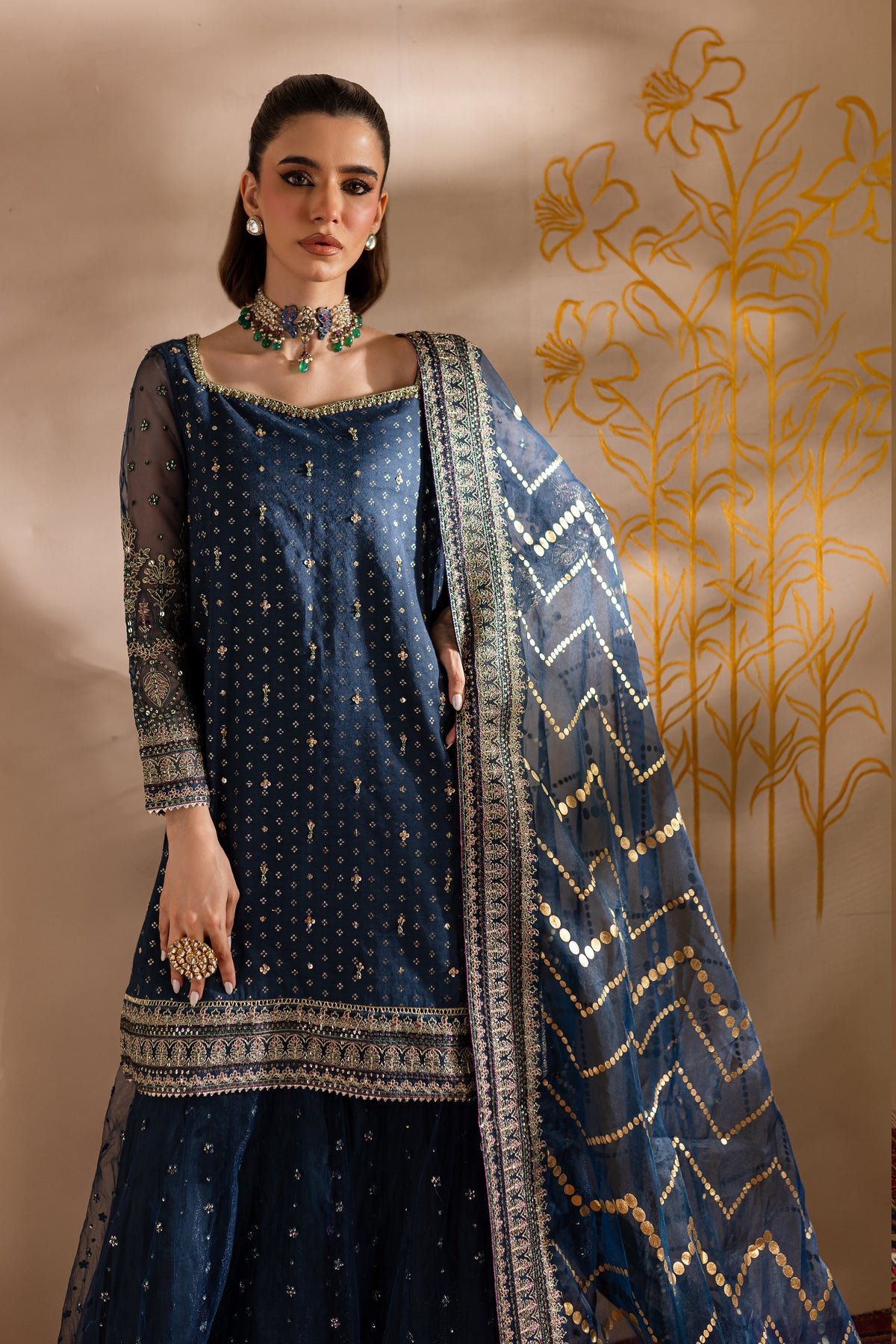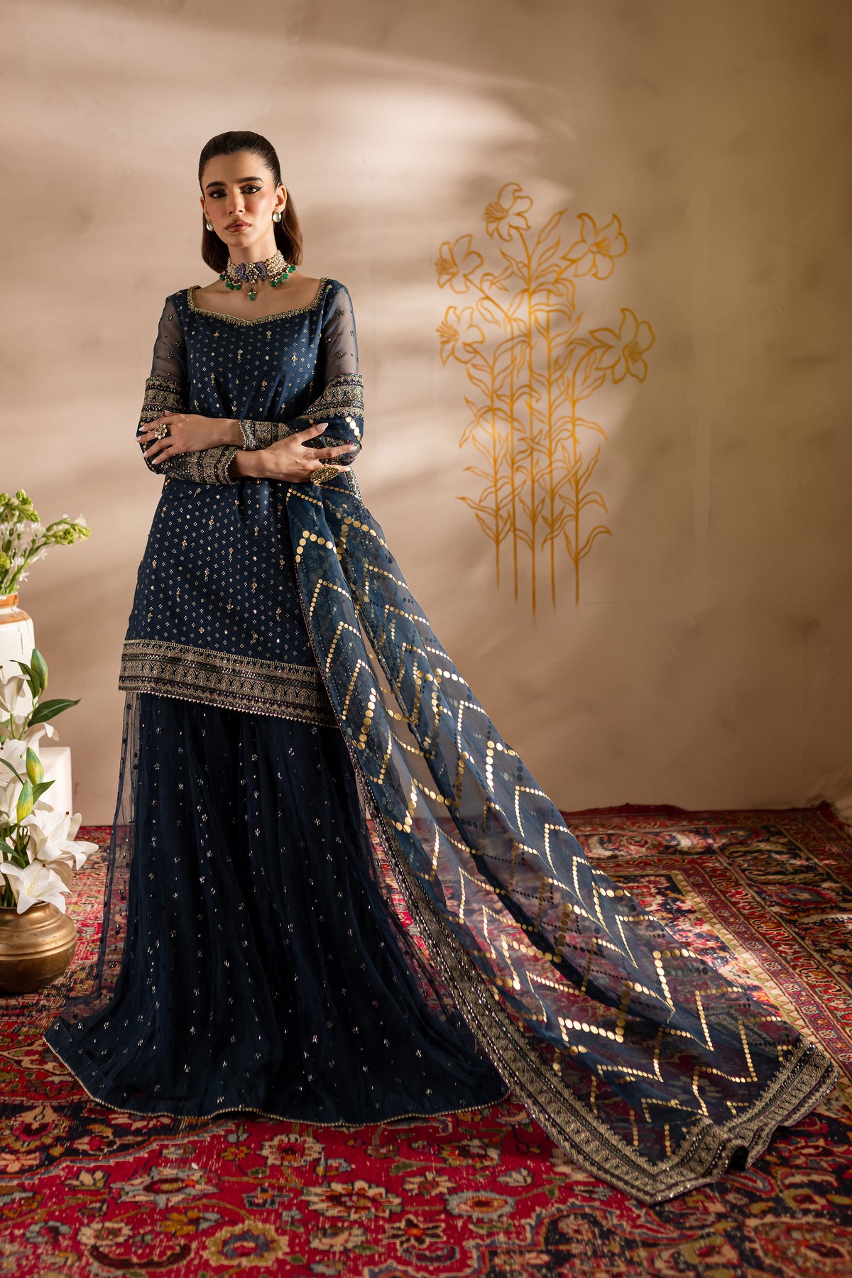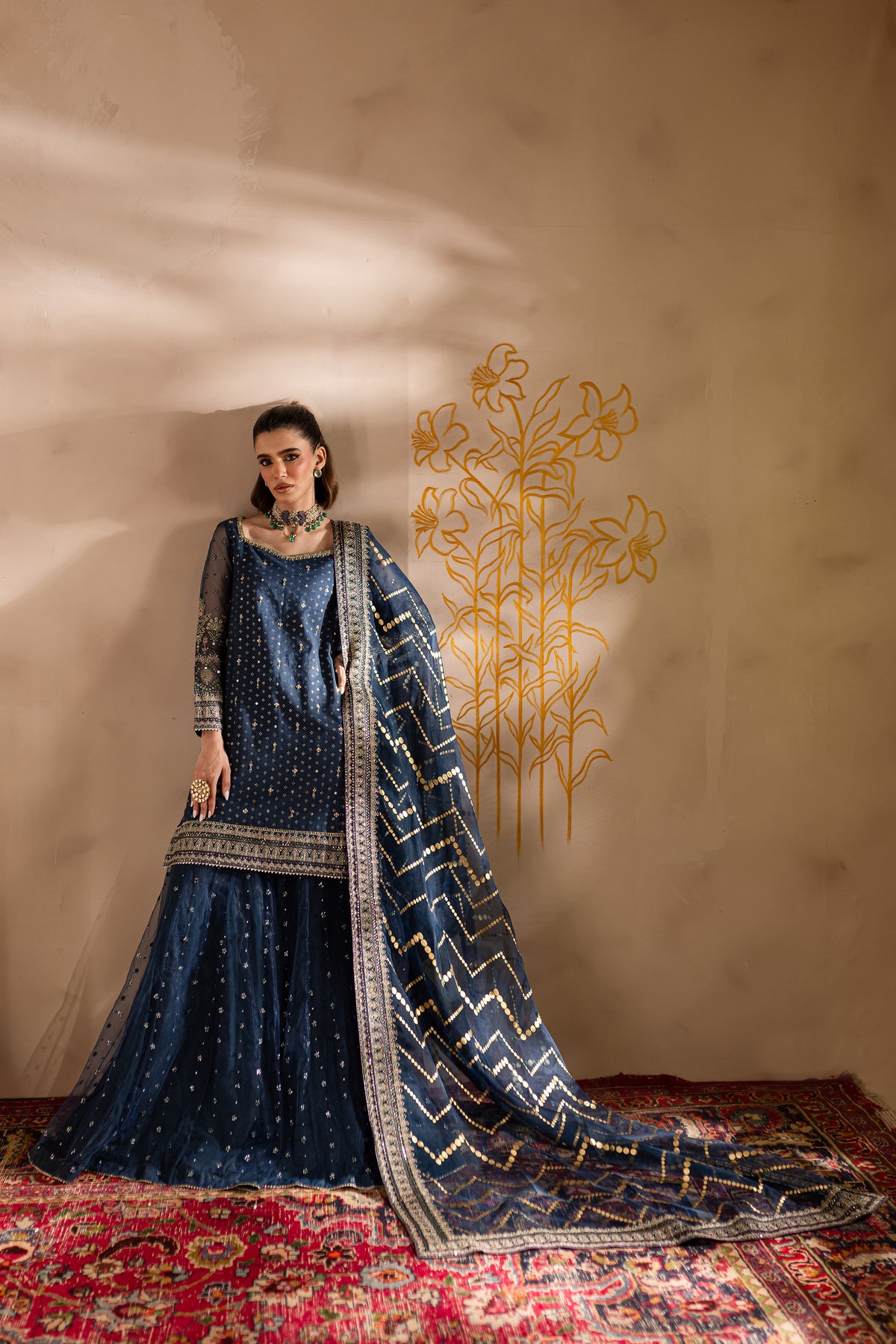 Paired with an embroidered net-paneled gharara, this set exudes a perfect blend of traditional charm and modern allure.