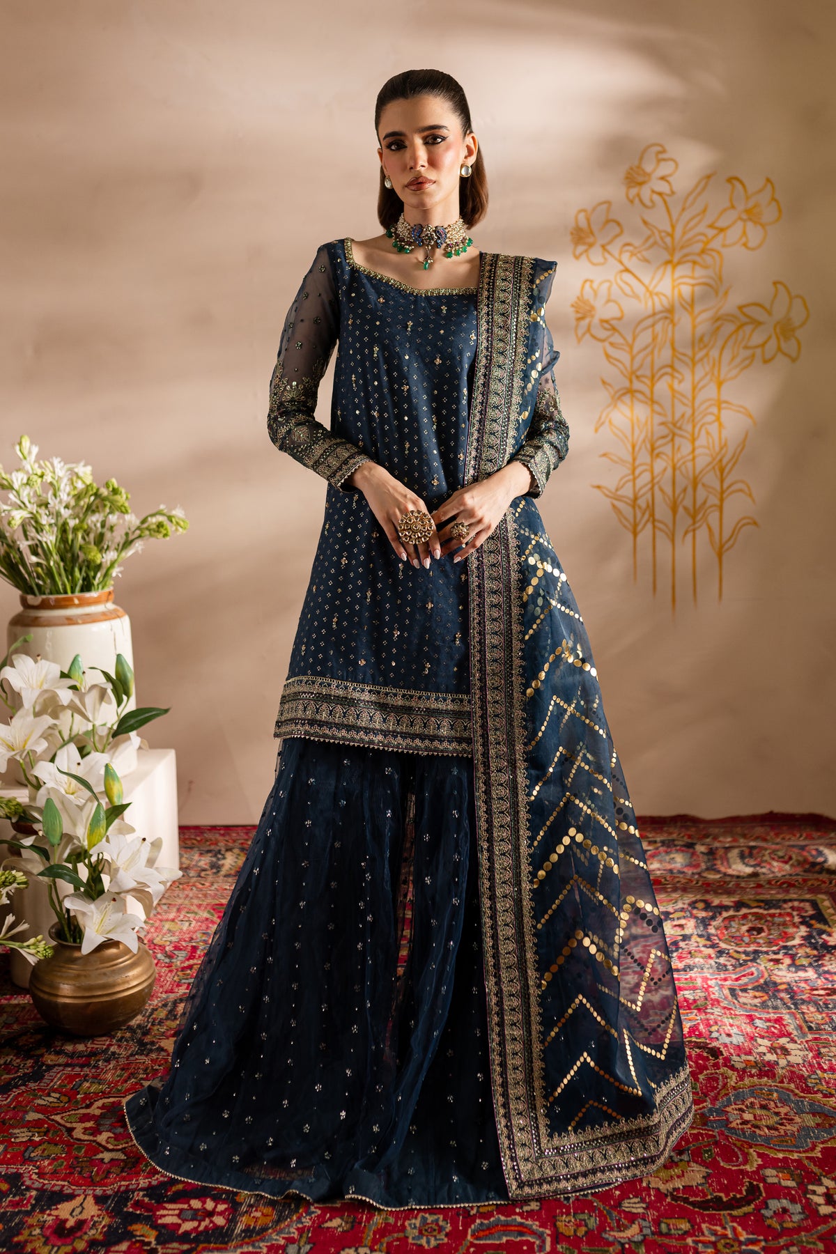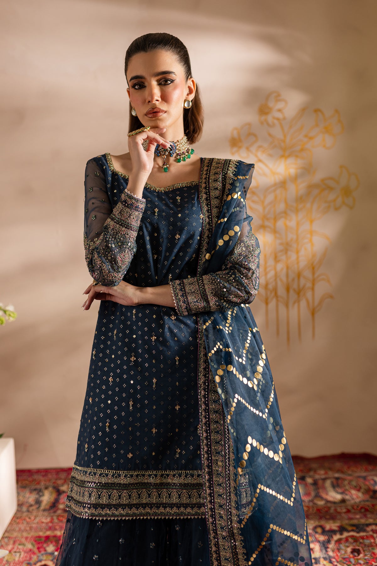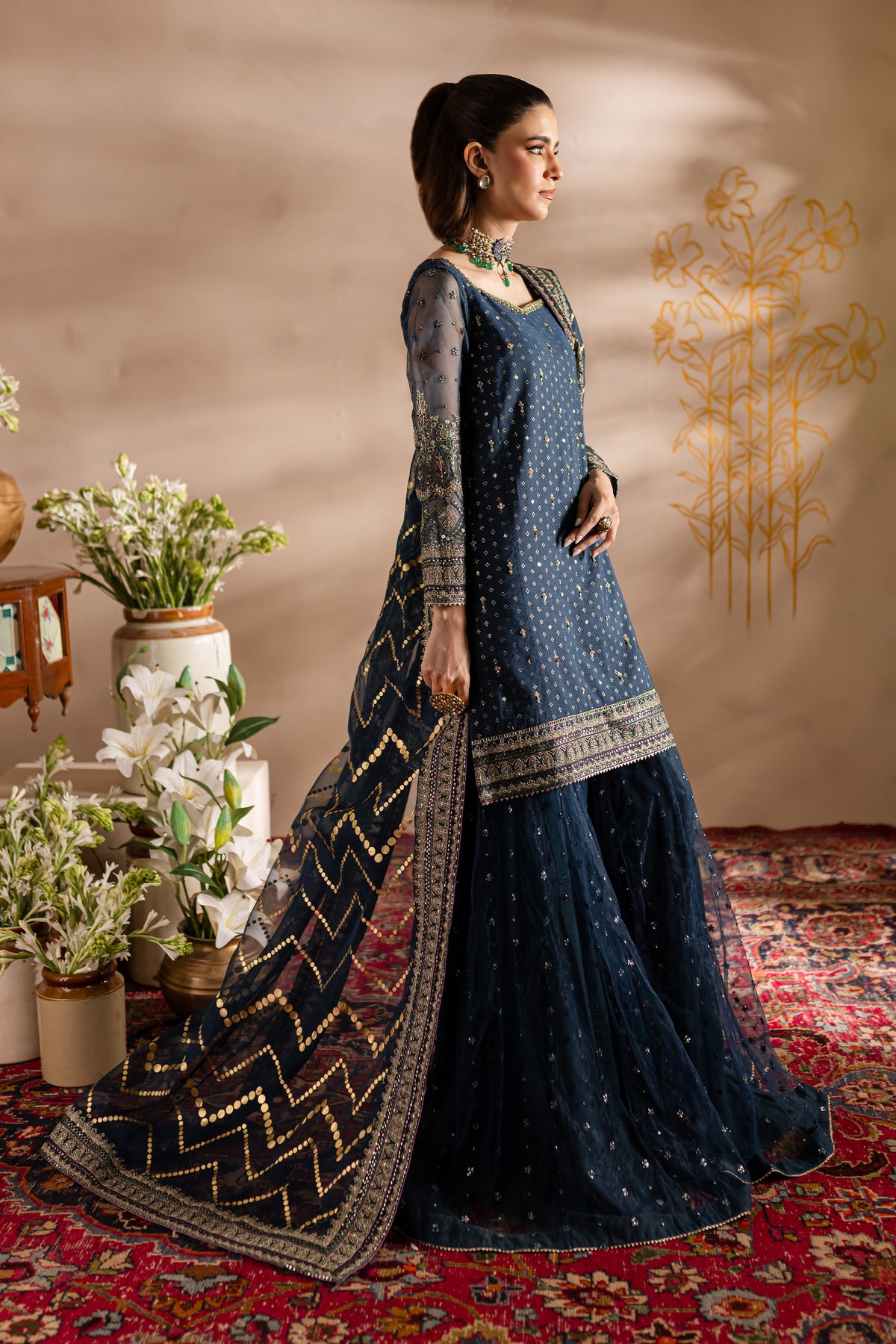 Paired with an embroidered net-paneled gharara, this set exudes a perfect blend of traditional charm and modern allure.