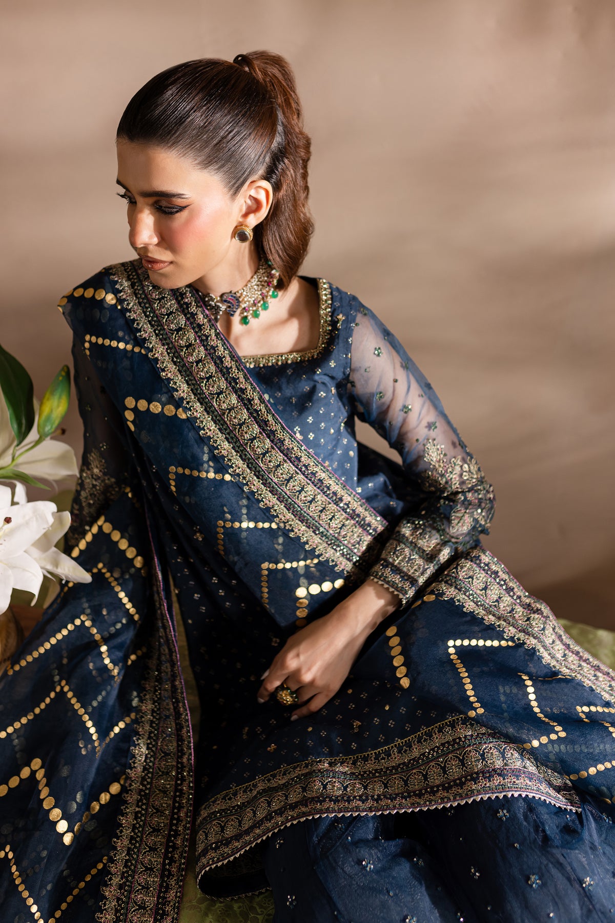 In an enchanting zinc color, the outfit is crafted to capture attention with its intricate details. The lawn zari shirt is adorned with adda spread across the front while a direct adda work accentuates the neckline bringing a unique design element. The shirt hem is bordered with elegance and the organza sleeves feature delicate embroidery with slight adda work for subtle sophistication. Each sleeve and the shirt hem are finished with samosa lace for an added touch of refinement.