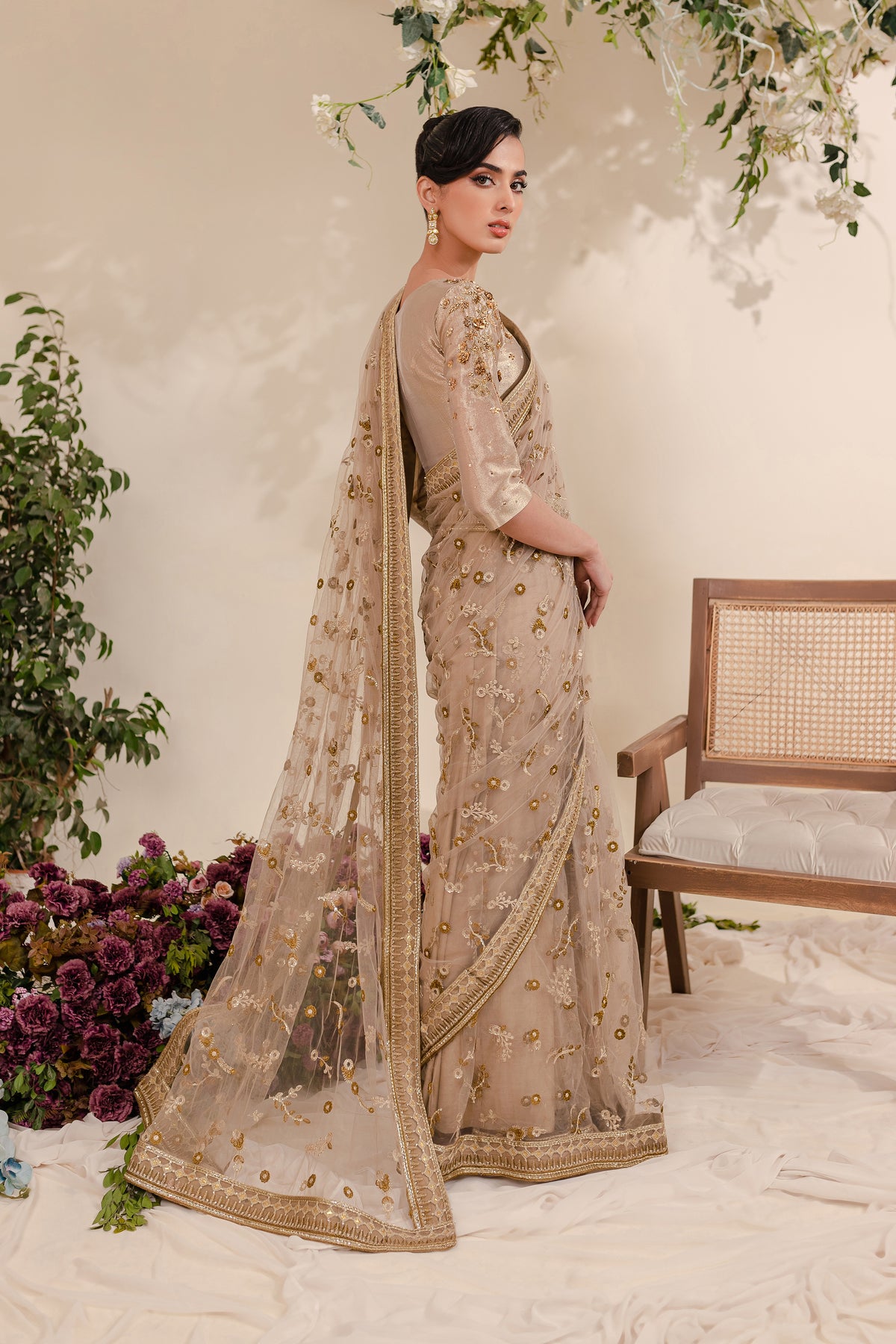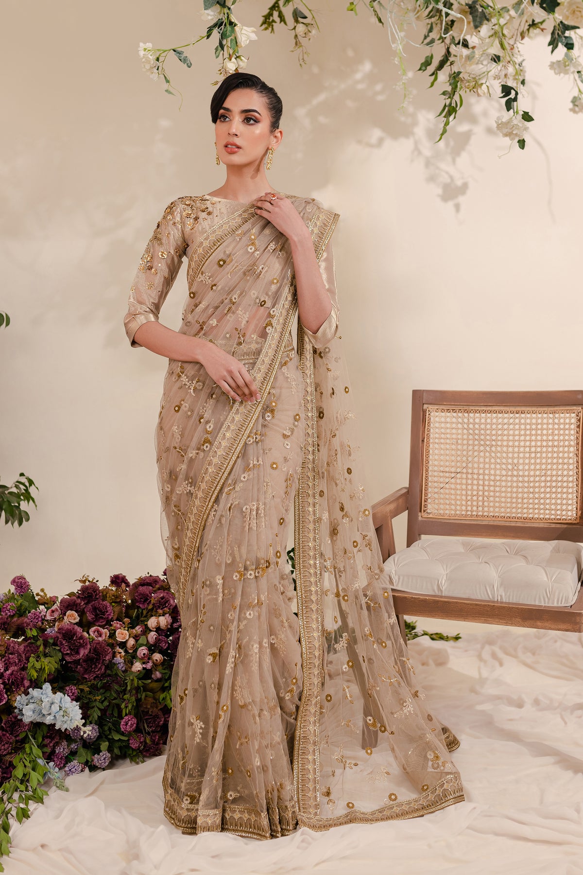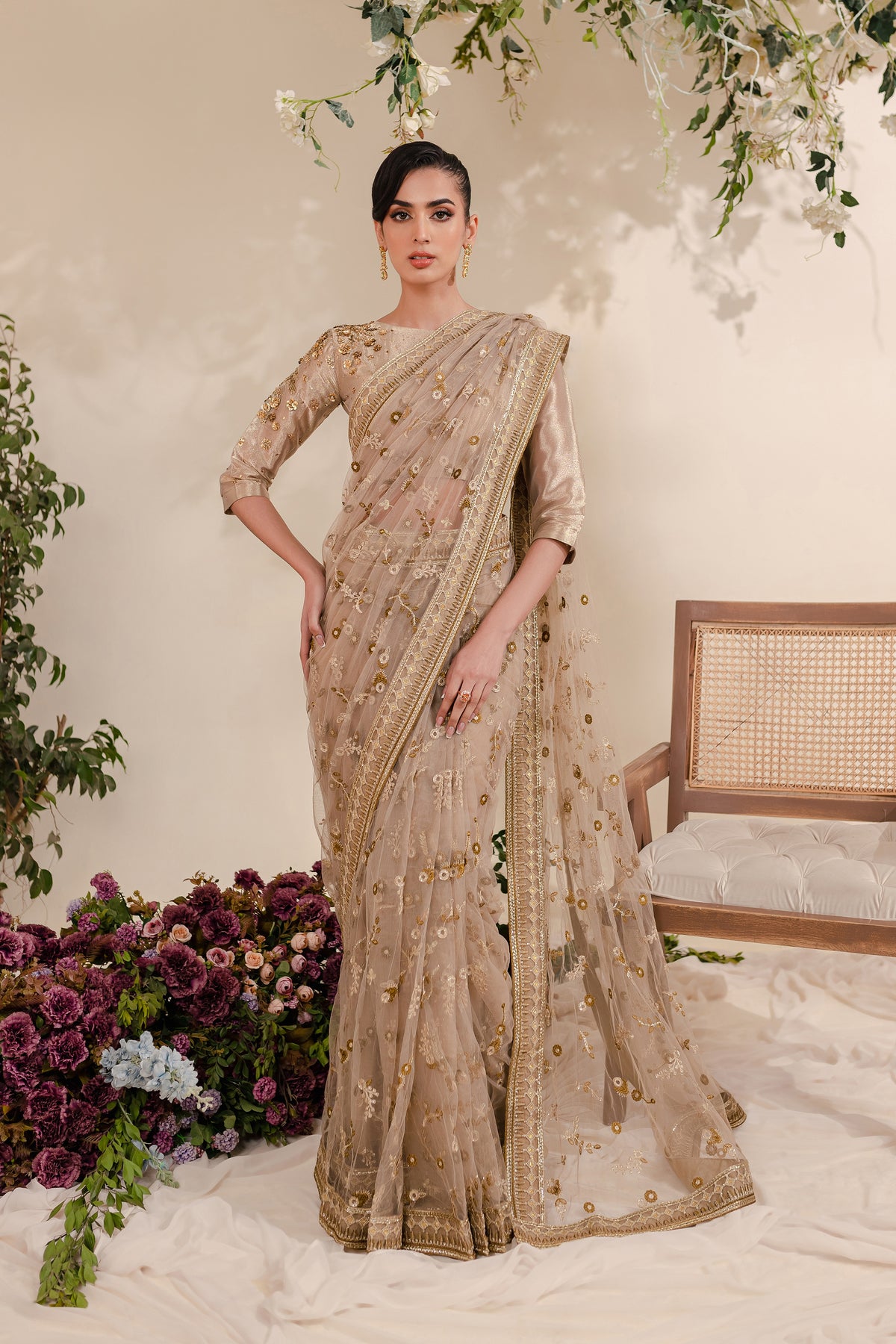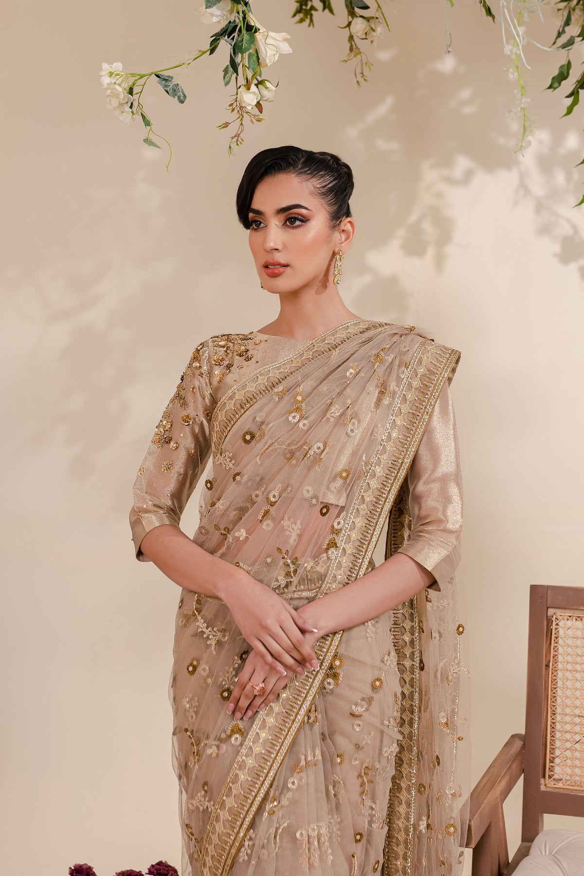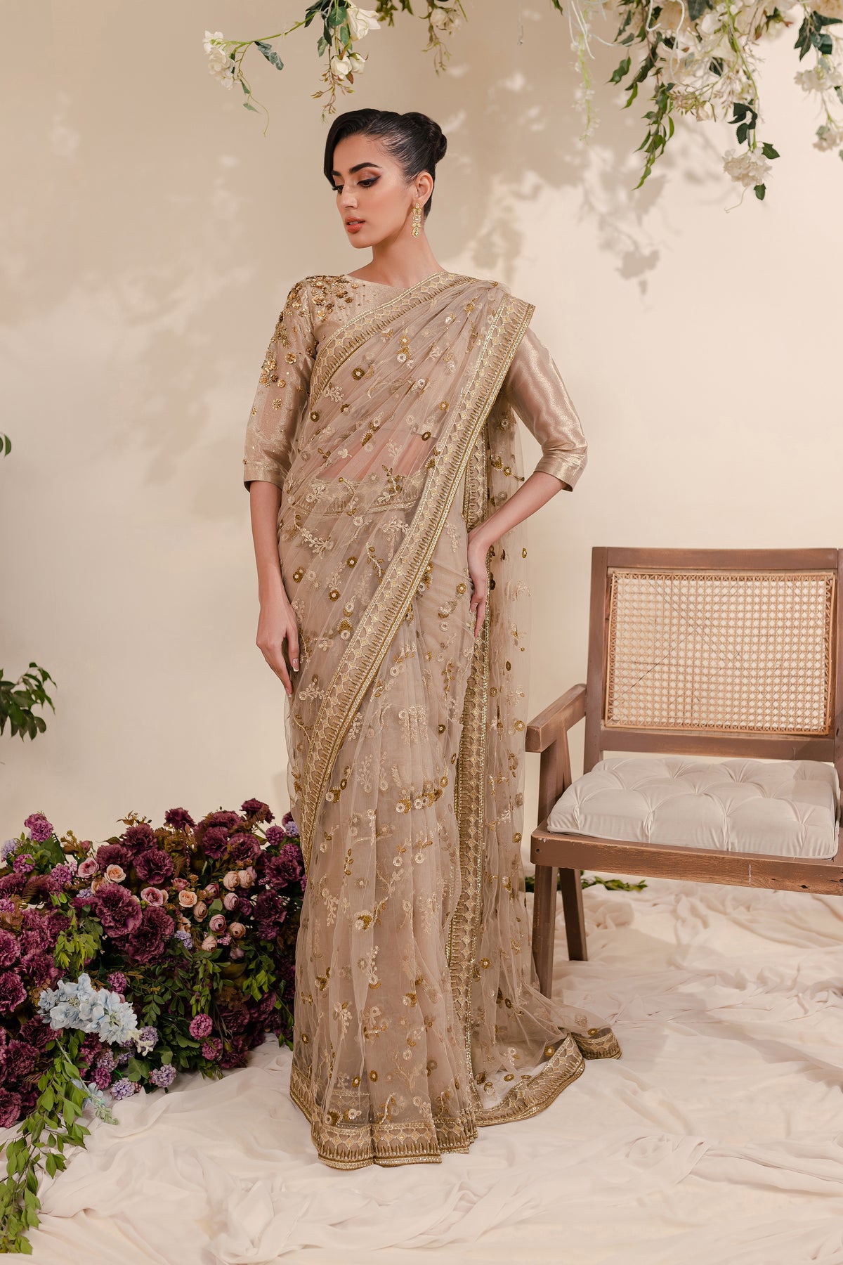 Heavily embroidered net saree composed with tilla embroidery and foil worked borders paired with self-colored petticoat