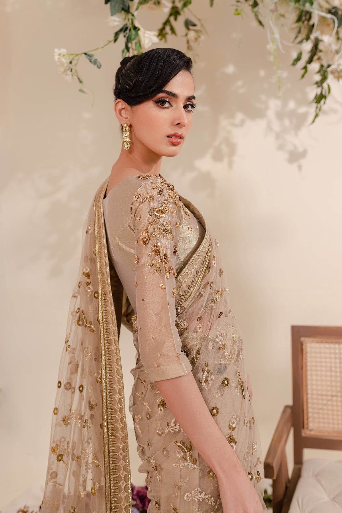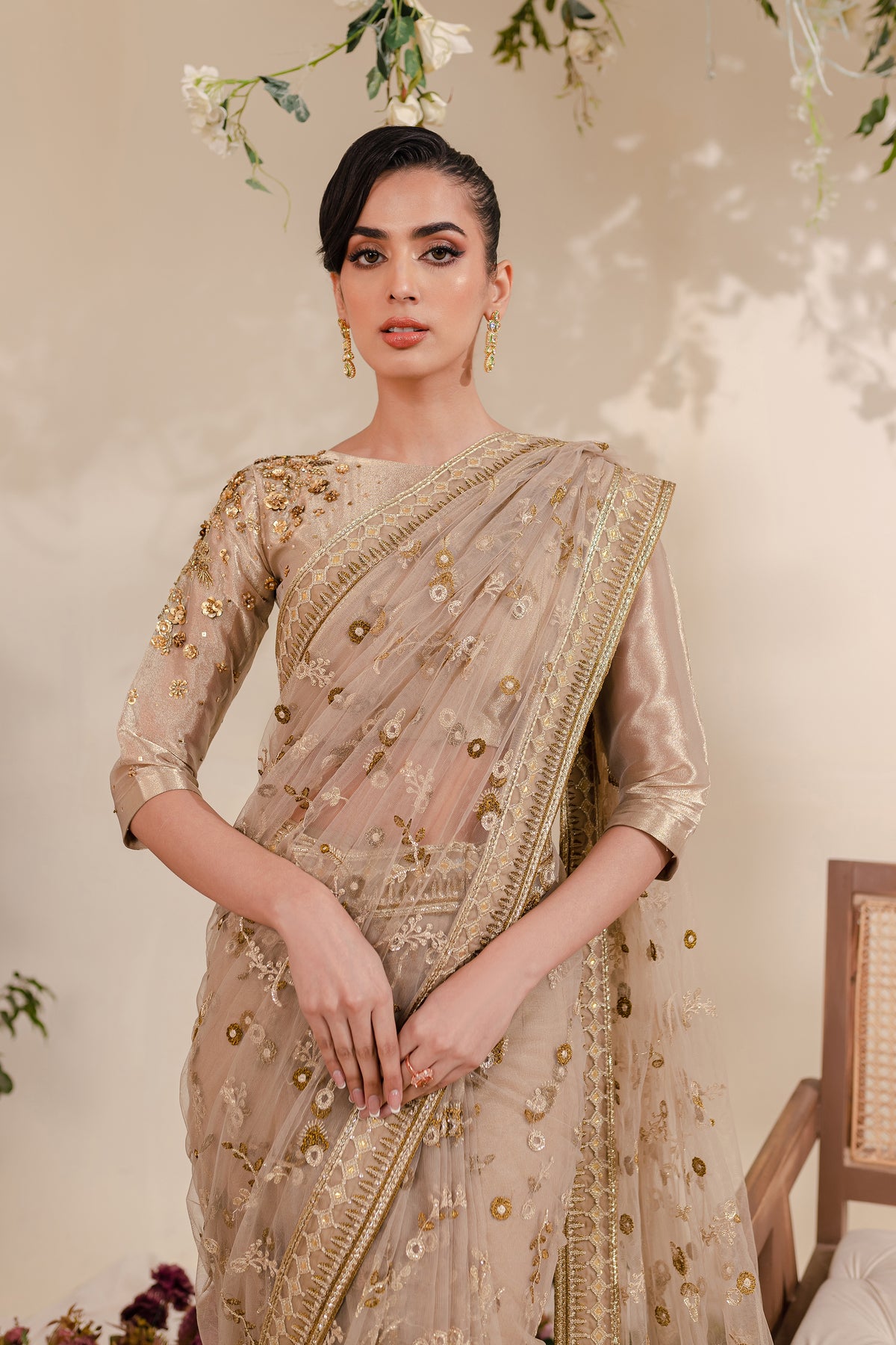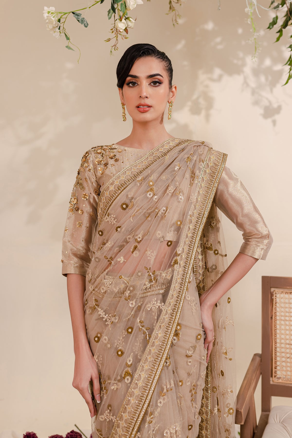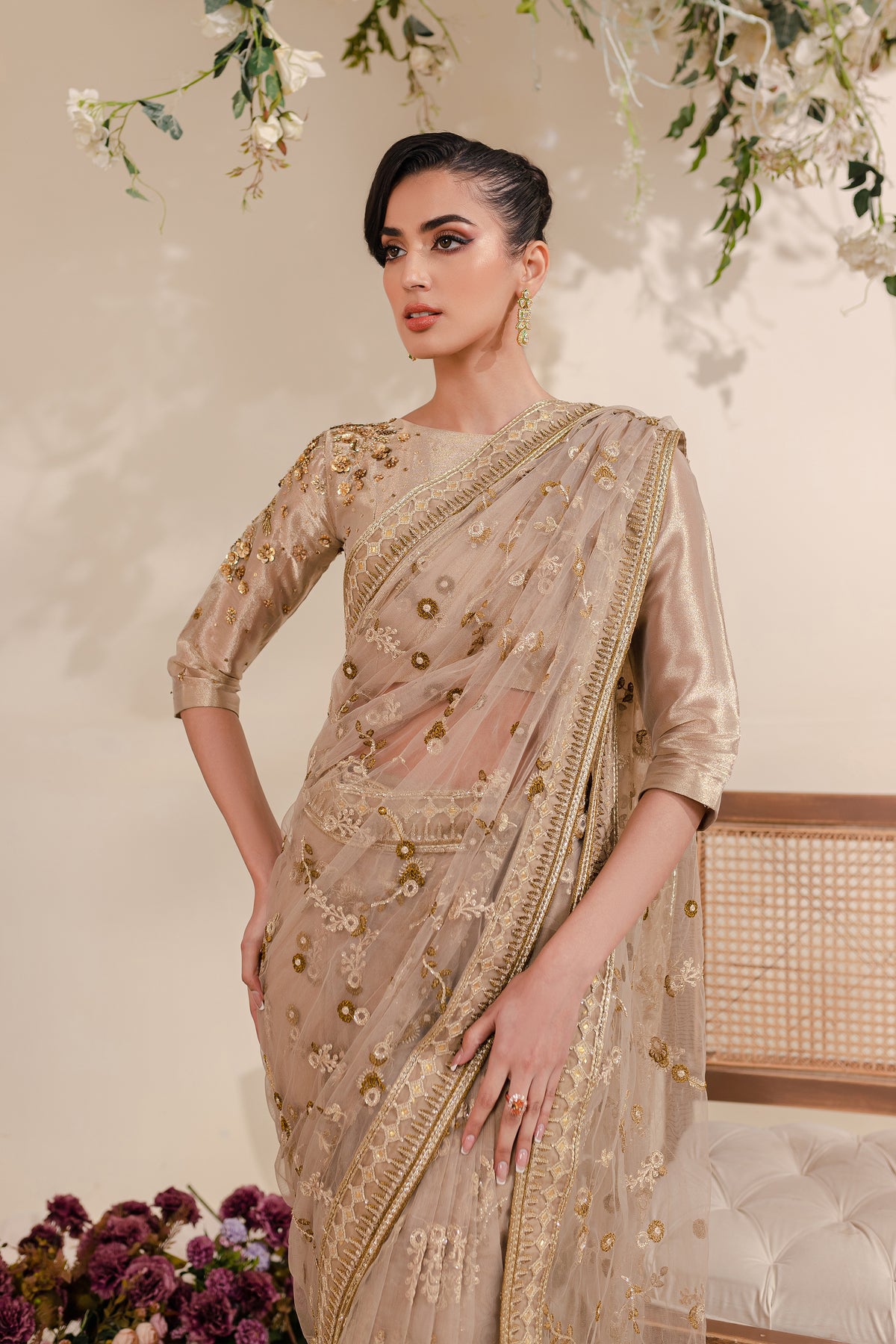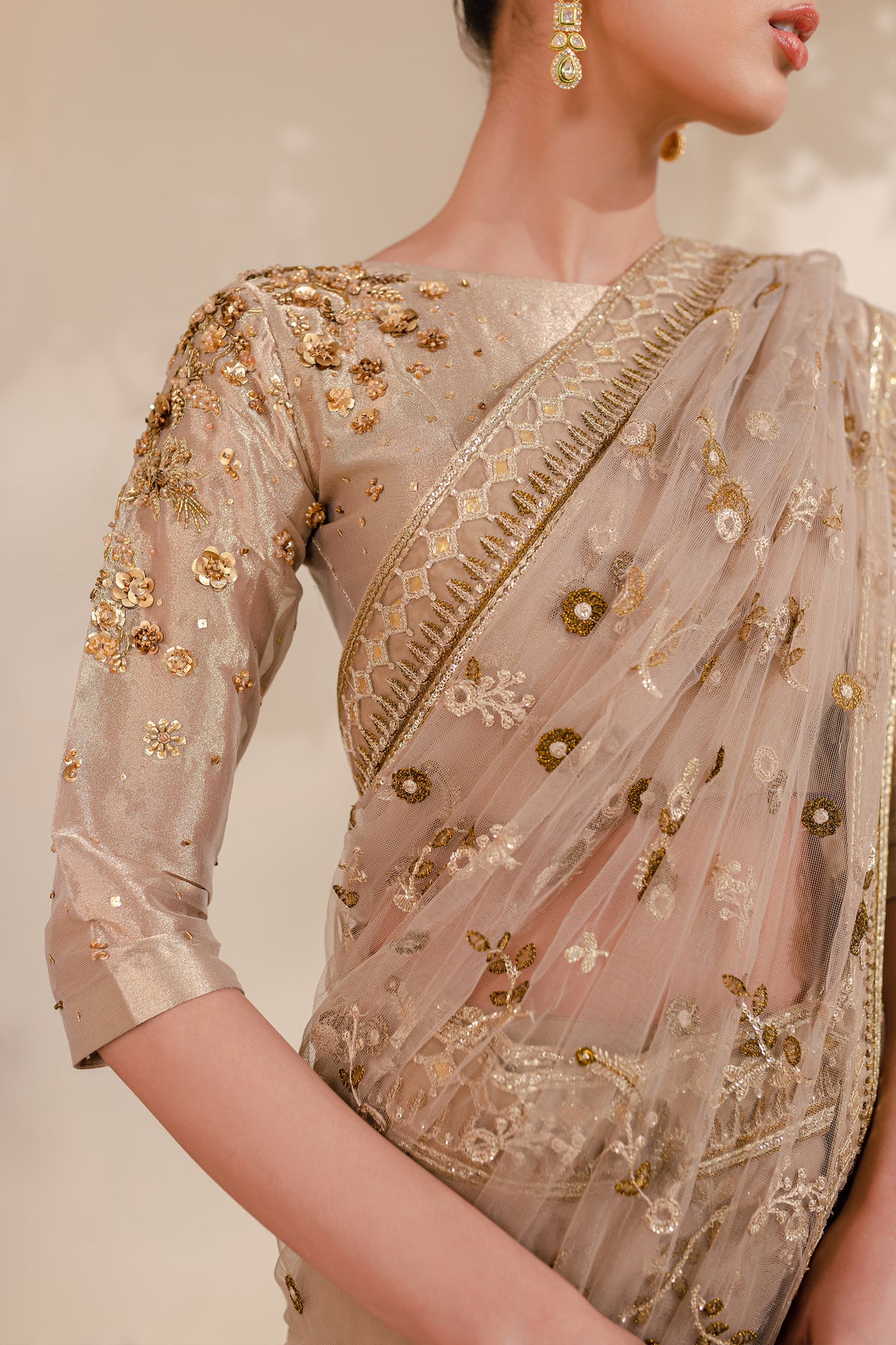 Intricately crafted saree blouse cut from the finest quality tissue in the shades of dim gold. Embellishments feature shimmery hand work details on the blouse