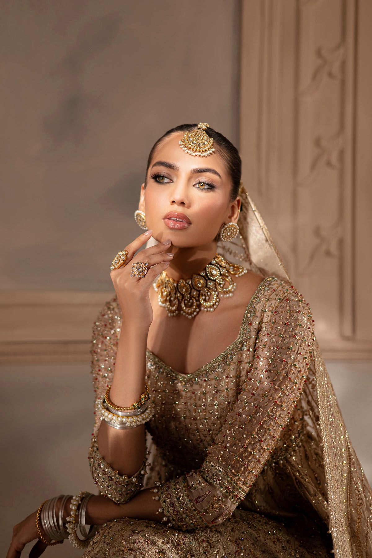 The ensemble is crowned with a delicate net dupatta, fully embroidered in an intricate jaal pattern. Its beauty is framed with organza borders on all four sides, further enhanced with material embellishments that add depth and luxury. Draped softly, this dupatta envelopes the bride in an ethereal glow, completing the look with a radiant touch of grandeur.