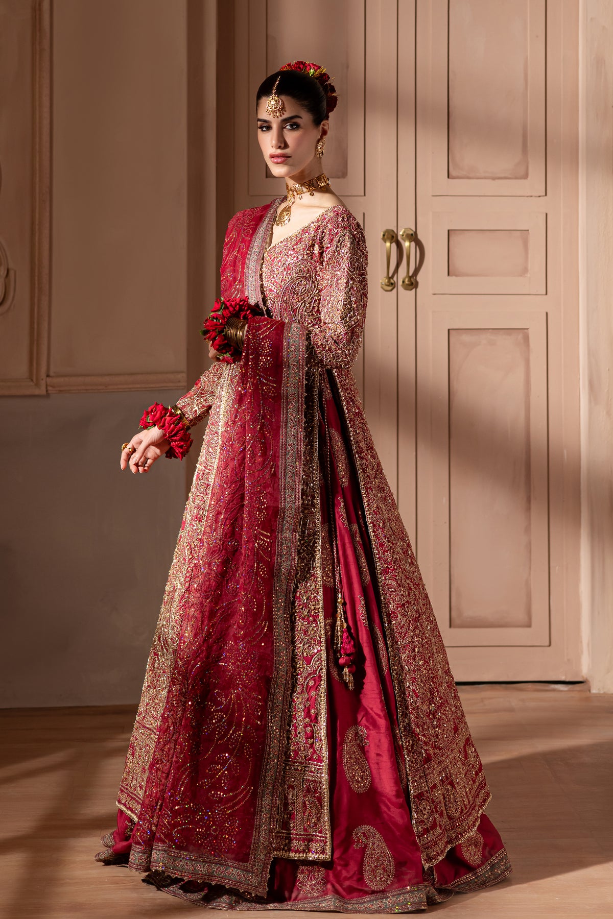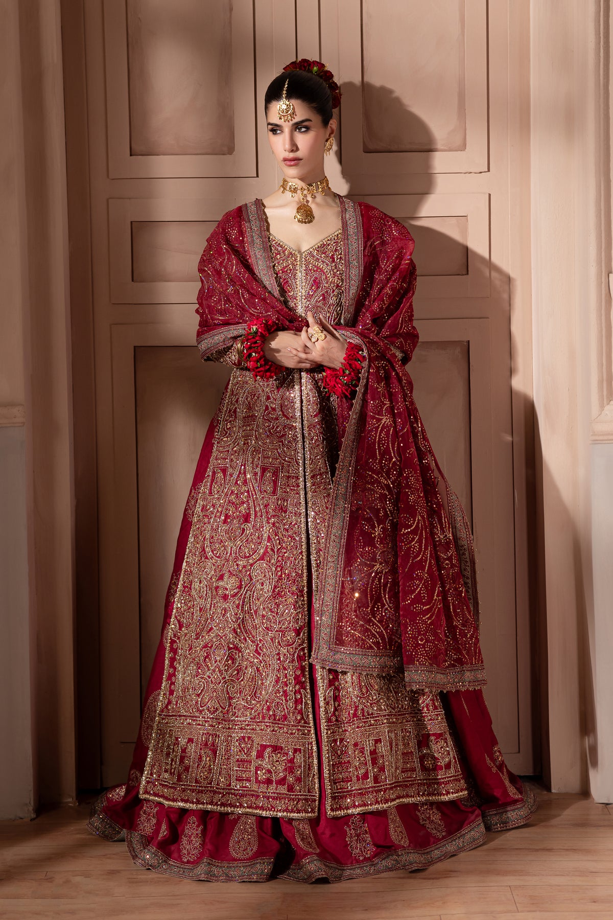 A breathtaking organza dupatta completes the look, lavishly embroidered with sequins to cast a soft, luminous sheen. Its borders are finished in contrasting tones and further embellished on all four sides to elevate its elegance. Draped effortlessly, this dupatta surrounds the bride in an aura of royalty and magnificence, making the entire ensemble a true statement of luxury.