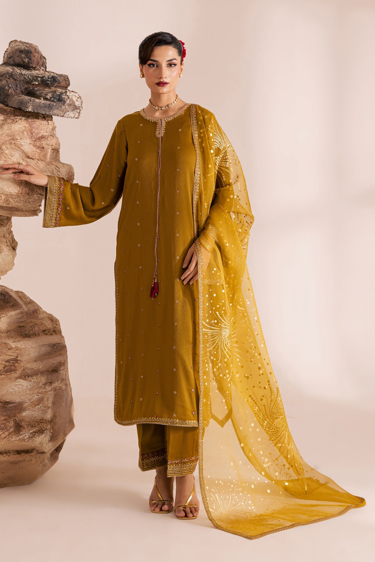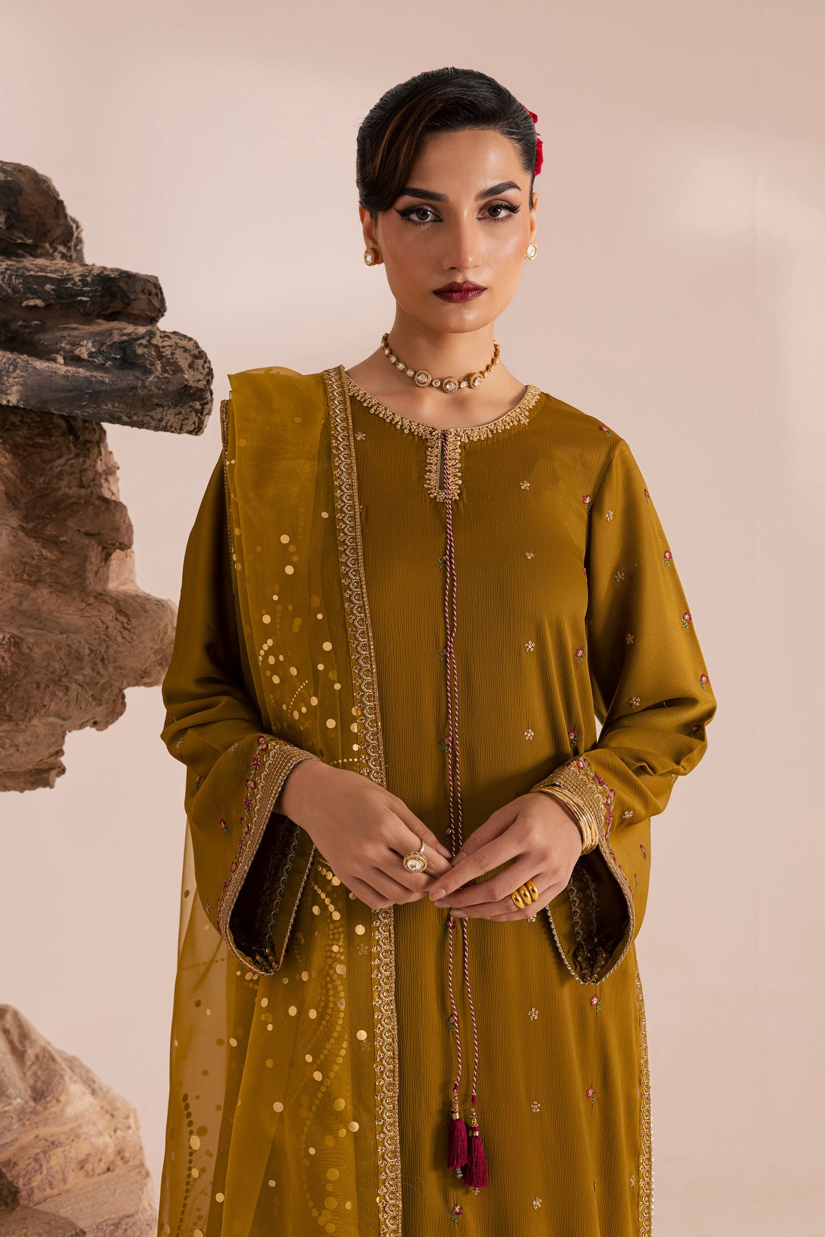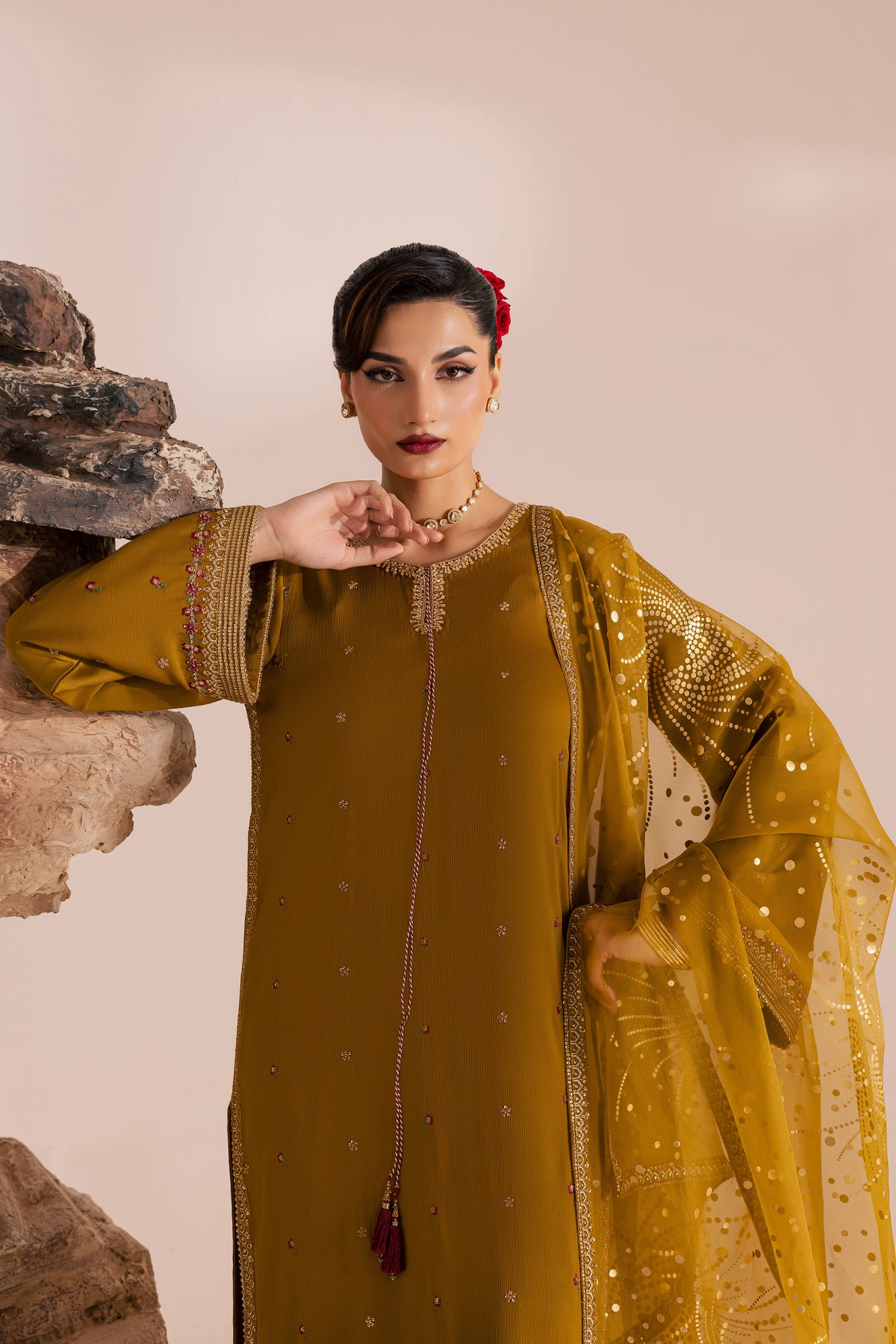 A formal embroidered dress with a textured georgette shirt in gold color featuring a direct adda neckline adorned with delicate tassels, paired with embroidered sleeves finished with borders at the hem. The look is elevated with samosa lace finishing, adding a graceful and traditional touch.