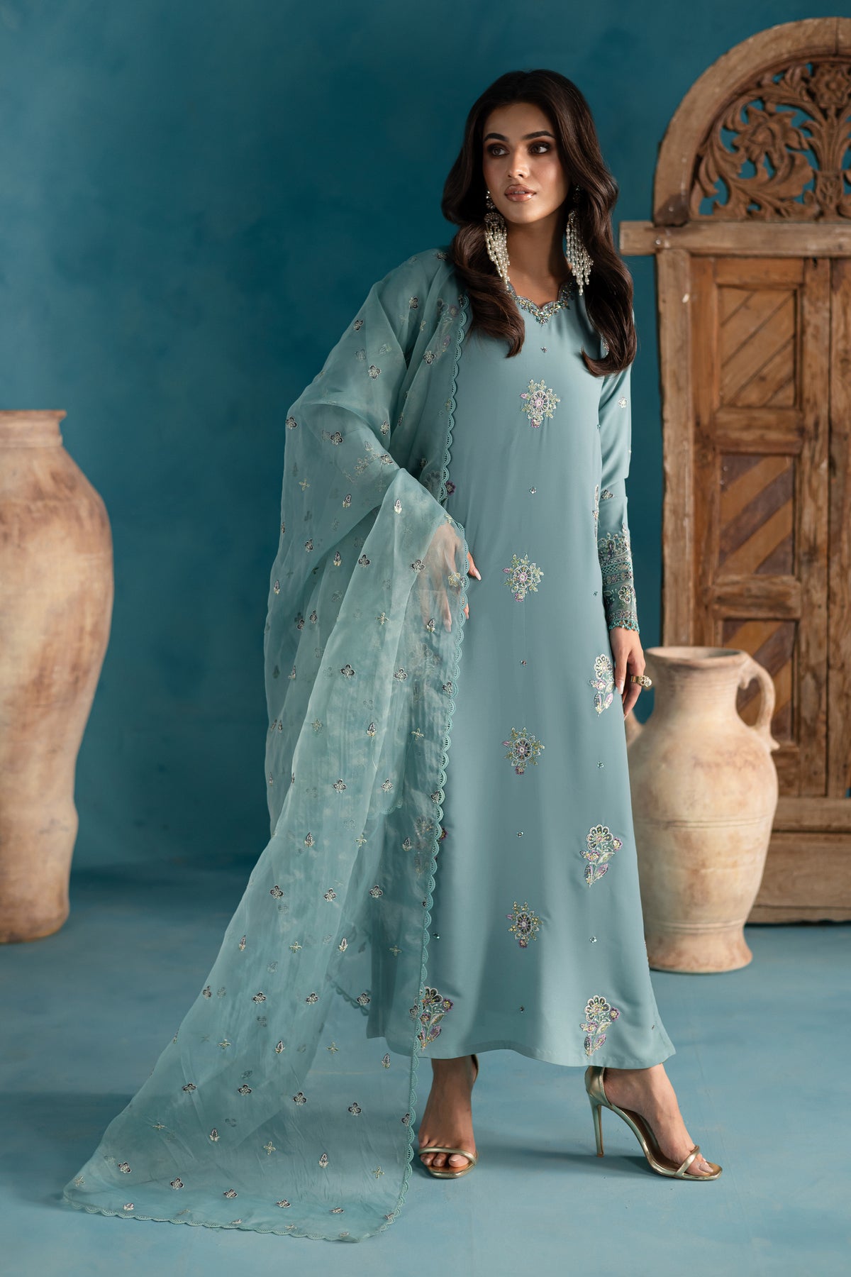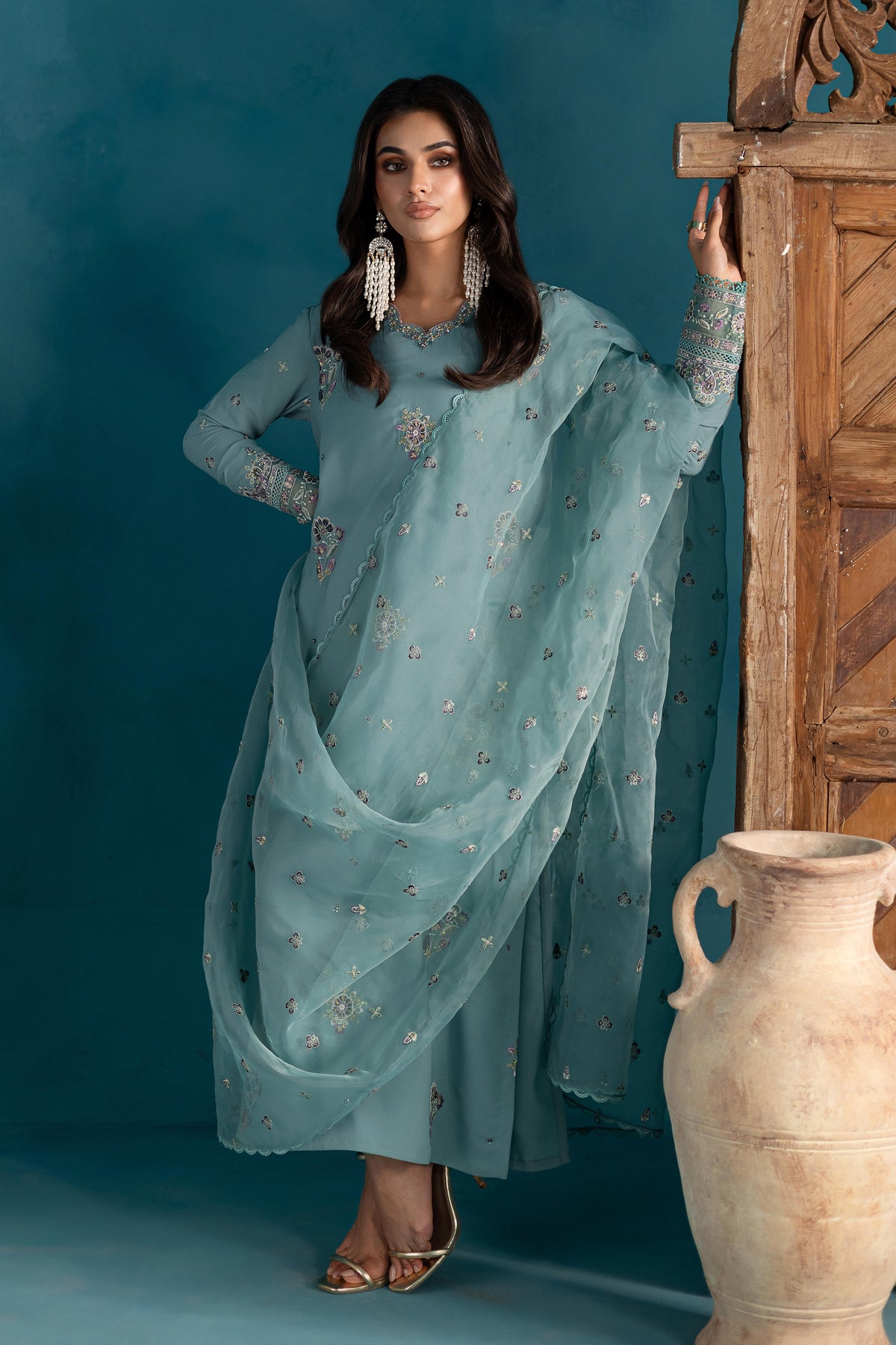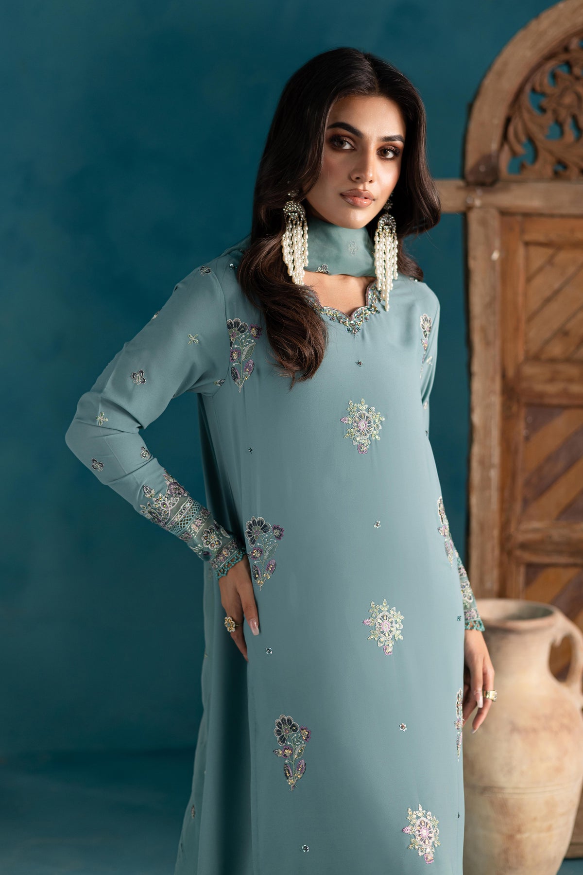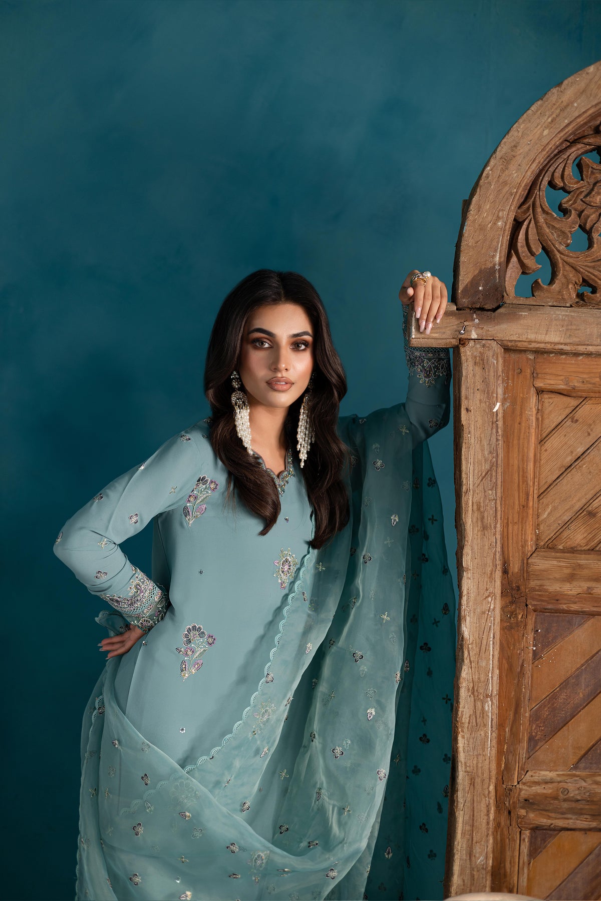 This long aqua georgette shirt features an all-over spread embroidery that exudes timeless elegance. The neckline is enhanced with a scalloped direct adda finish, adding intricate charm and artisanal detail. The sleeves carry the same embroidered spread, accented with appliquéd organza borders and sehri lace inserts, finished with a delicate lace at the cuffs for a graceful touch.