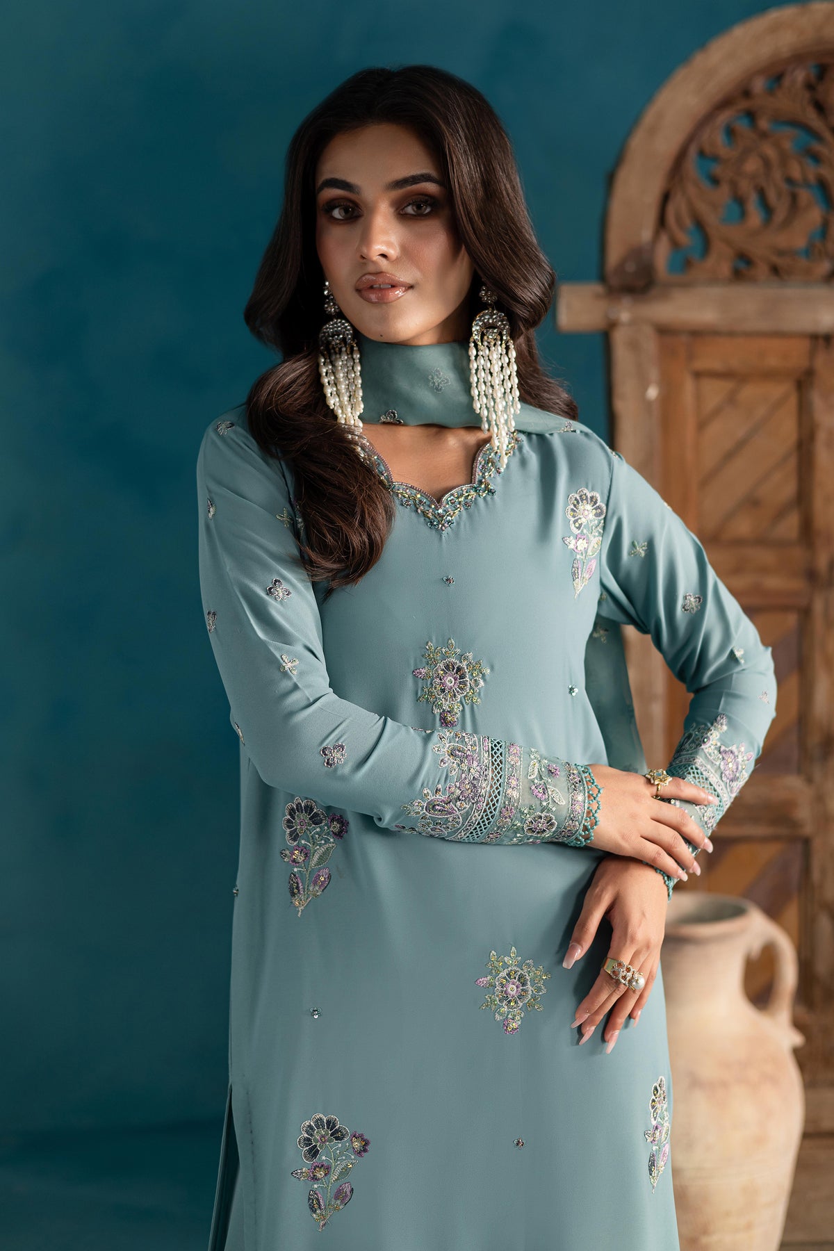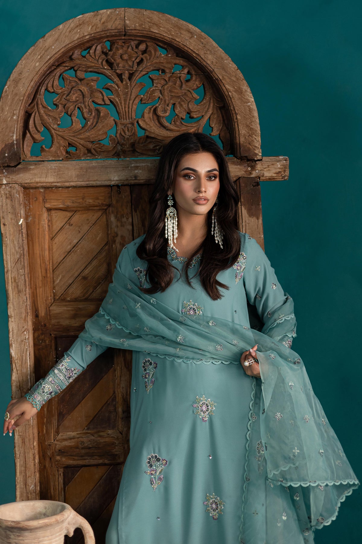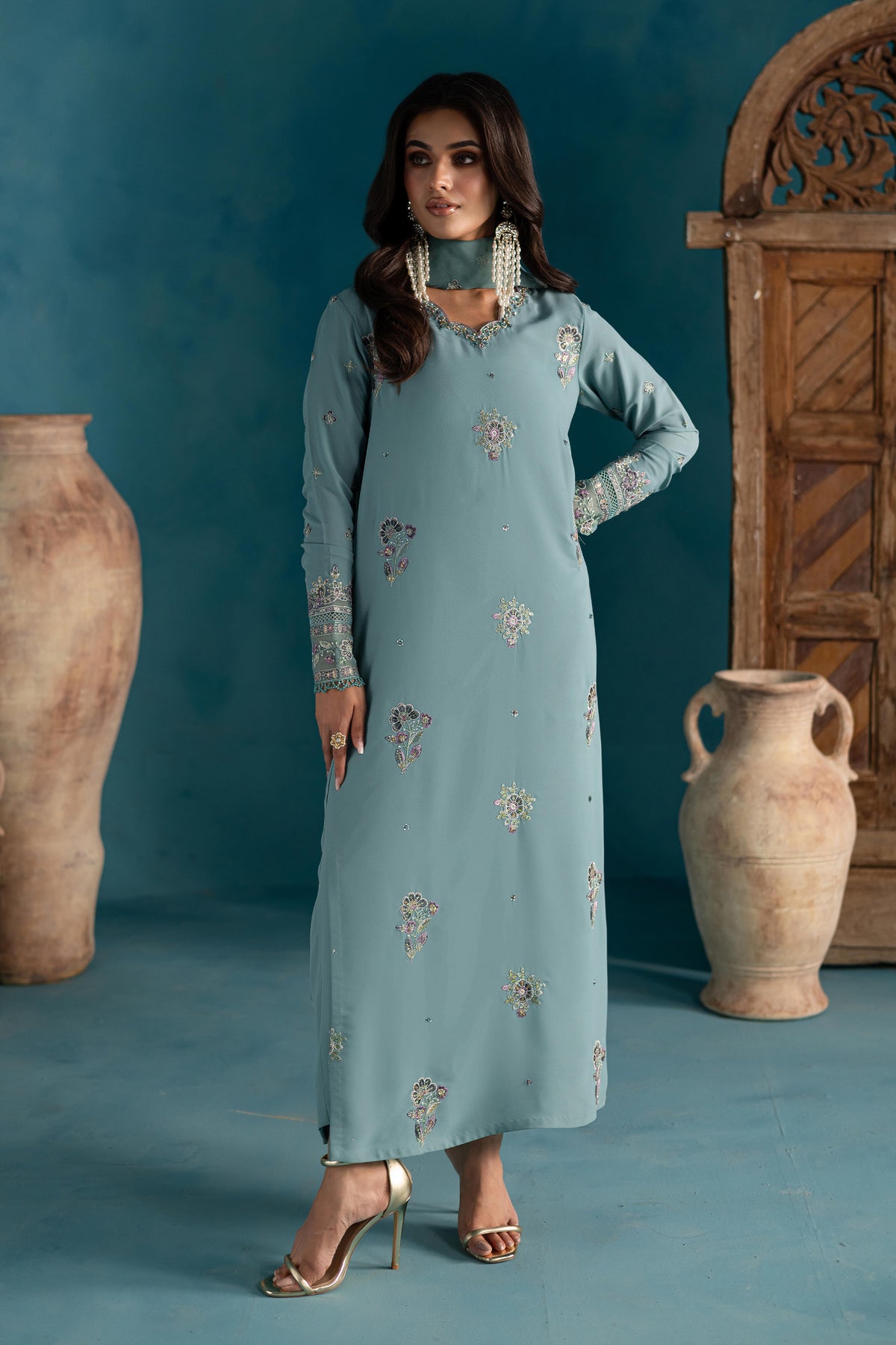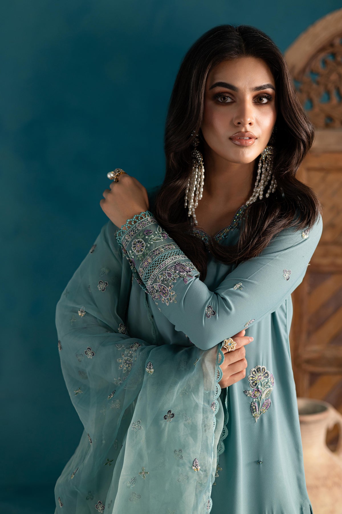 This long aqua georgette shirt features an all-over spread embroidery that exudes timeless elegance. The neckline is enhanced with a scalloped direct adda finish, adding intricate charm and artisanal detail. The sleeves carry the same embroidered spread, accented with appliquéd organza borders and sehri lace inserts, finished with a delicate lace at the cuffs for a graceful touch.