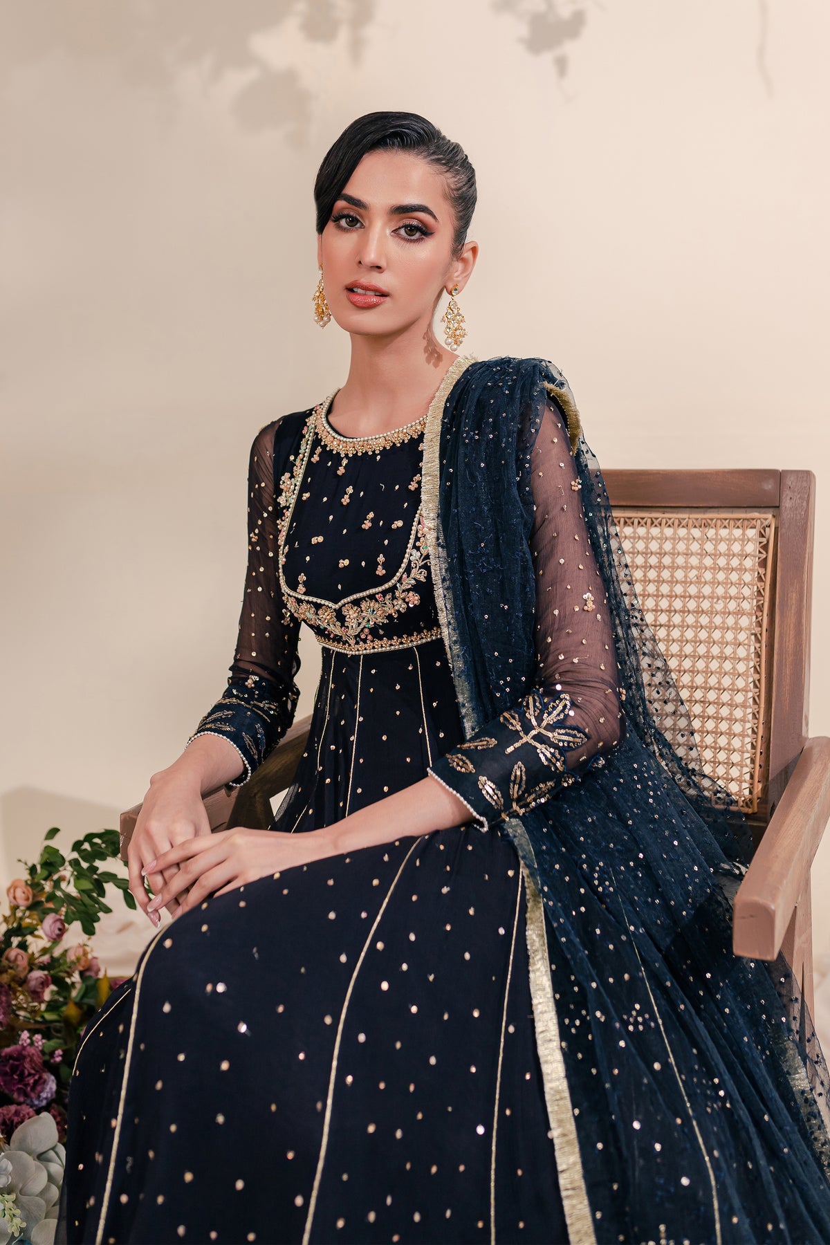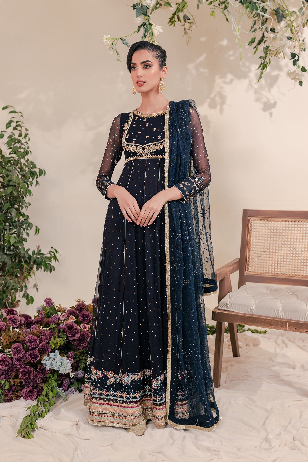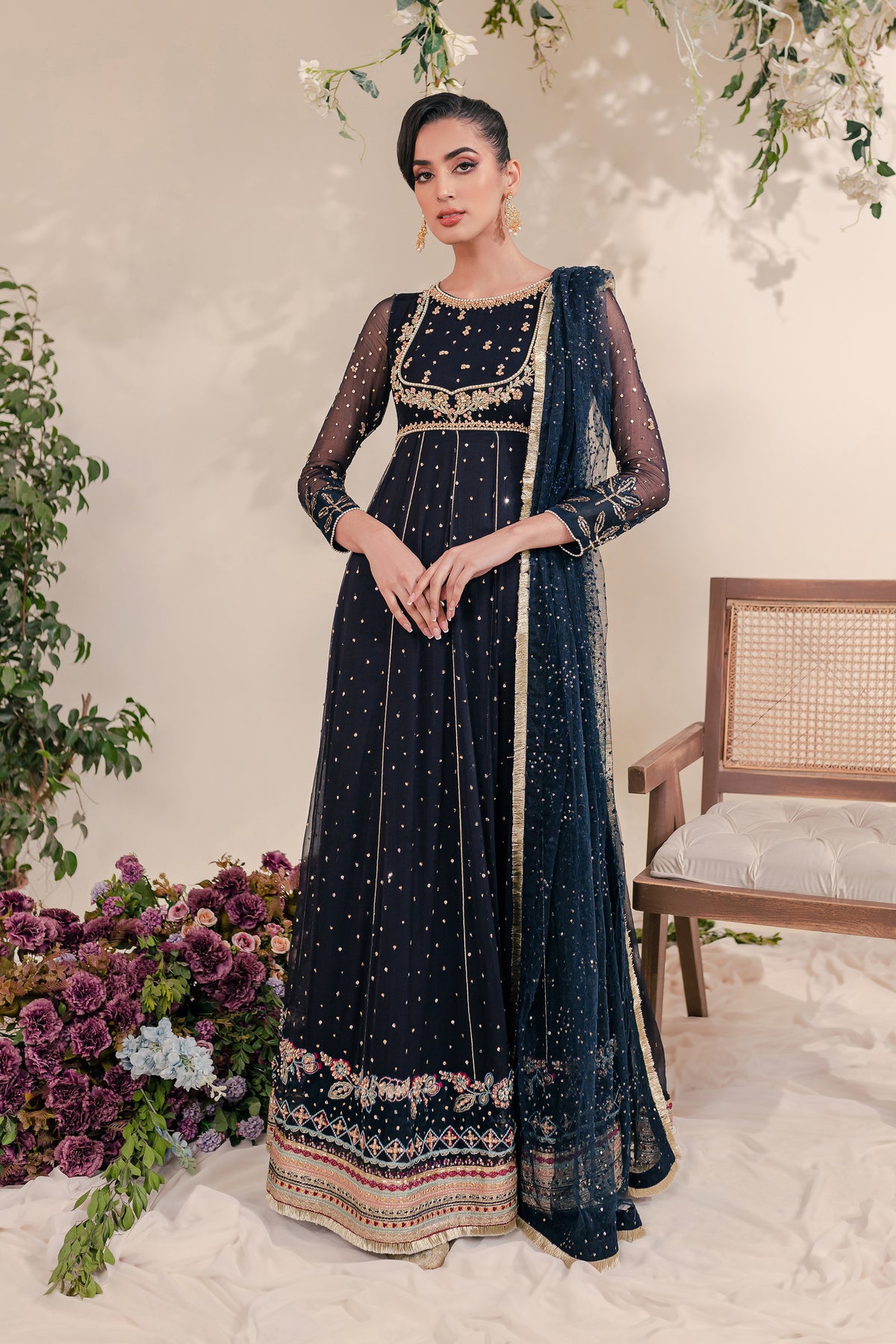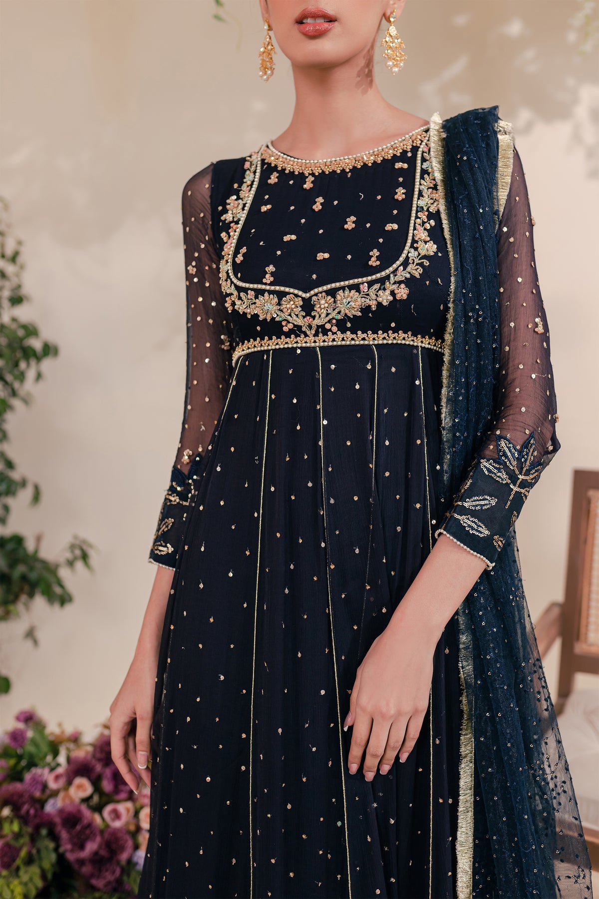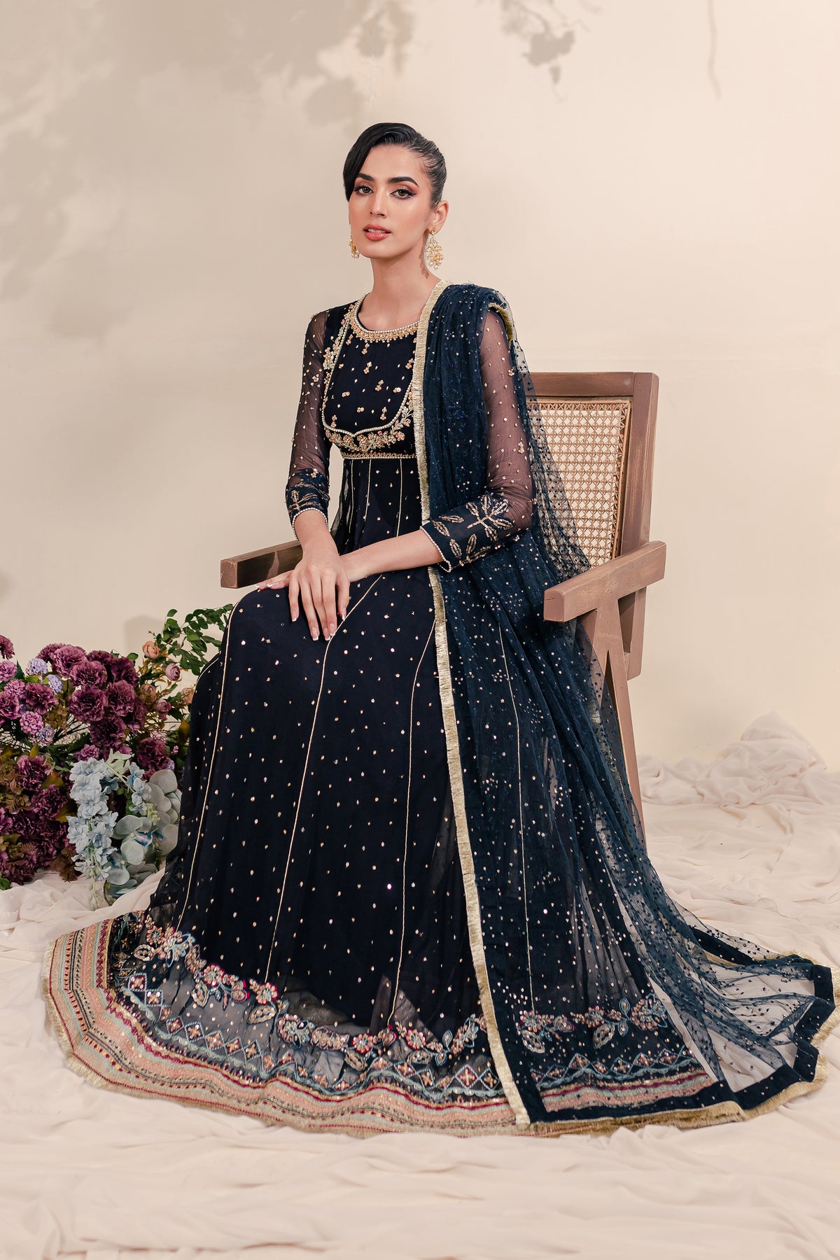 Gorgeously draped long frock cut from the premium quality crinkle chiffon in the shades of blue. Embellishments feature heavily composed hand work at yoke and intricately embroidered organza borders in contrasting hues with added details of shimmery sitara spread all over