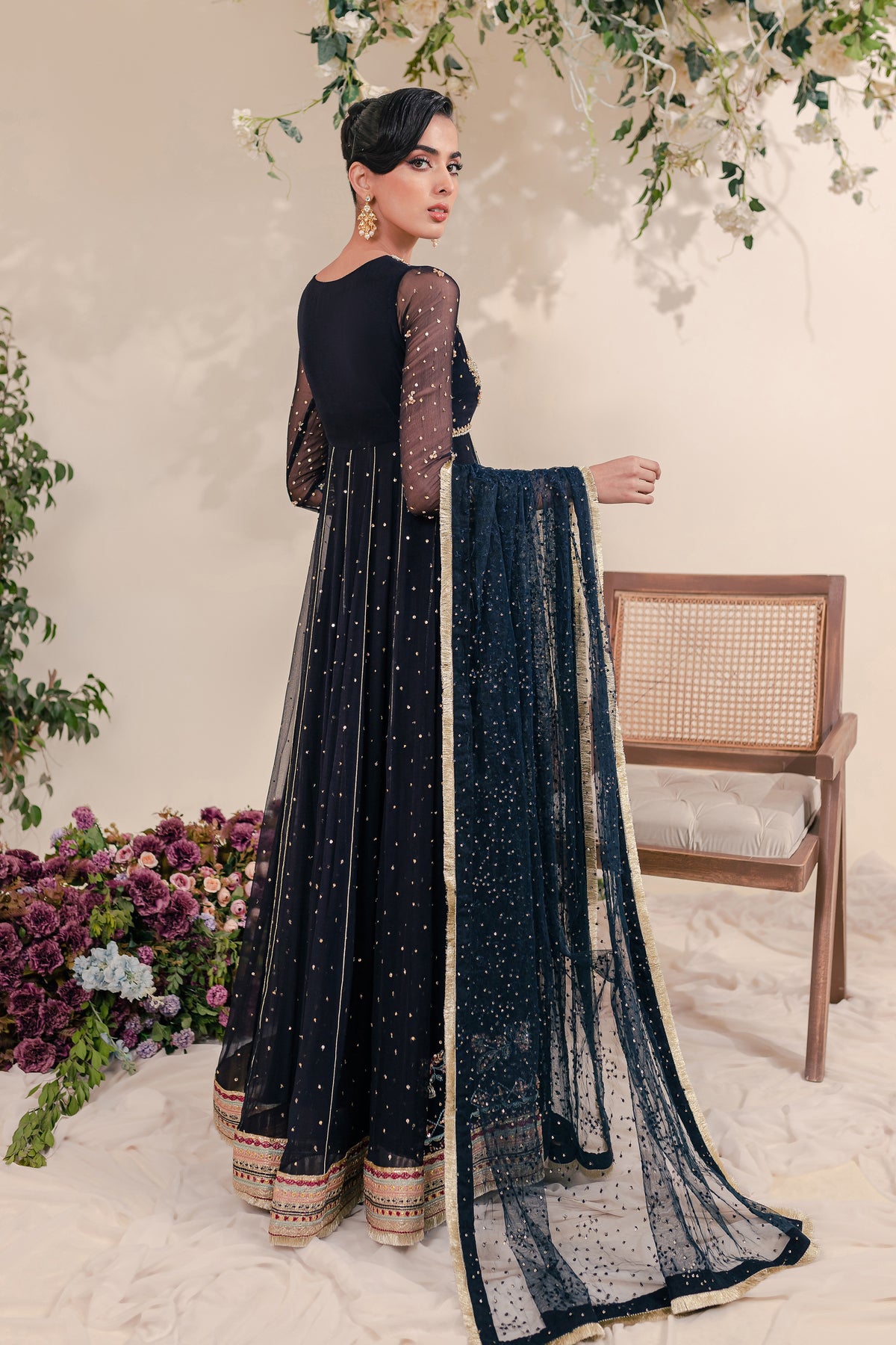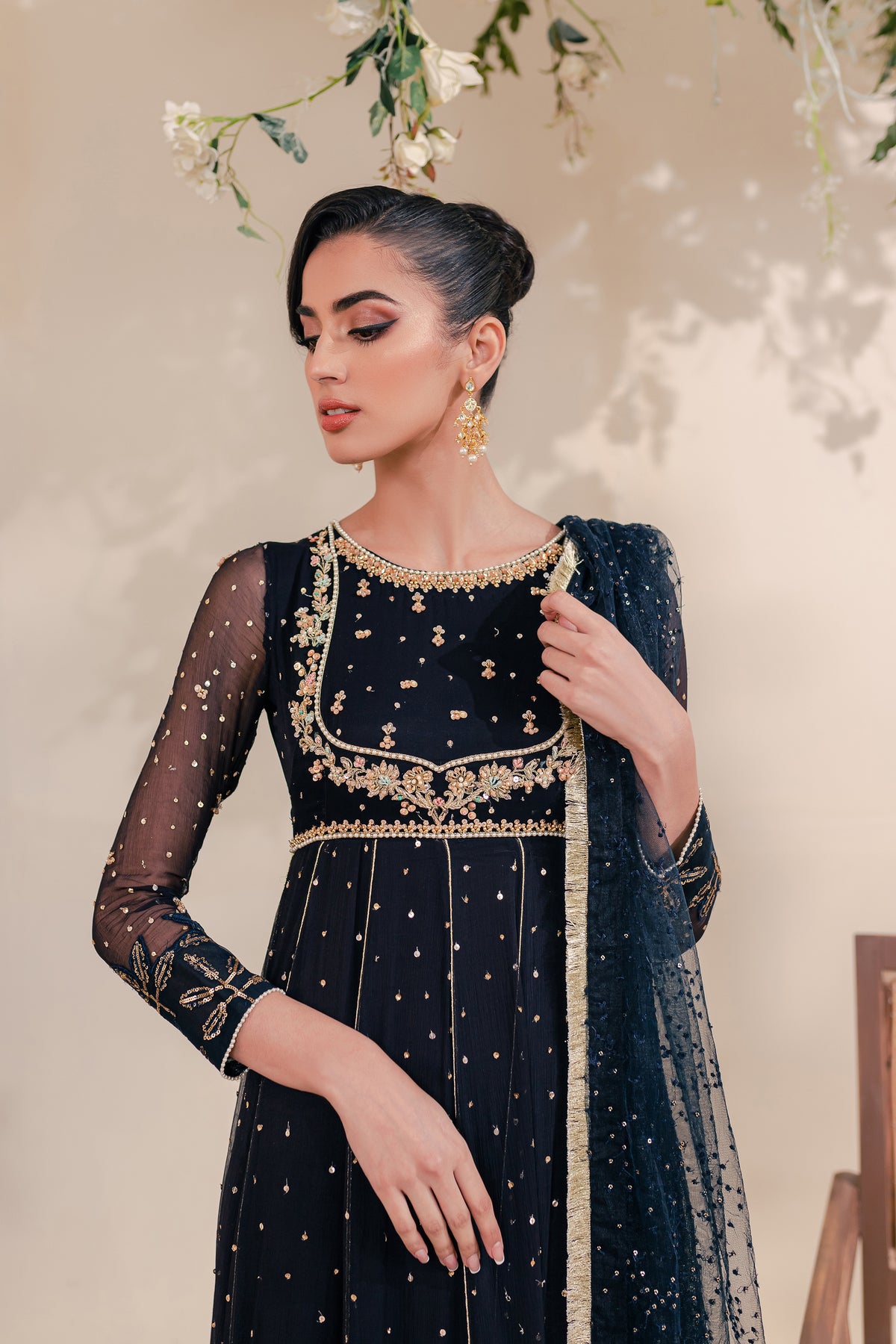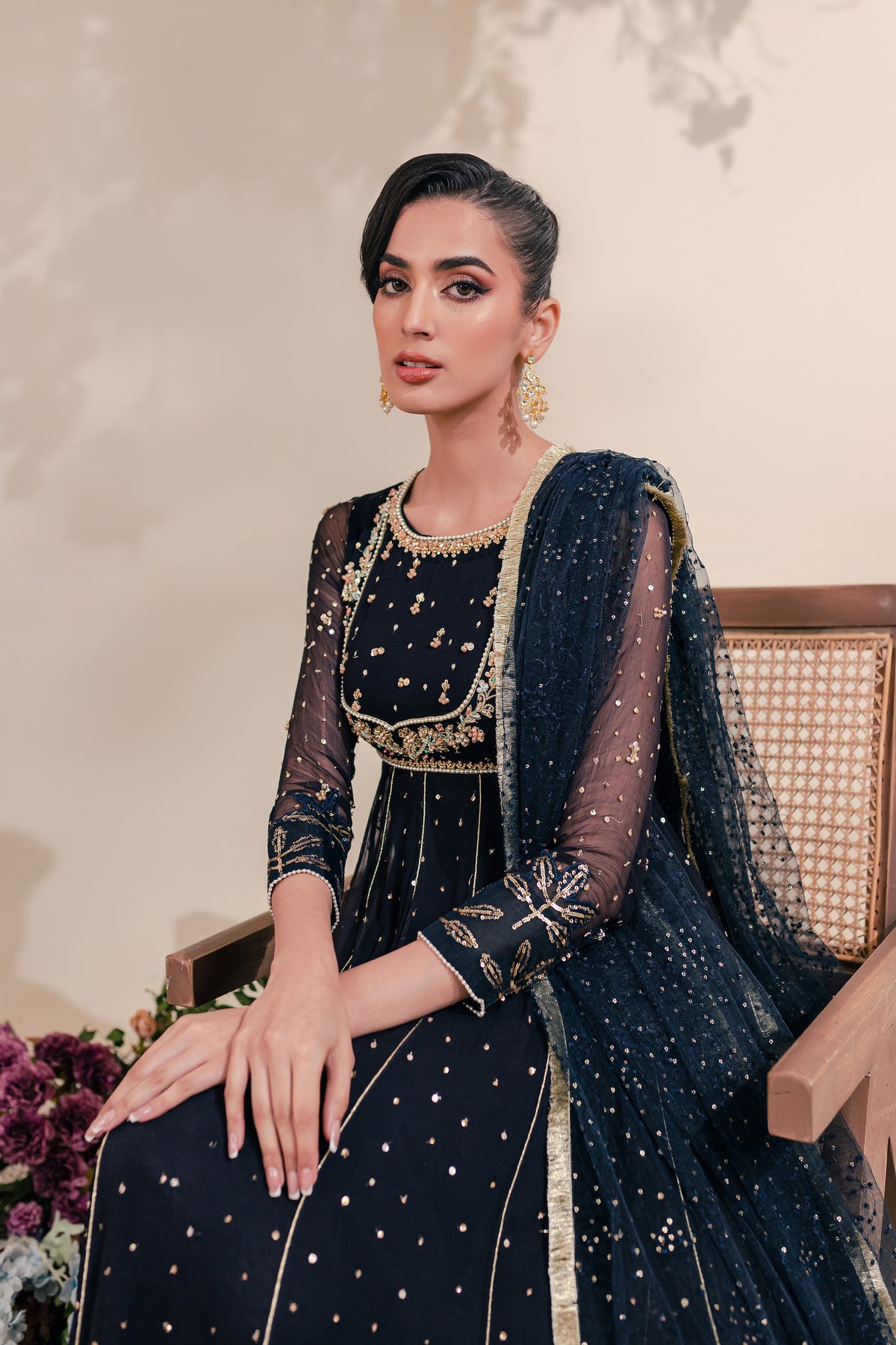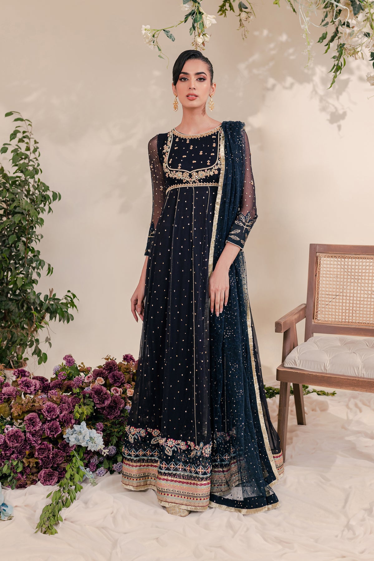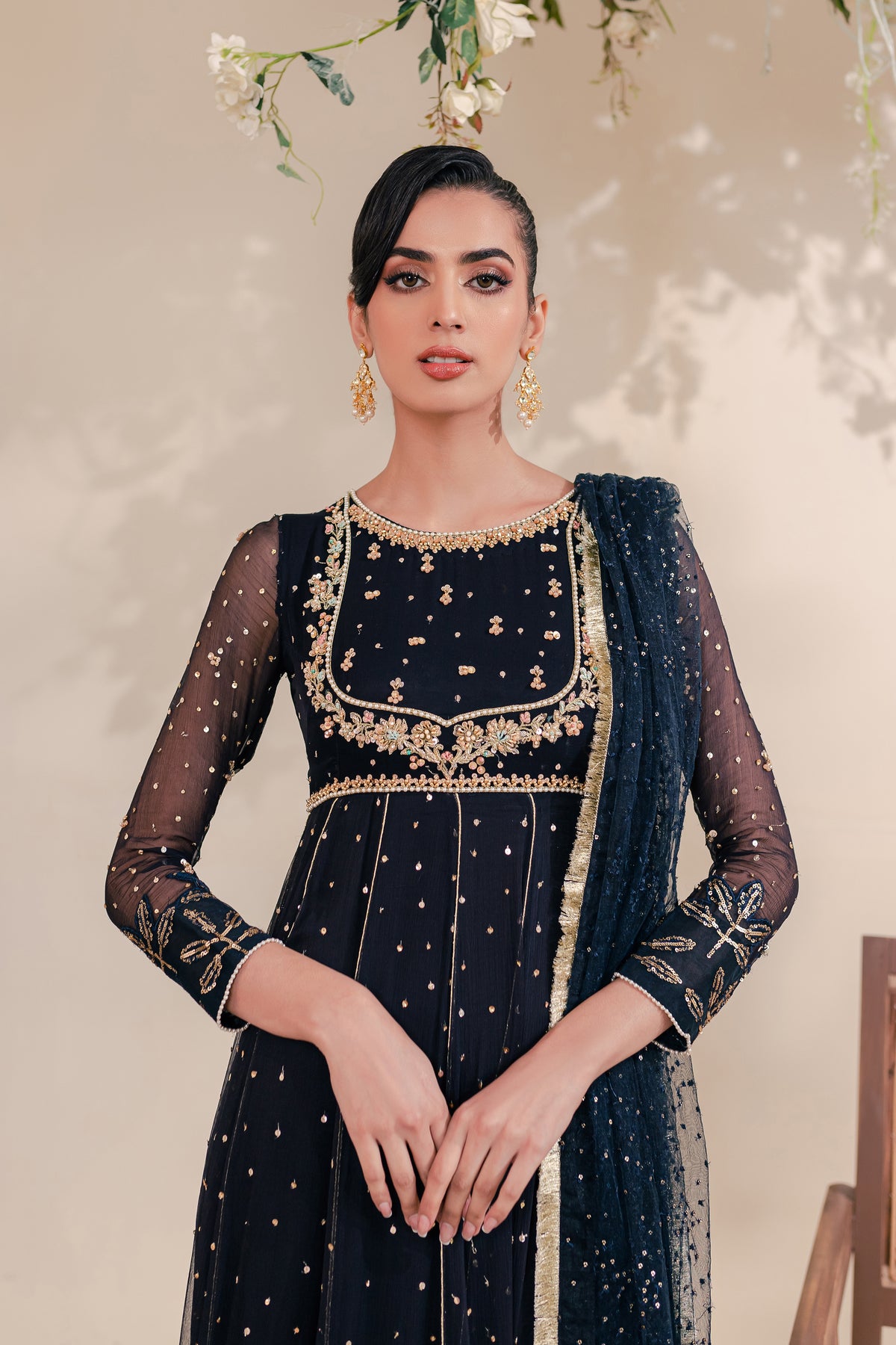Gorgeously draped long frock cut from the premium quality crinkle chiffon in the shades of blue. Embellishments feature heavily composed hand work at yoke and intricately embroidered organza borders in contrasting hues with added details of shimmery sitara spread all over