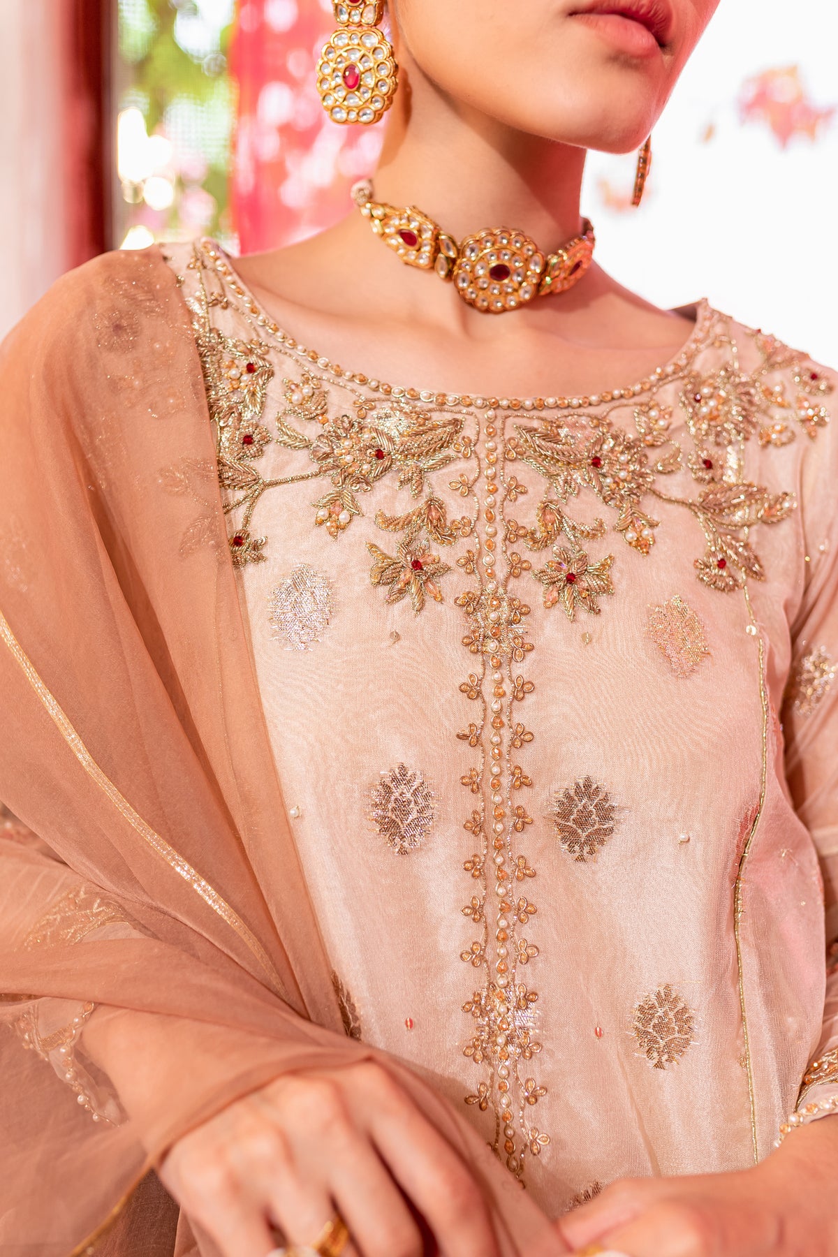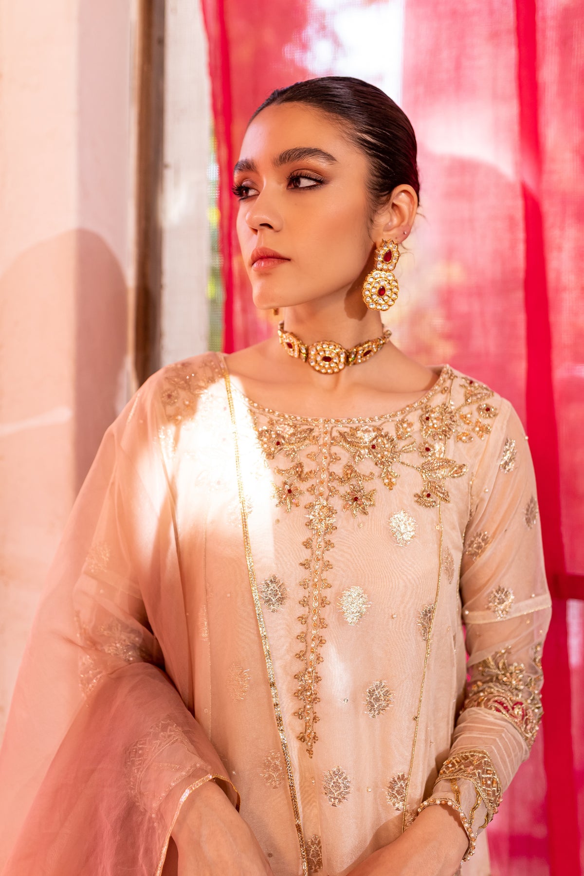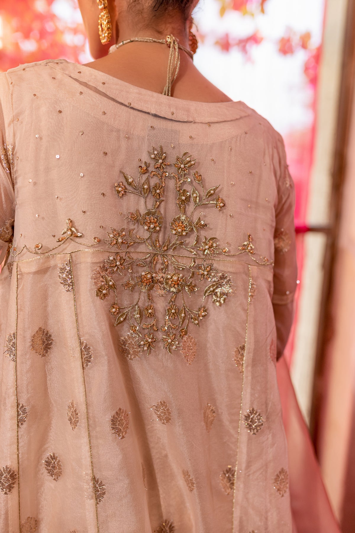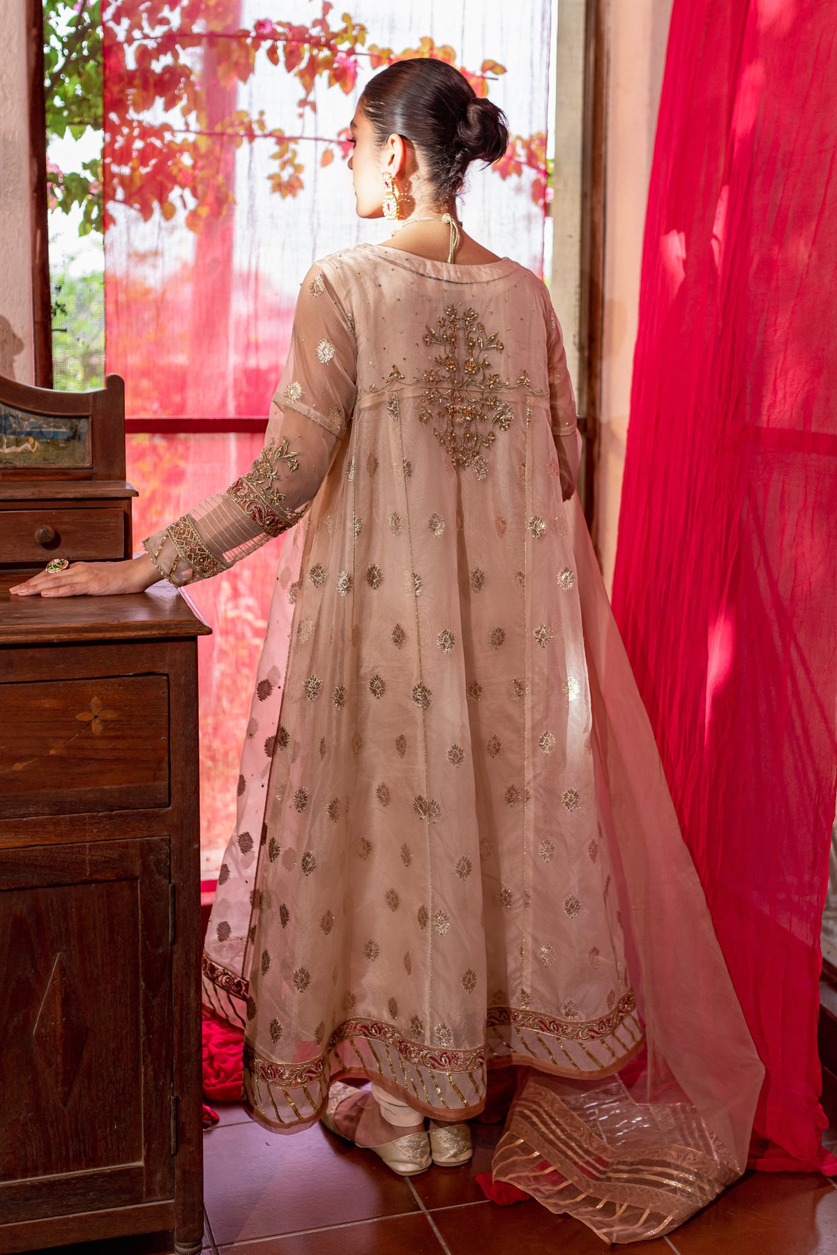 Gorgeously draped kalidaar frock cut from the high quality organza badla in the shades of off white. Embellishments feature heavily embroidered neckline with adda work and embroidered patti work at hem. Raita embroidery motif on back yoke and sleeves with adda work on it adds more glamour to the whole look