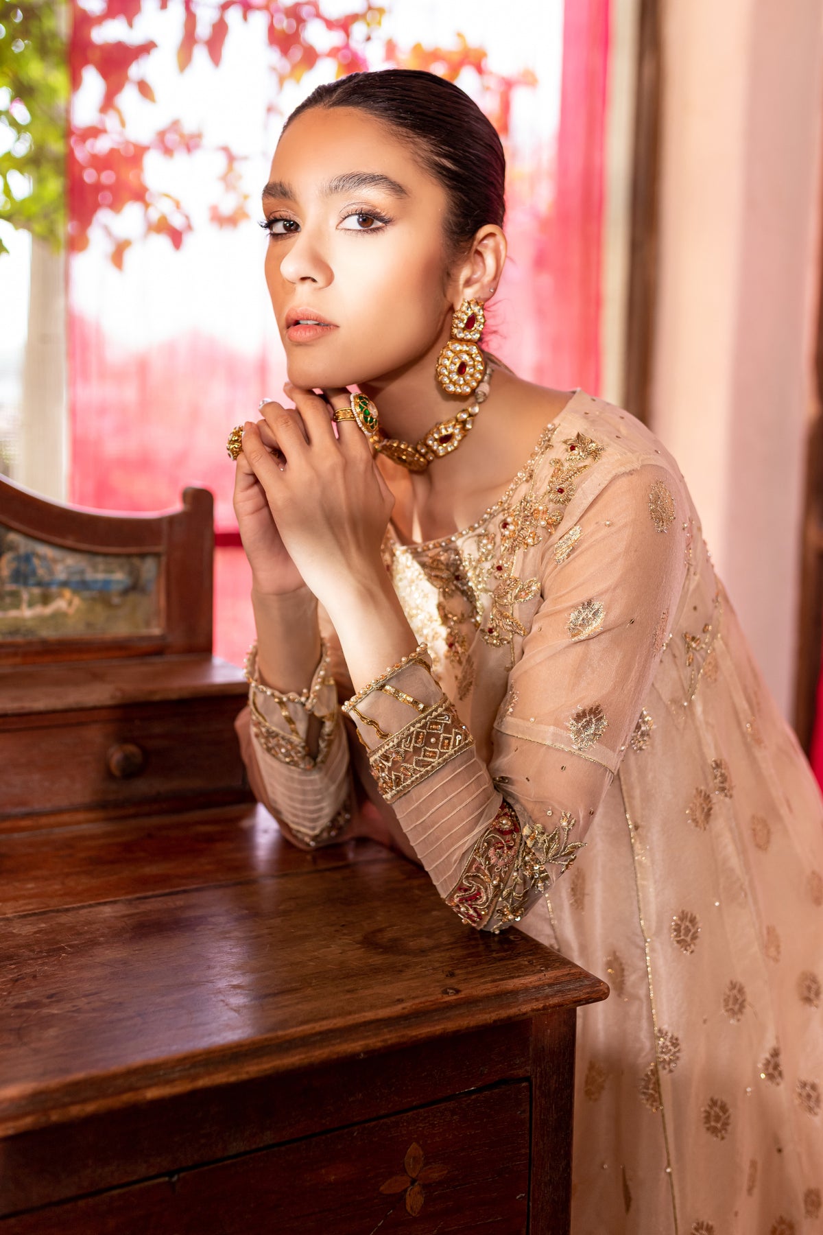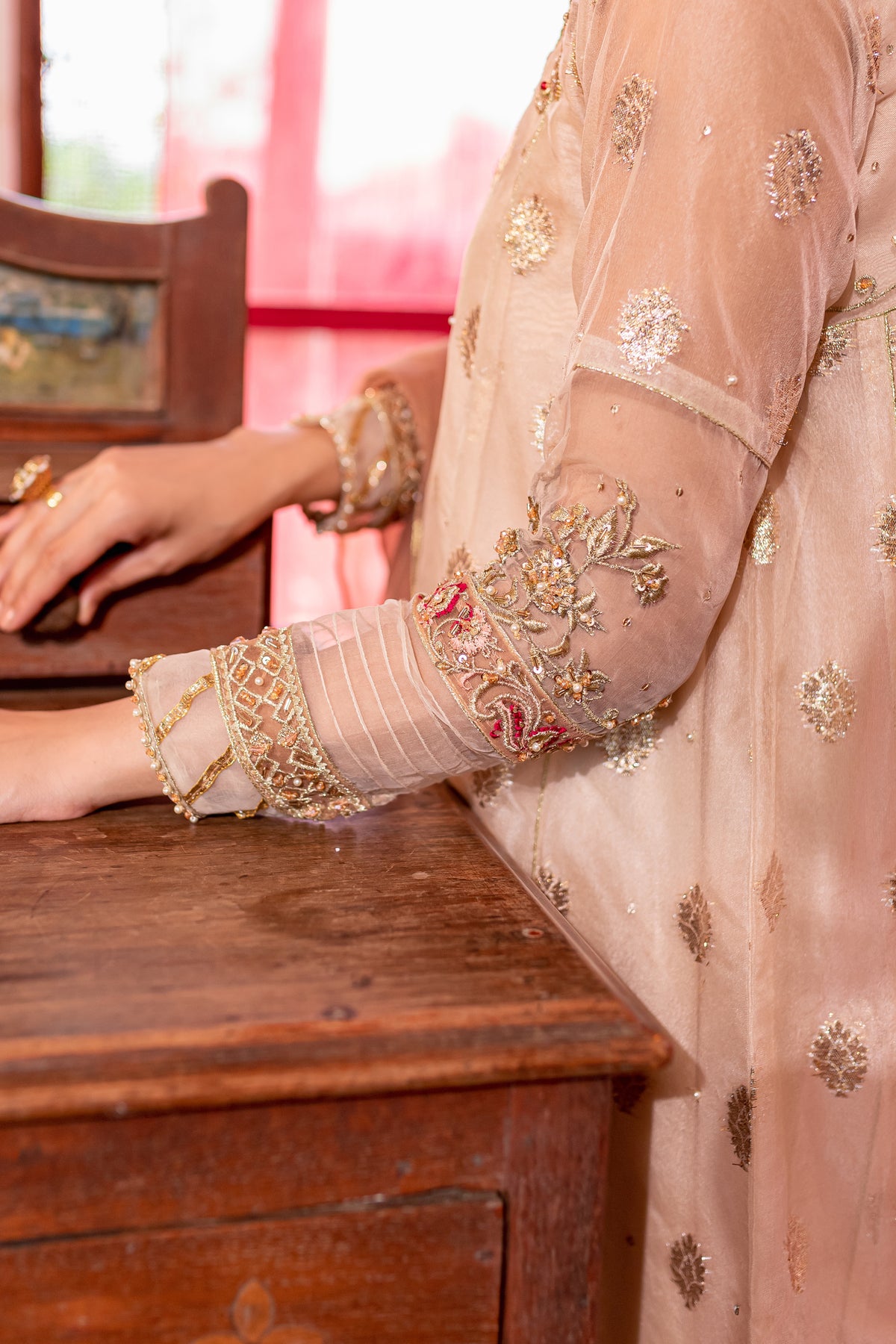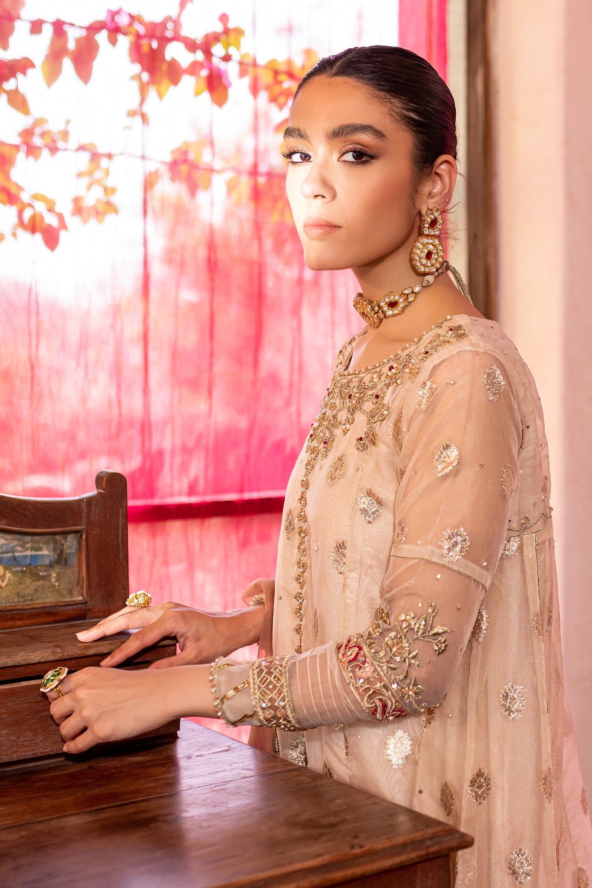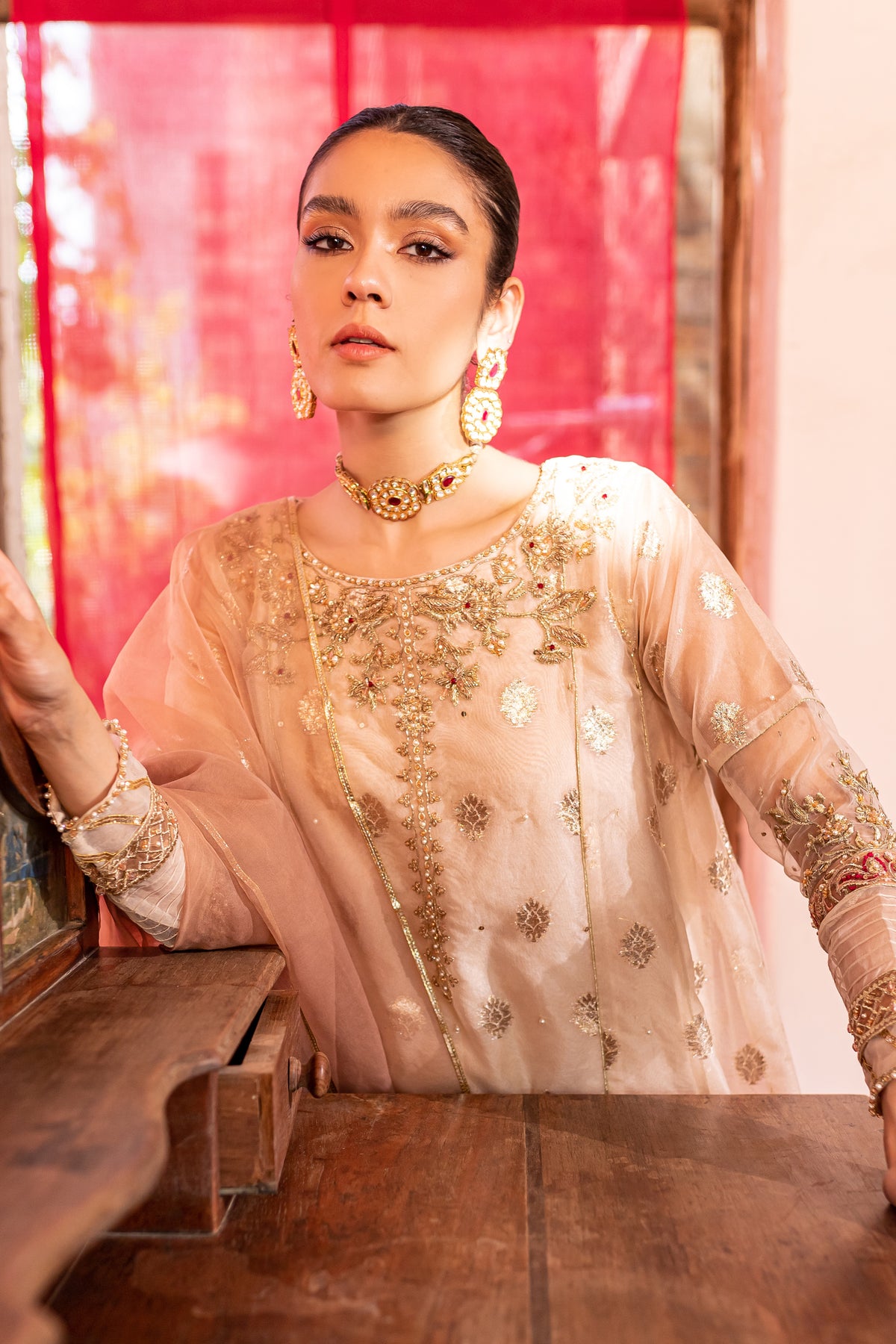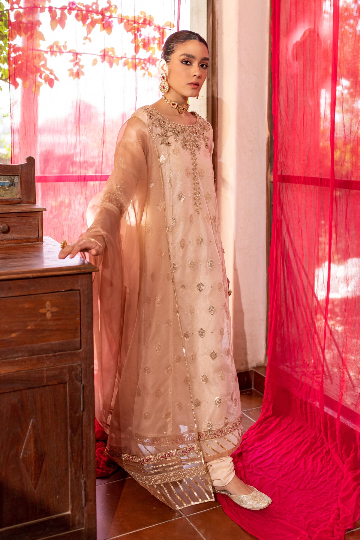 Gorgeously draped kalidaar frock cut from the high quality organza badla in the shades of off white. Embellishments feature heavily embroidered neckline with adda work and embroidered patti work at hem. Raita embroidery motif on back yoke and sleeves with adda work on it adds more glamour to the whole look
