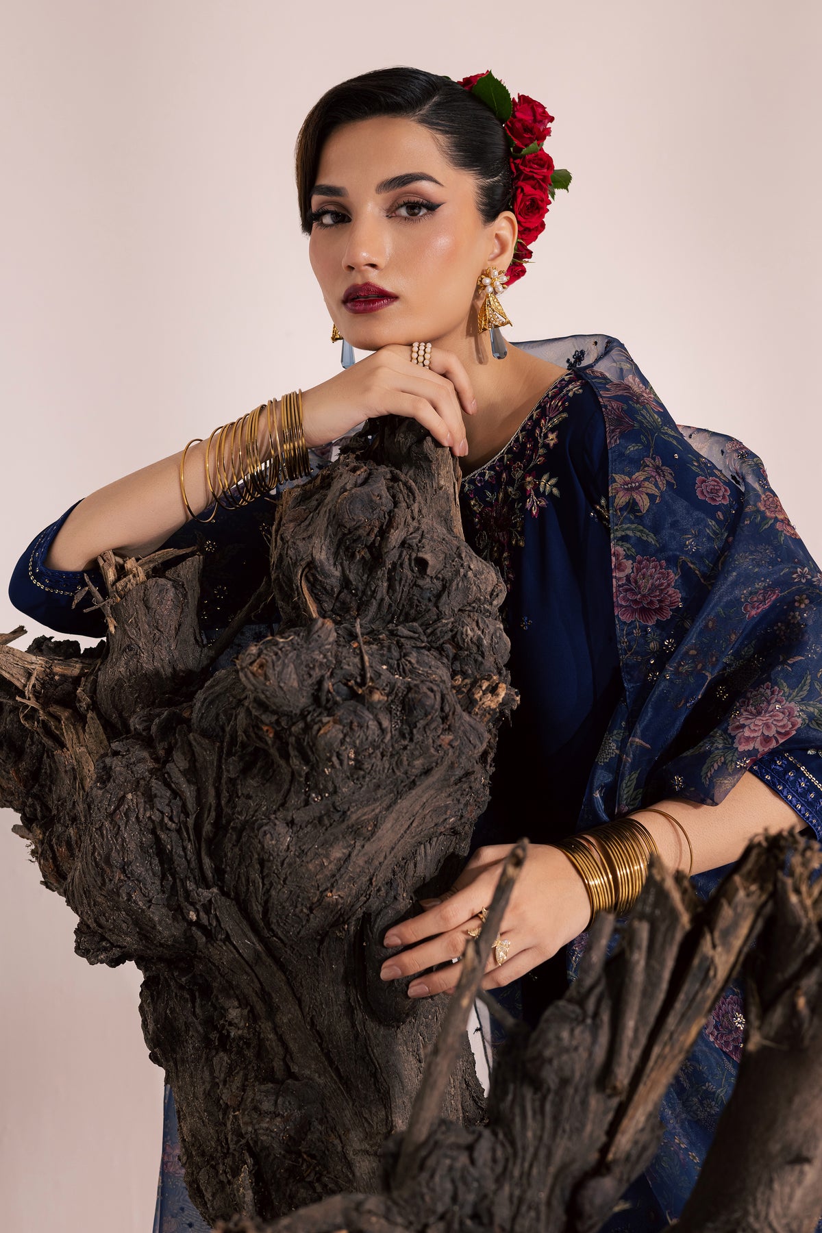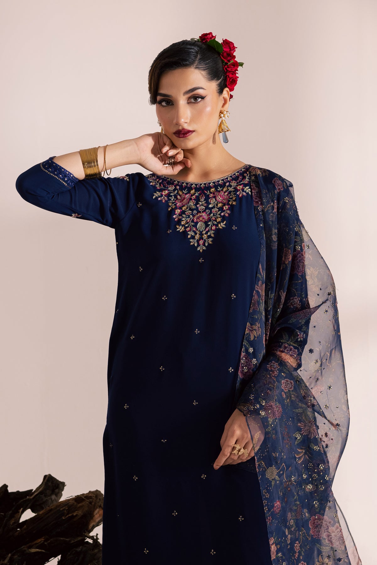 This formal embroidered dress exudes a long georgette deep blue shirt with a delicately embroidered neckline with intricate adda work, complemented by an embroidered spread across the shirt. The hem is finished with a 1-inch embroidered border, while the sleeves are adorned with an embroidered spread and matching borders, adding to the refined detailing.