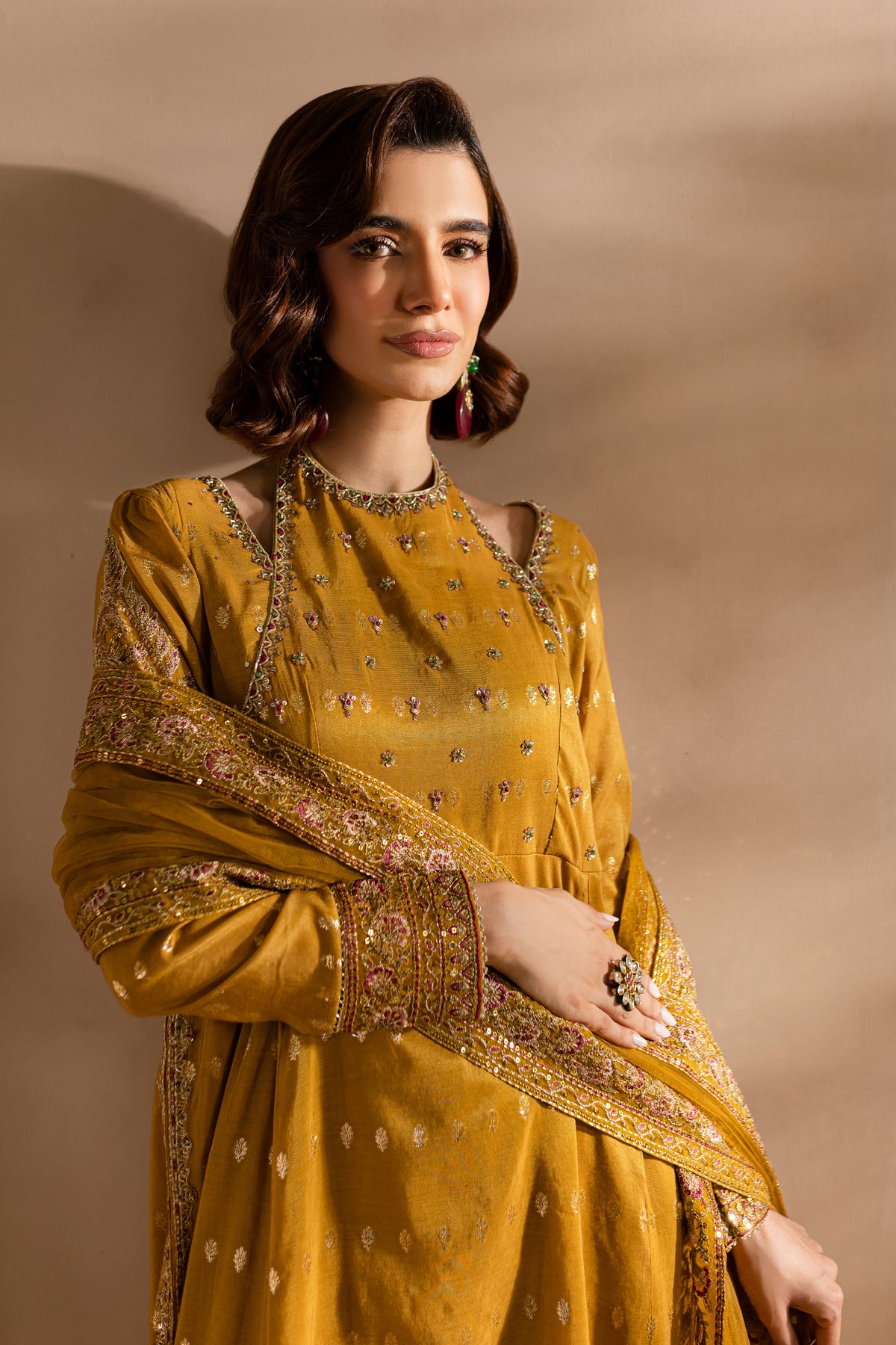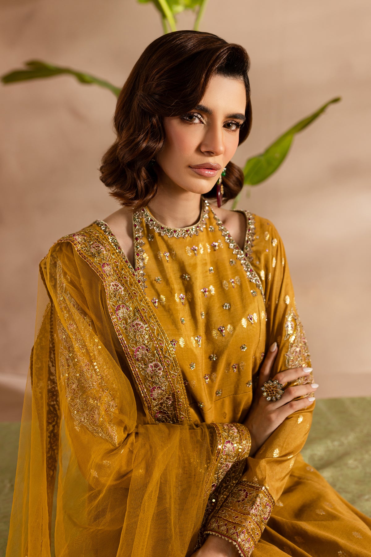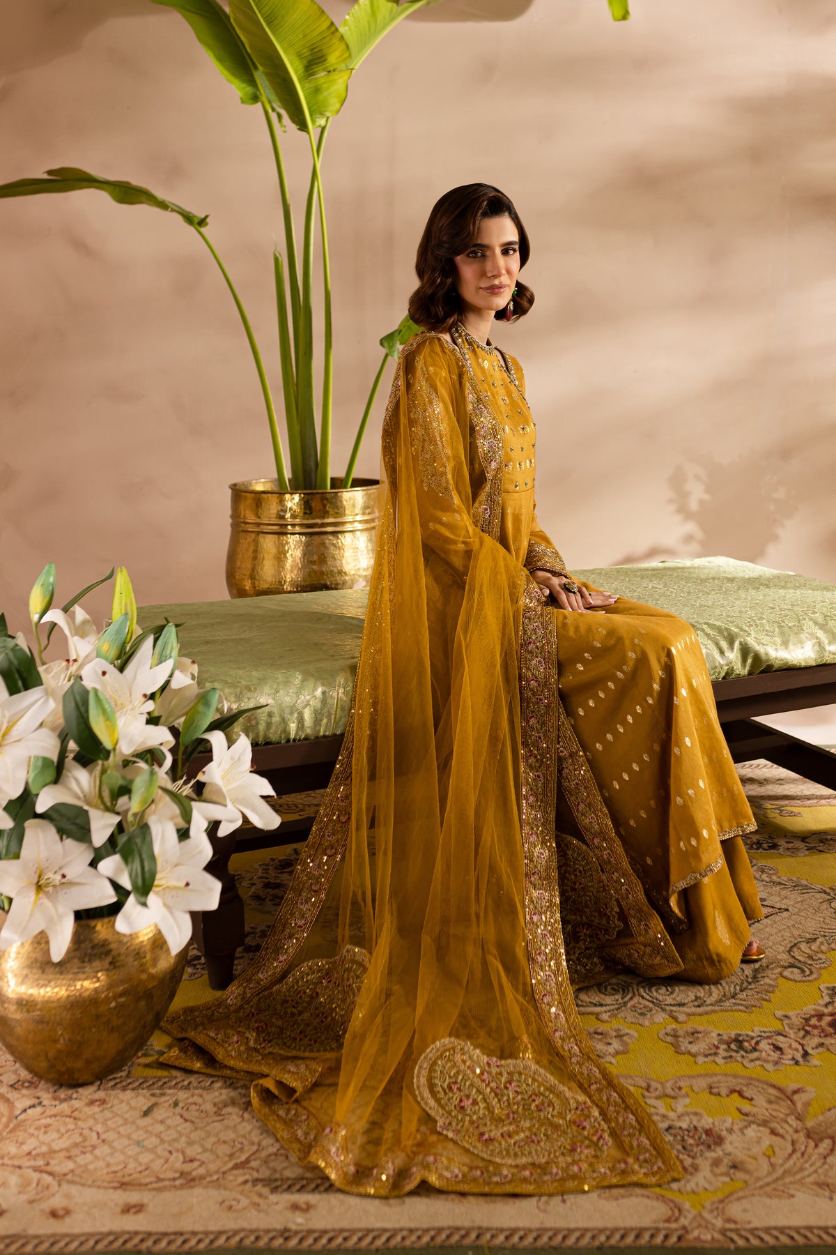 In a vibrant mustard color, the outfit exudes a joyous elegance. The lawn zari shirt is tailored in a paneled style with a yoke, accentuated by adda work on the neckline, lending a rich design detail. Regular side slits bring a traditional touch with a border at the hem and along the side slits adding structure and detail.