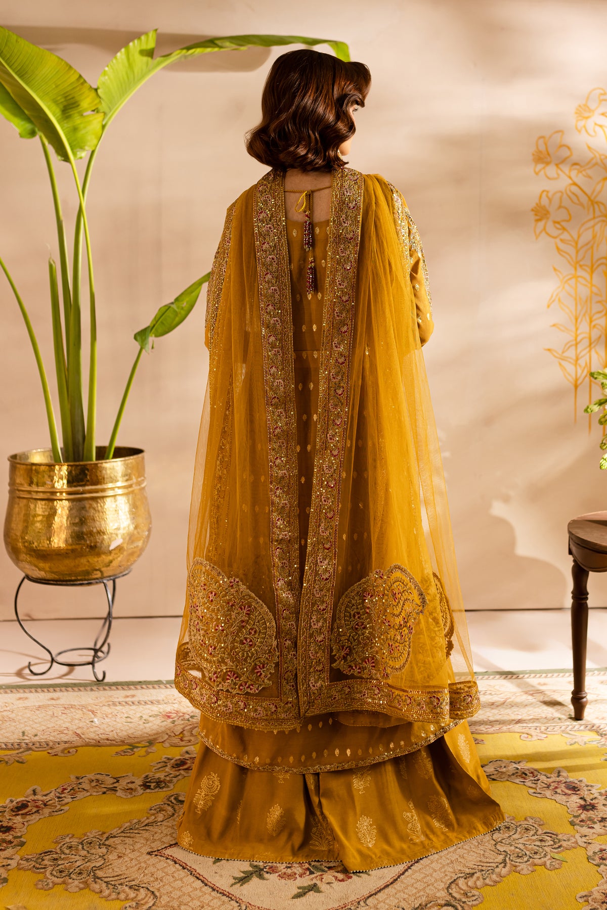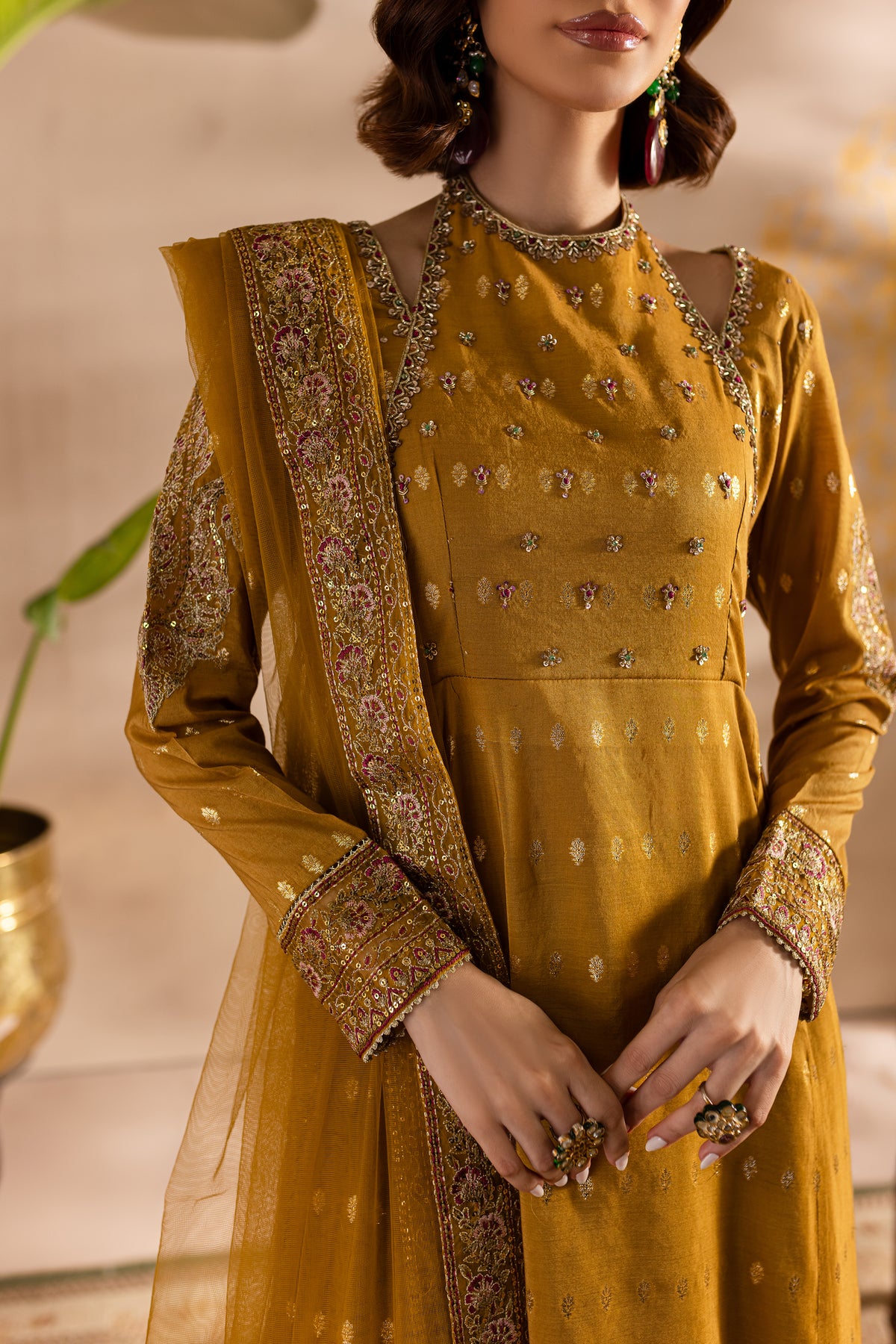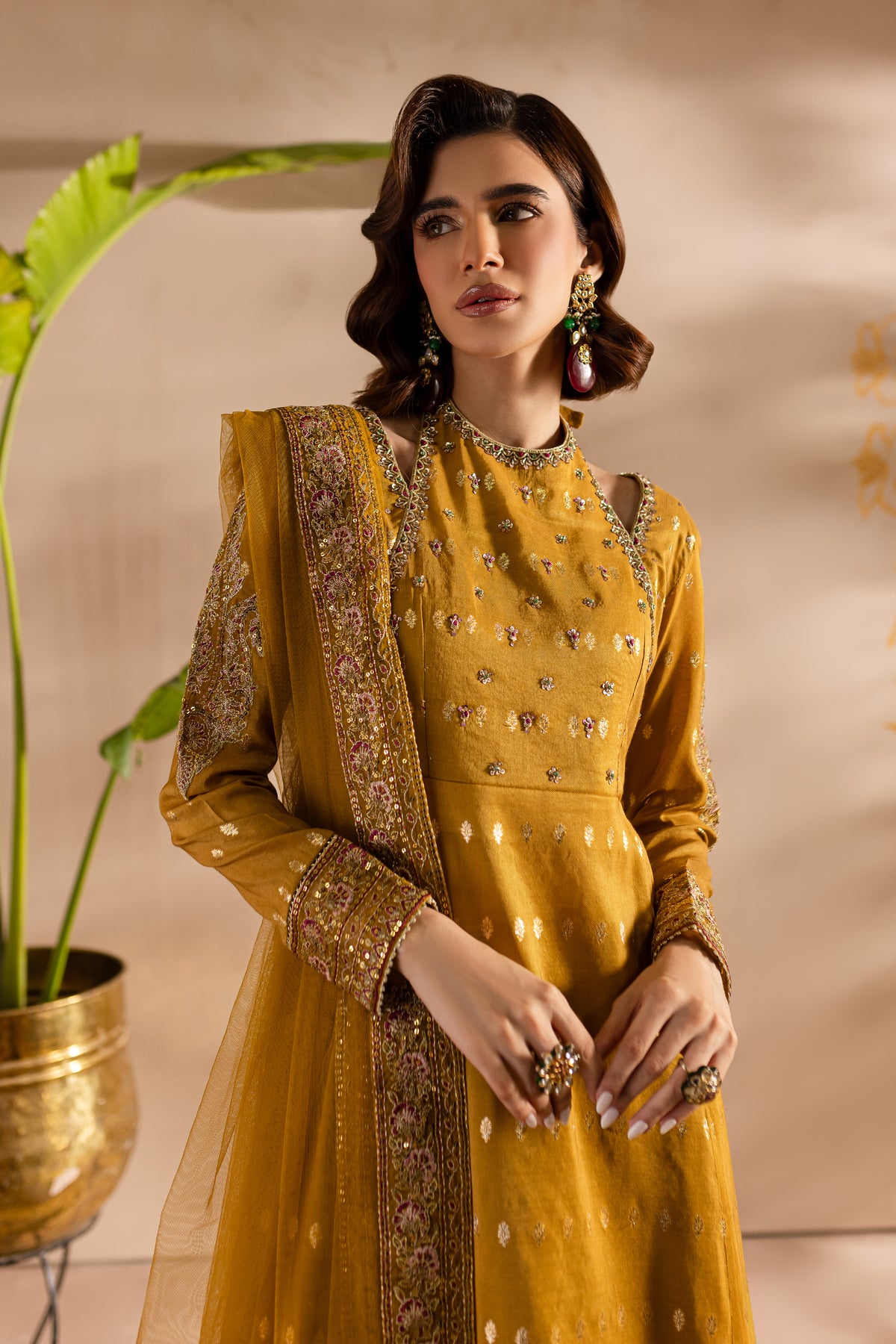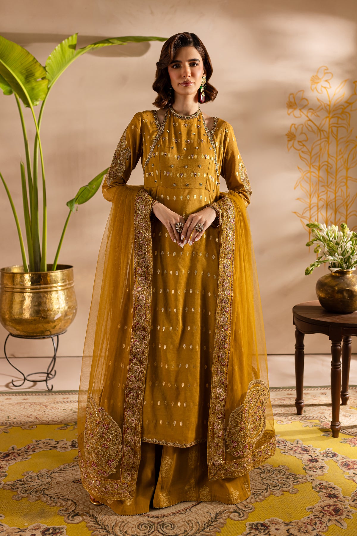 In a vibrant mustard color, the outfit exudes a joyous elegance. The lawn zari shirt is tailored in a paneled style with a yoke, accentuated by adda work on the neckline, lending a rich design detail. Regular side slits bring a traditional touch with a border at the hem and along the side slits adding structure and detail.