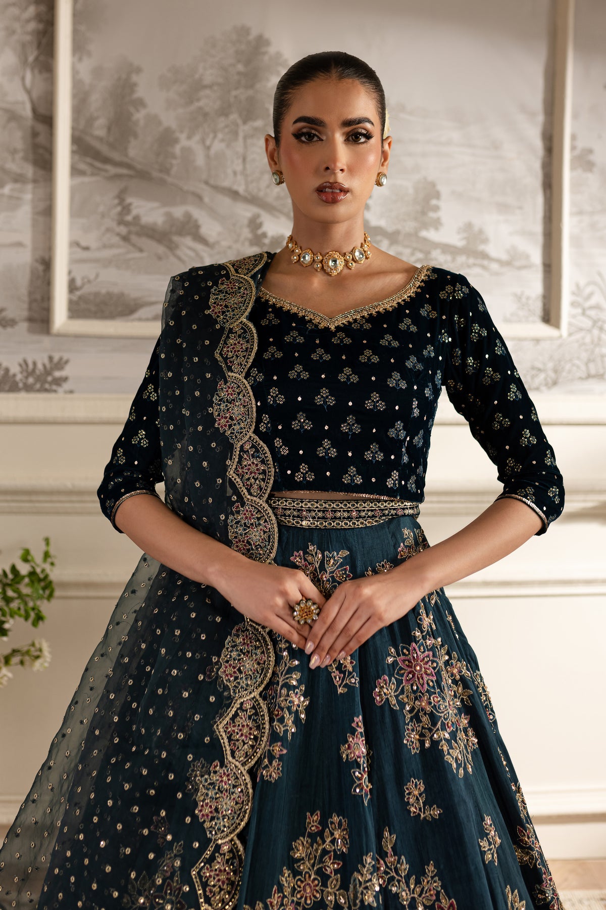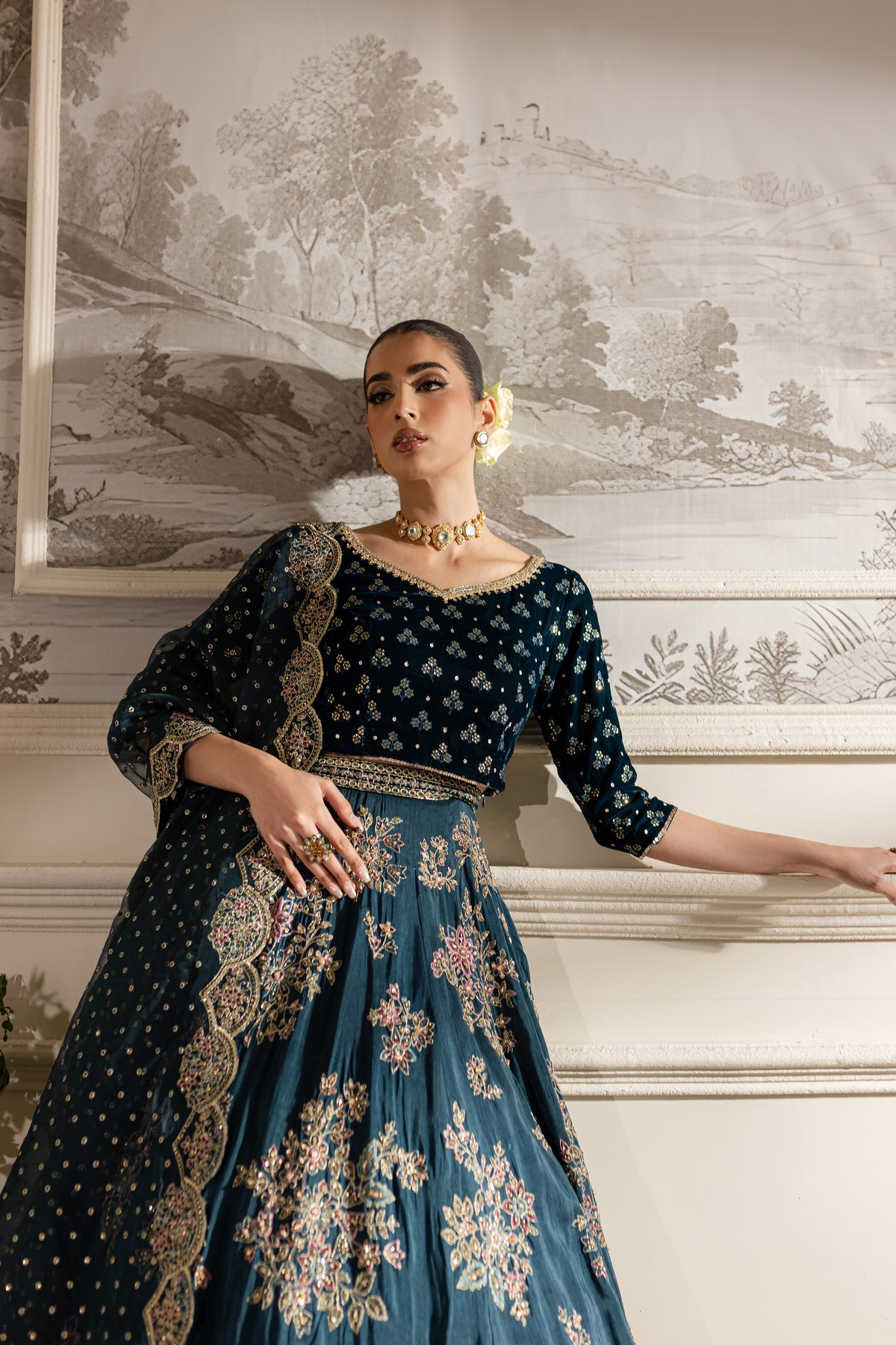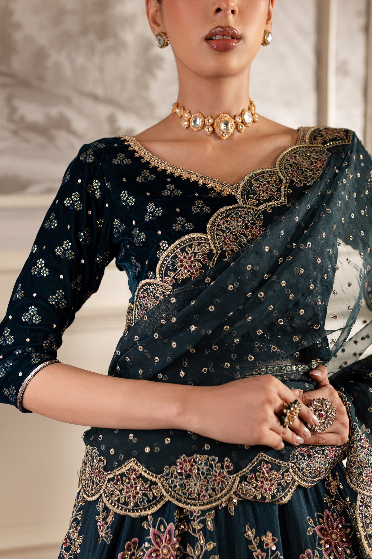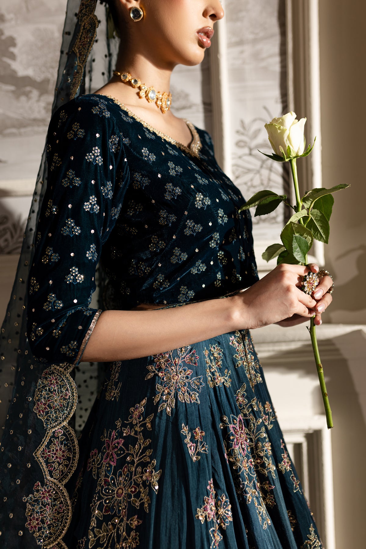This Teal 3-piece ensemble is the perfect fusion of luxury and timeless craftsmanship. The embroidered Velvet Choli is a standout piece, featuring intricate Adda work on the neckline, sleeves, and front, adding a touch of regal beauty. The keyhole back neckline adds a modern twist, creating a stunning contrast with the traditional embroidery and enhancing the overall design.