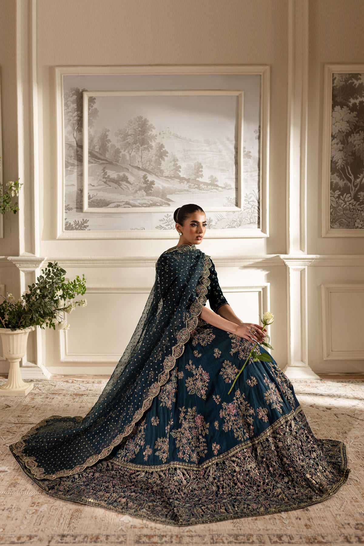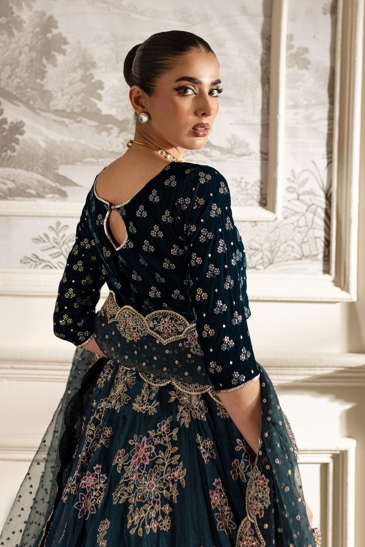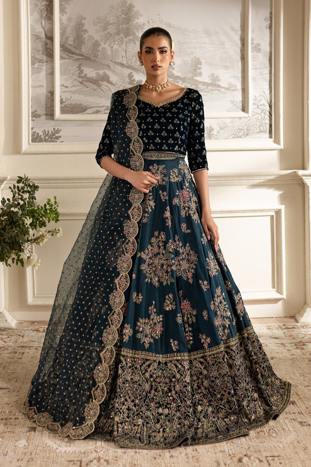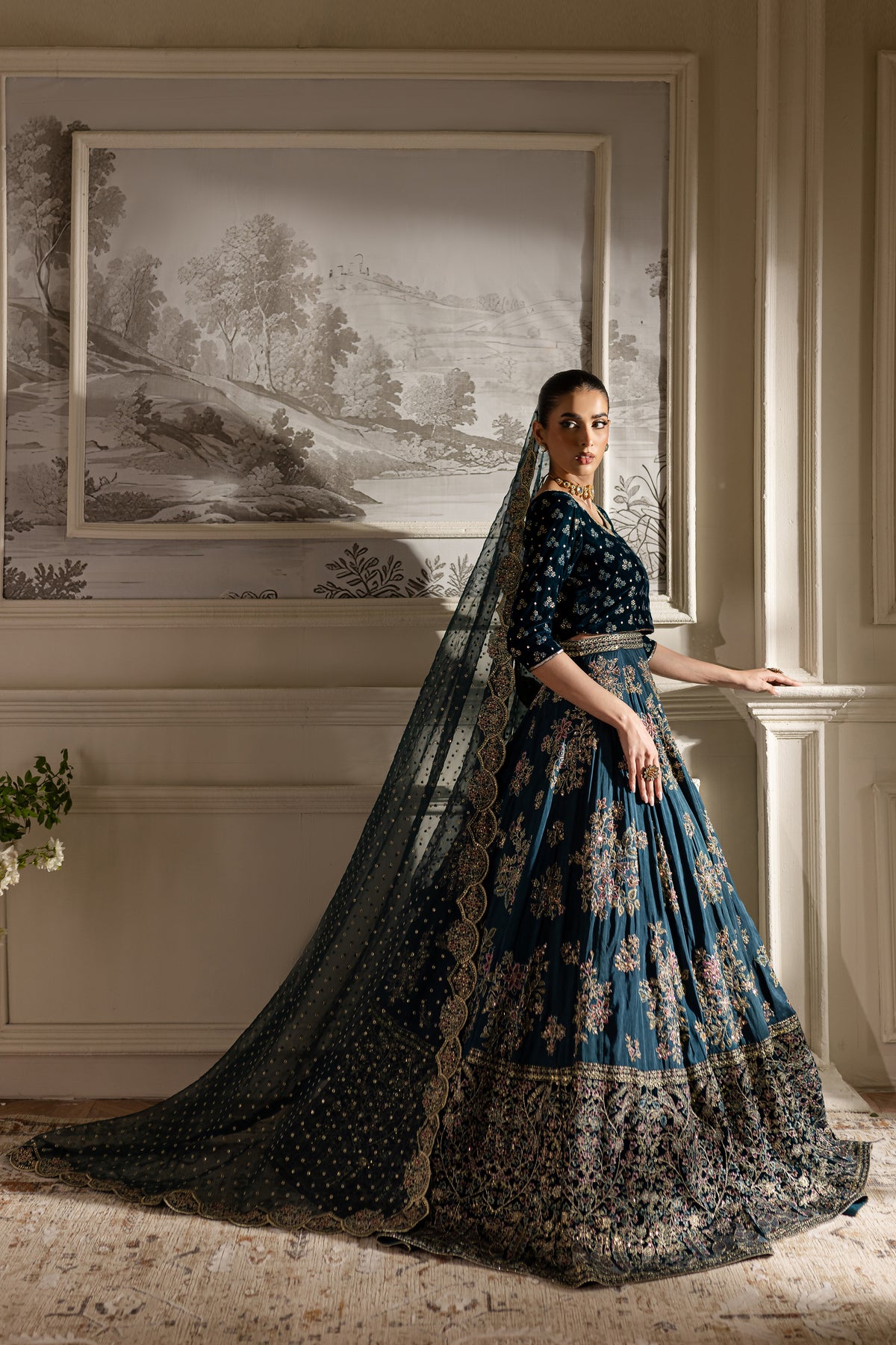 This Teal 3-piece ensemble is the perfect fusion of luxury and timeless craftsmanship. The embroidered Velvet Choli is a standout piece, featuring intricate Adda work on the neckline, sleeves, and front, adding a touch of regal beauty. The keyhole back neckline adds a modern twist, creating a stunning contrast with the traditional embroidery and enhancing the overall design.