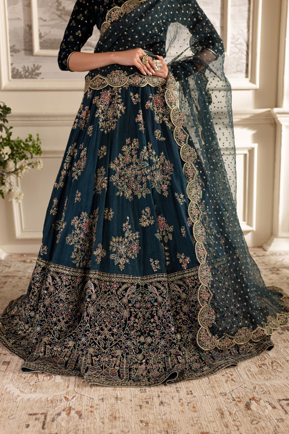 The ensemble is paired with a heavy Raw Silk Lehenga, a luxurious piece that drapes beautifully. The lehenga is adorned with an intricately embroidered velvet border at the hem, featuring delicate floral patterns that are further enhanced with hand embellishments, creating a beautifully composed design. The floral motifs add texture and depth, making this lehenga a true masterpiece of craftsmanship.