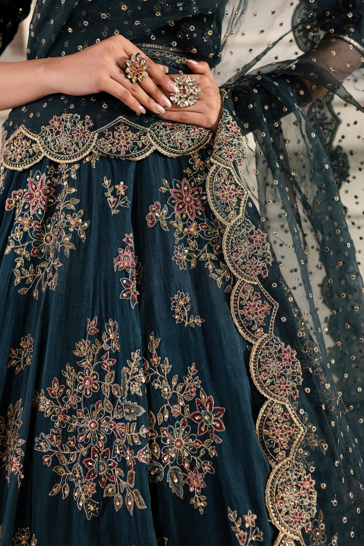 To finish the look, the ensemble is paired with a soft and ethereal Organza Dupatta, featuring a floral scalloped border on all four sides. The dupatta is further enhanced with an all-over sequin spread, adding a subtle yet captivating shimmer that elevates the entire outfit.