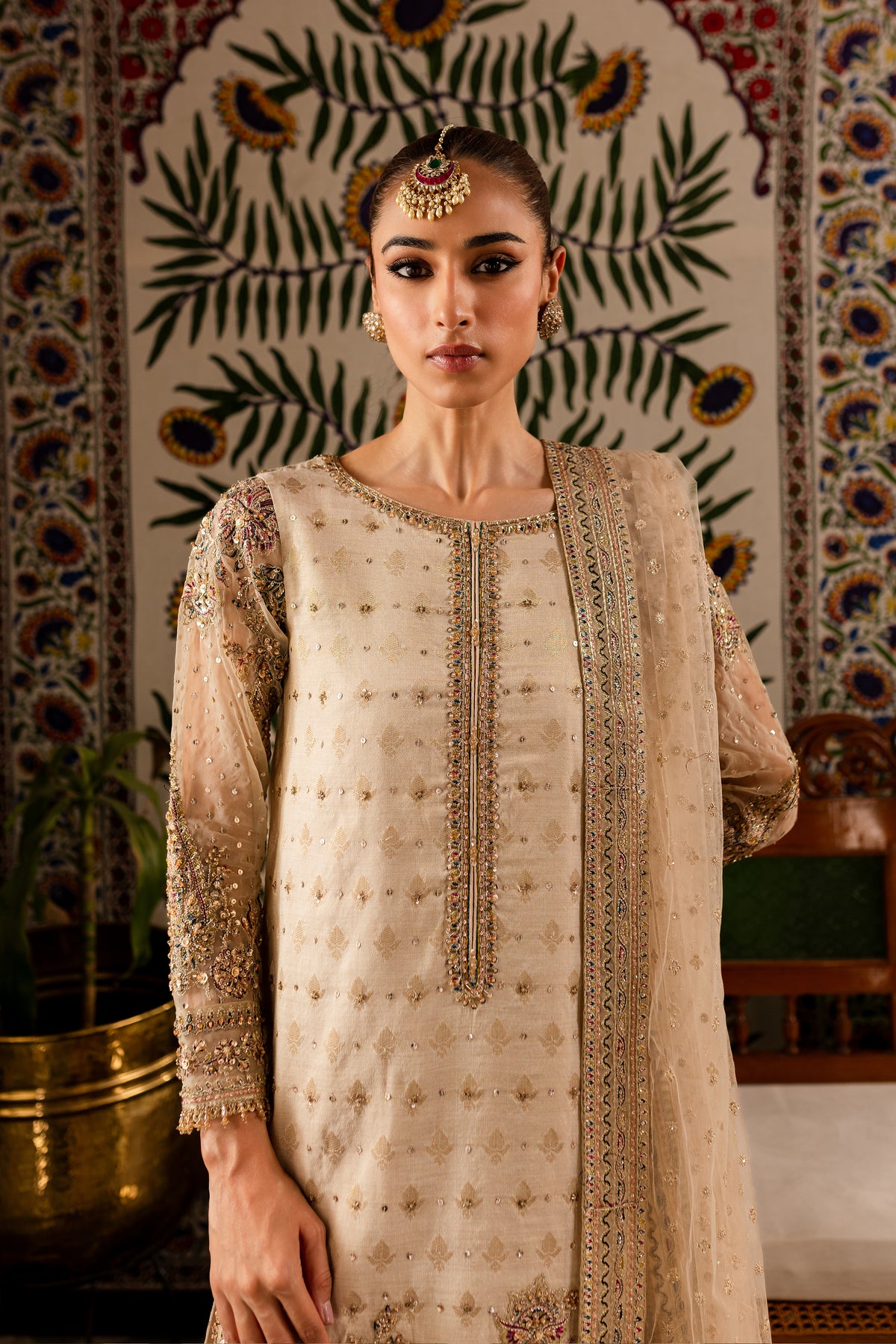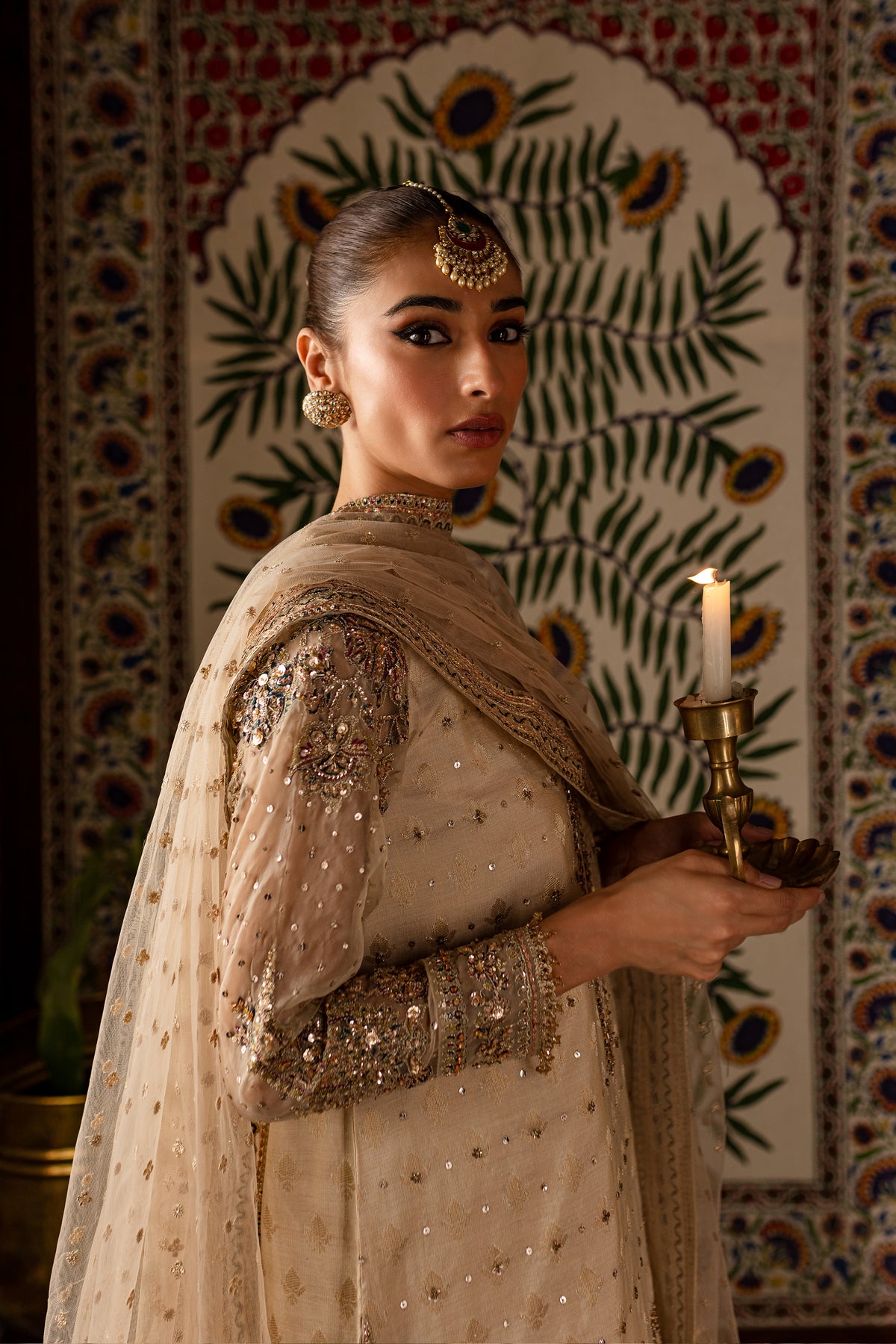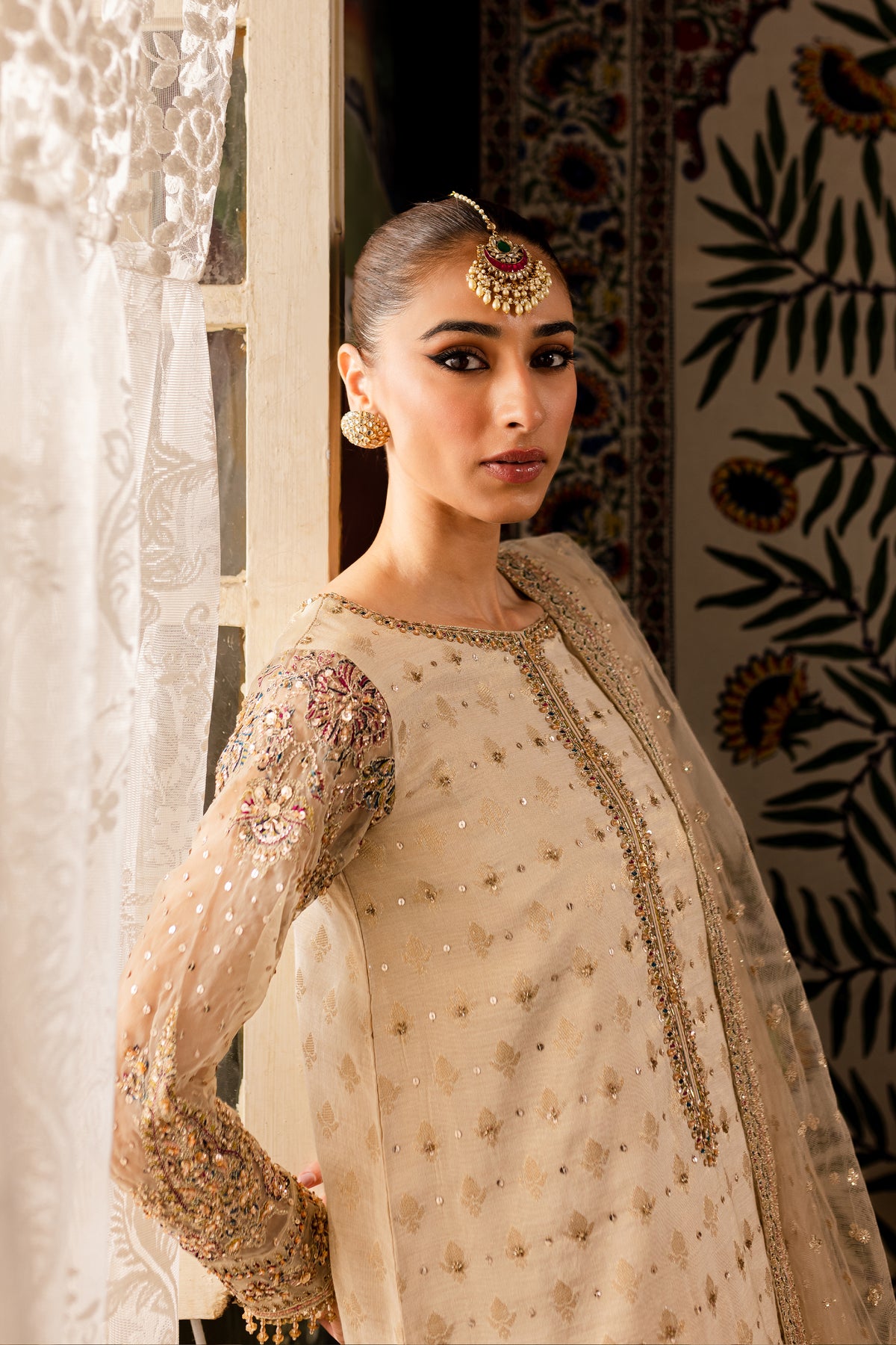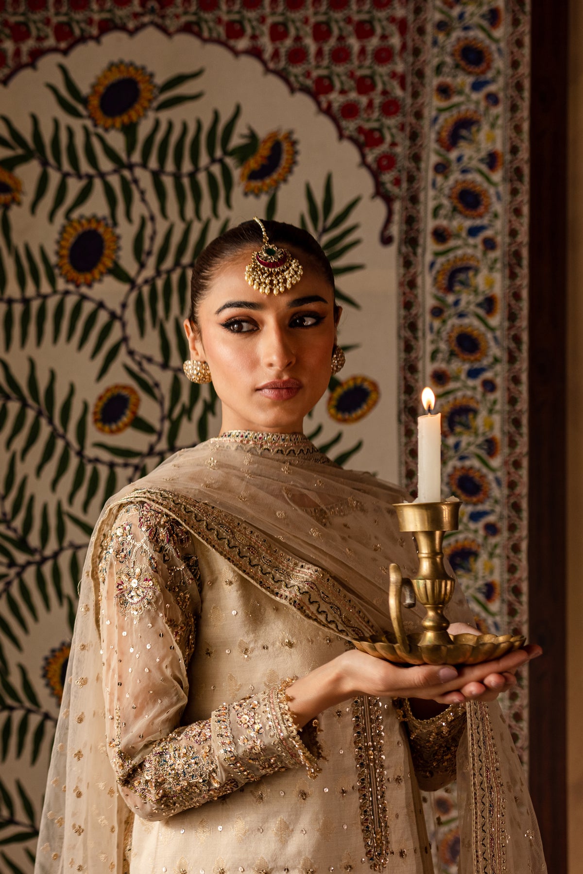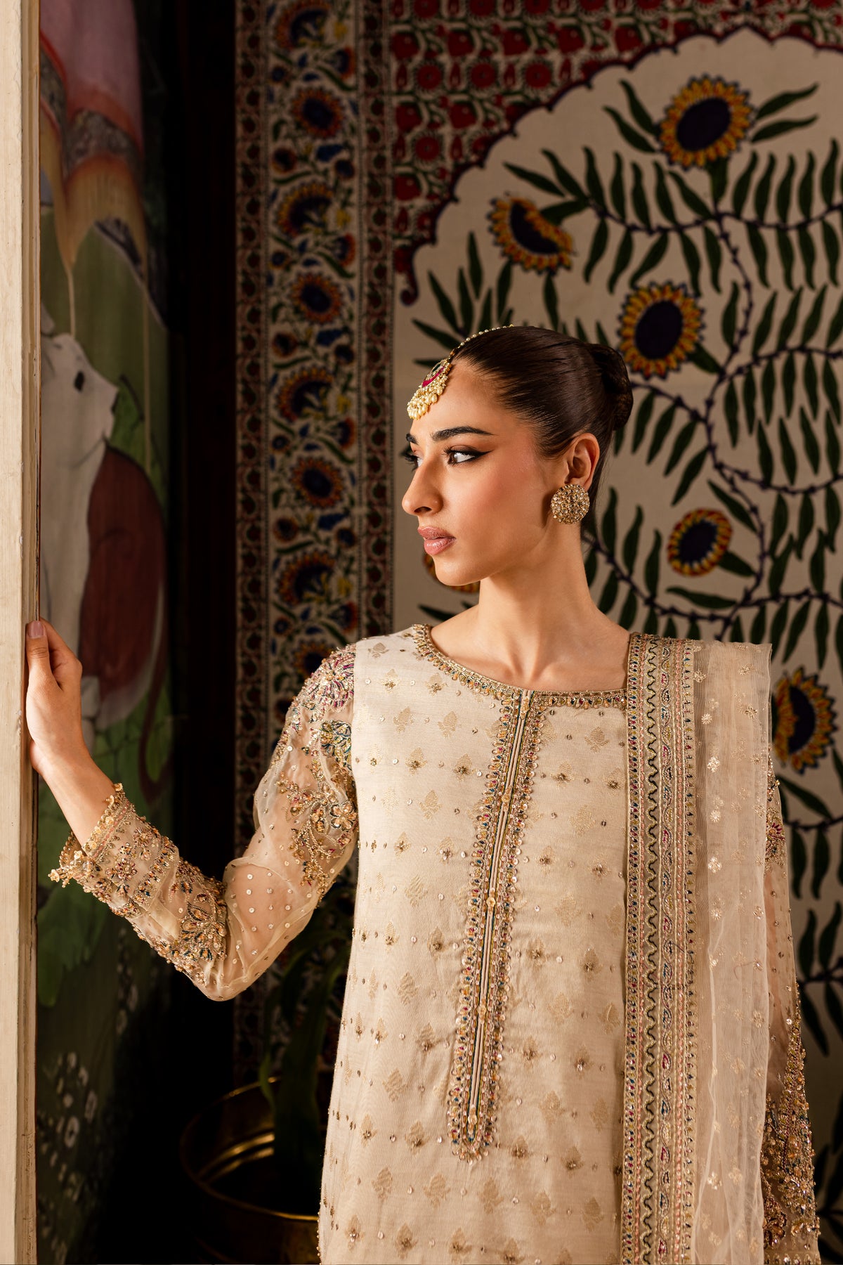Artfully designed shirt presents a delightful display of masoori jacquard in the shades of off white. Striking details withhold a heavily embroidered hem and a delightful display of direct adda at neckline. To enhance the creation, organza sleeves are added featuring heavy embroidery and sequin spray – touched up with border detail and hangings at hem.
