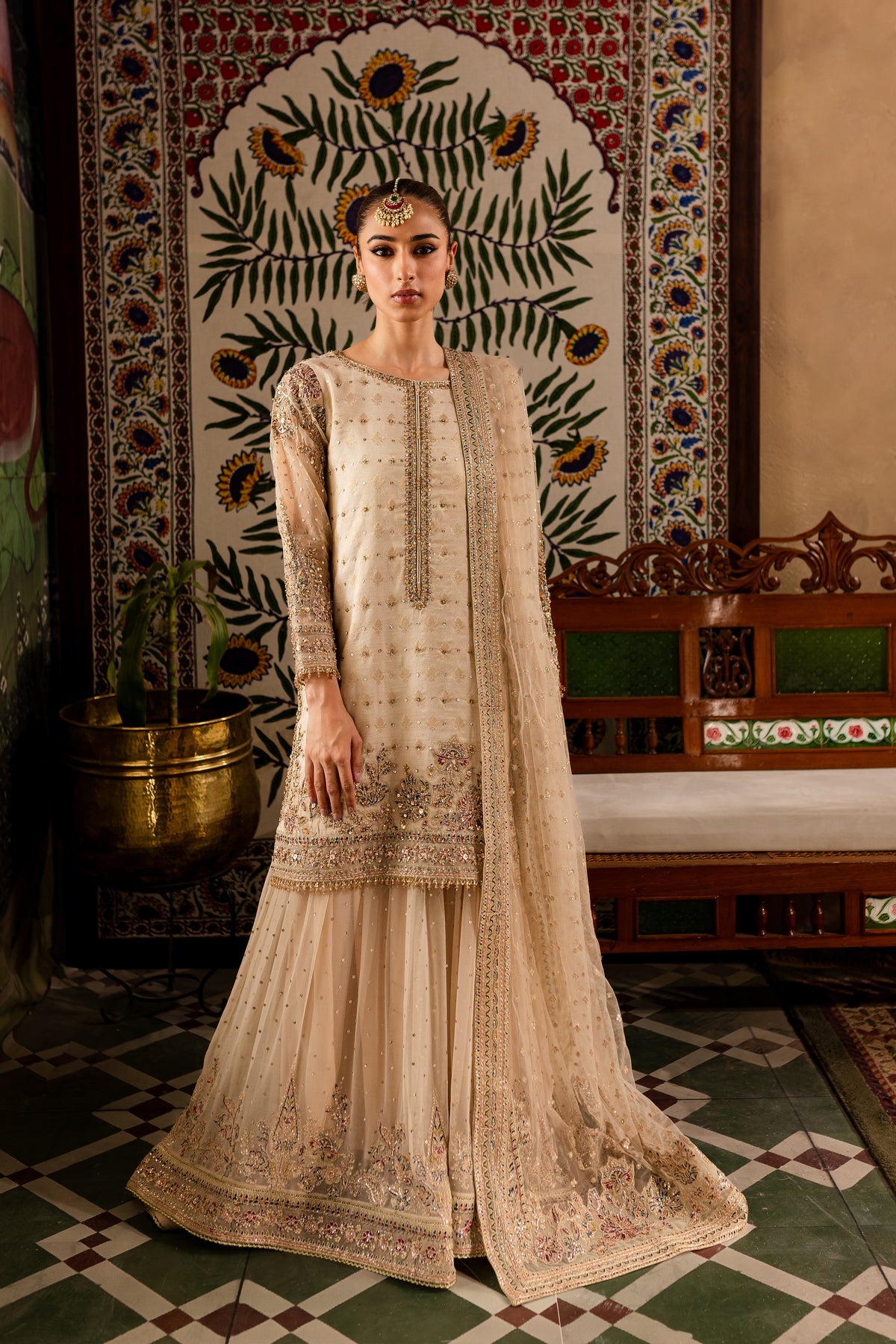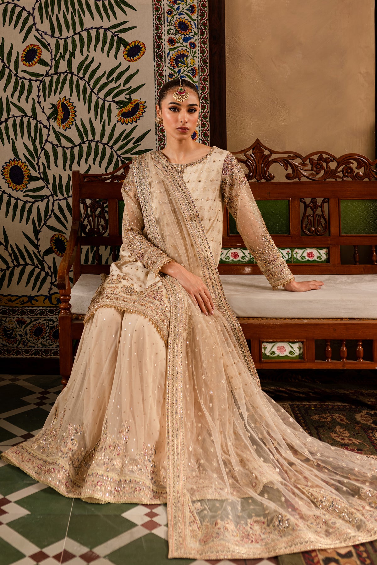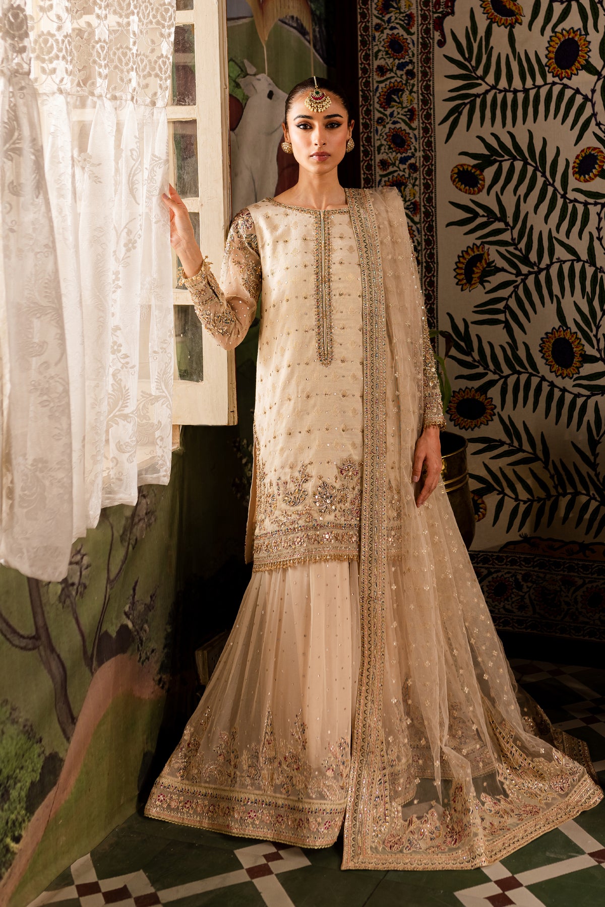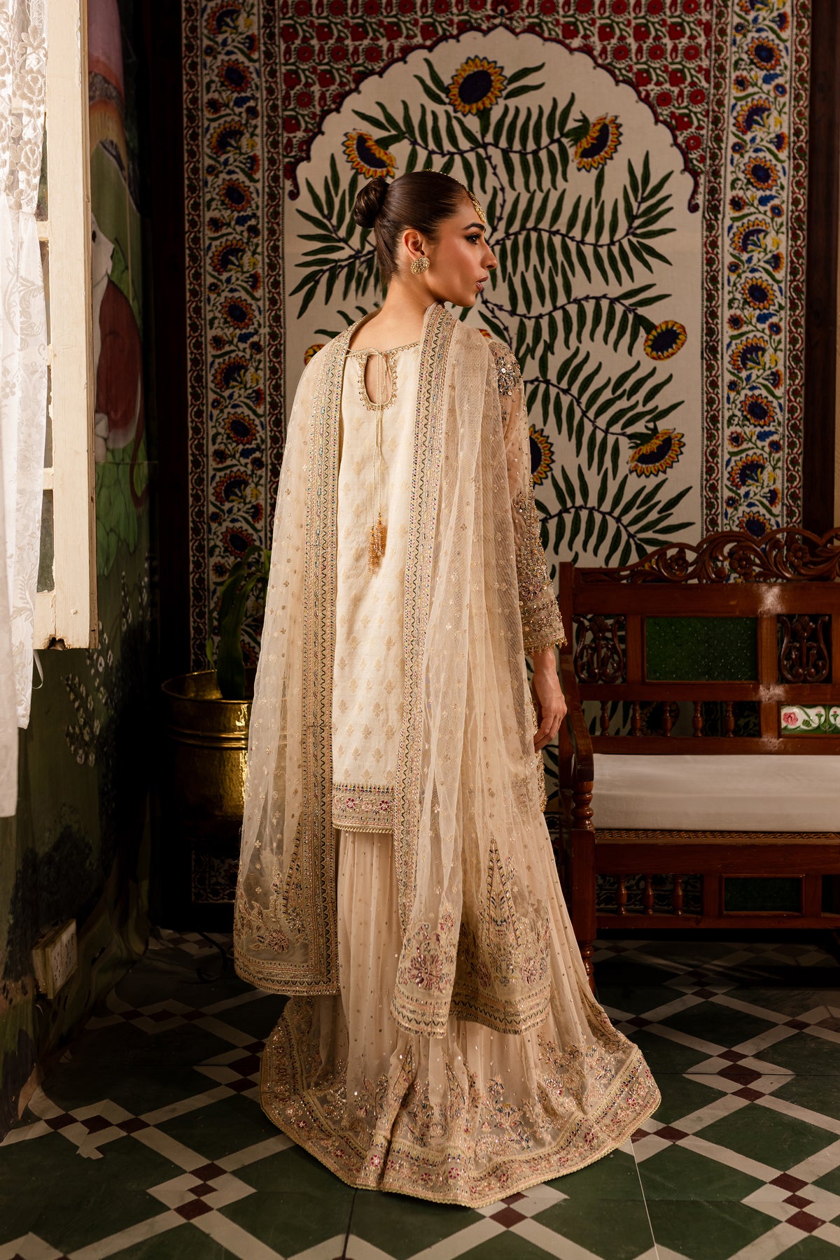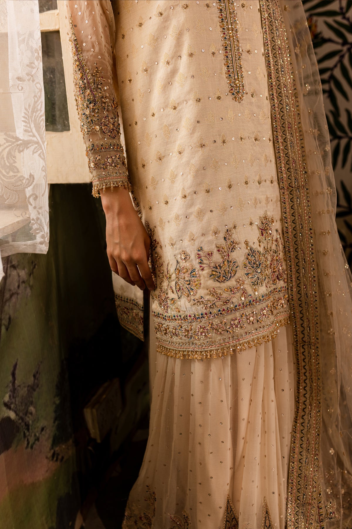 Artfully designed shirt presents a delightful display of masoori jacquard in the shades of off white. Striking details withhold a heavily embroidered hem and a delightful display of direct adda at neckline. To enhance the creation, organza sleeves are added featuring heavy embroidery and sequin spray – touched up with border detail and hangings at hem.
