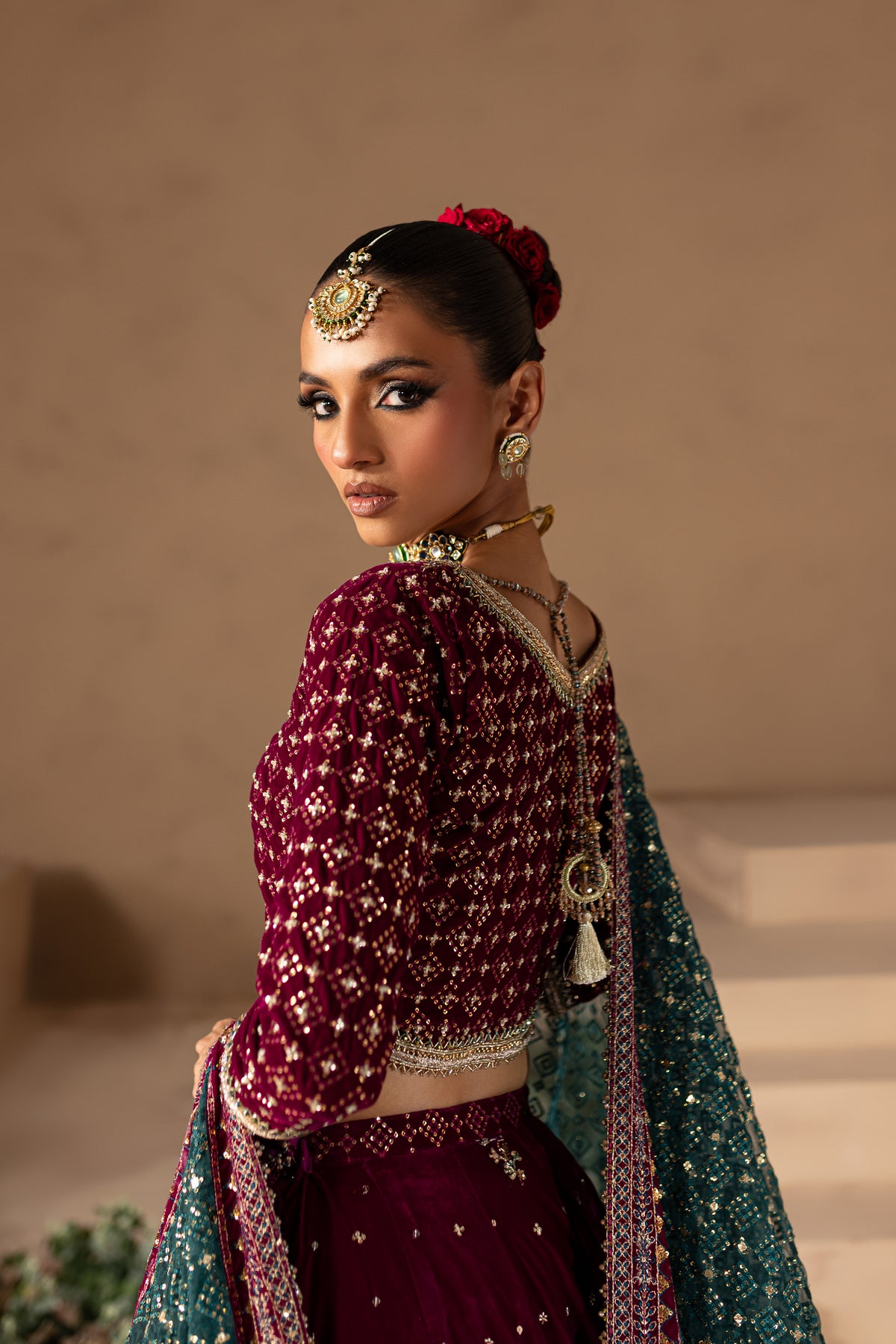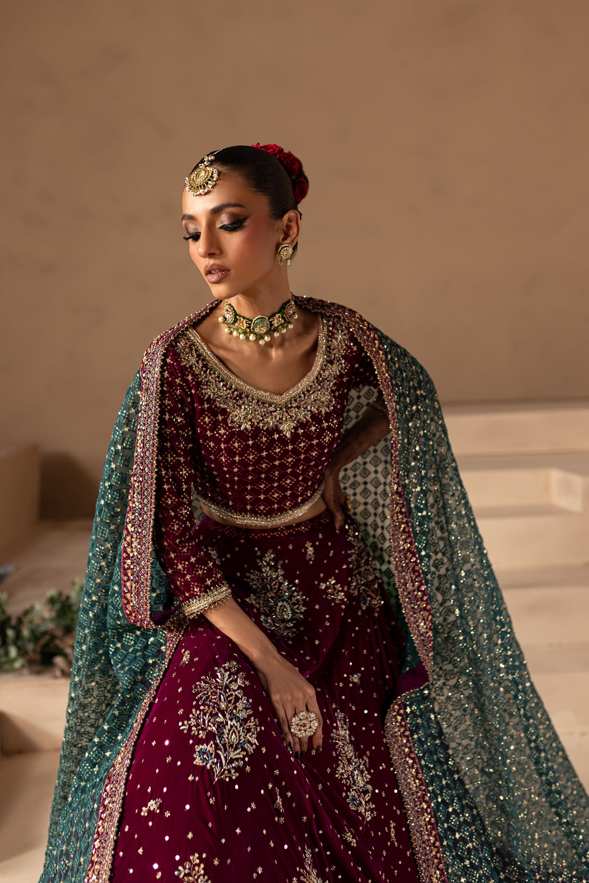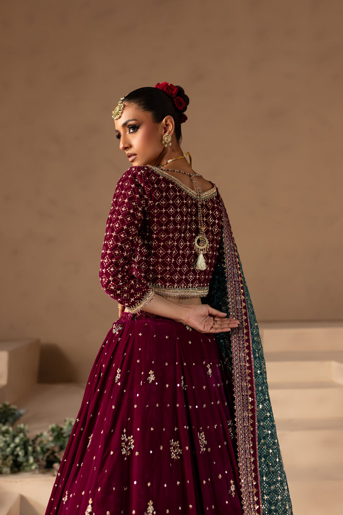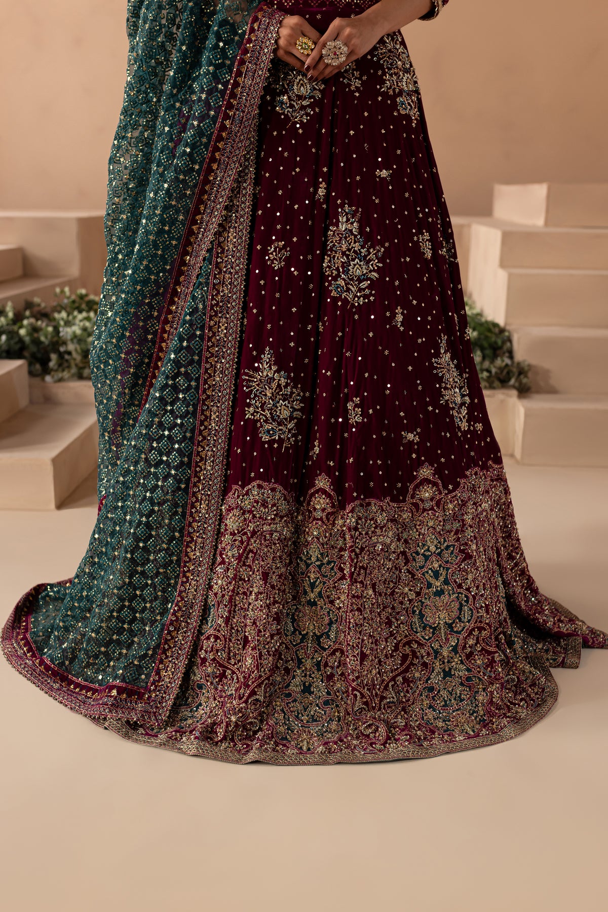 Paired with a widely flared velvet lehnga displaying intricate handwork and sitara spread on panels. Elevated with a heavily embroidered border incorporating embroidered raw silk patching in teal color. Front and back panels feature finely hand worked motifs. Striking material details withhold a blend of mukesh, resham, dabka, naqshi, pearls, crystals, and more. A minimal border is added for finishing touched up with teal. It comes with an attached can can.